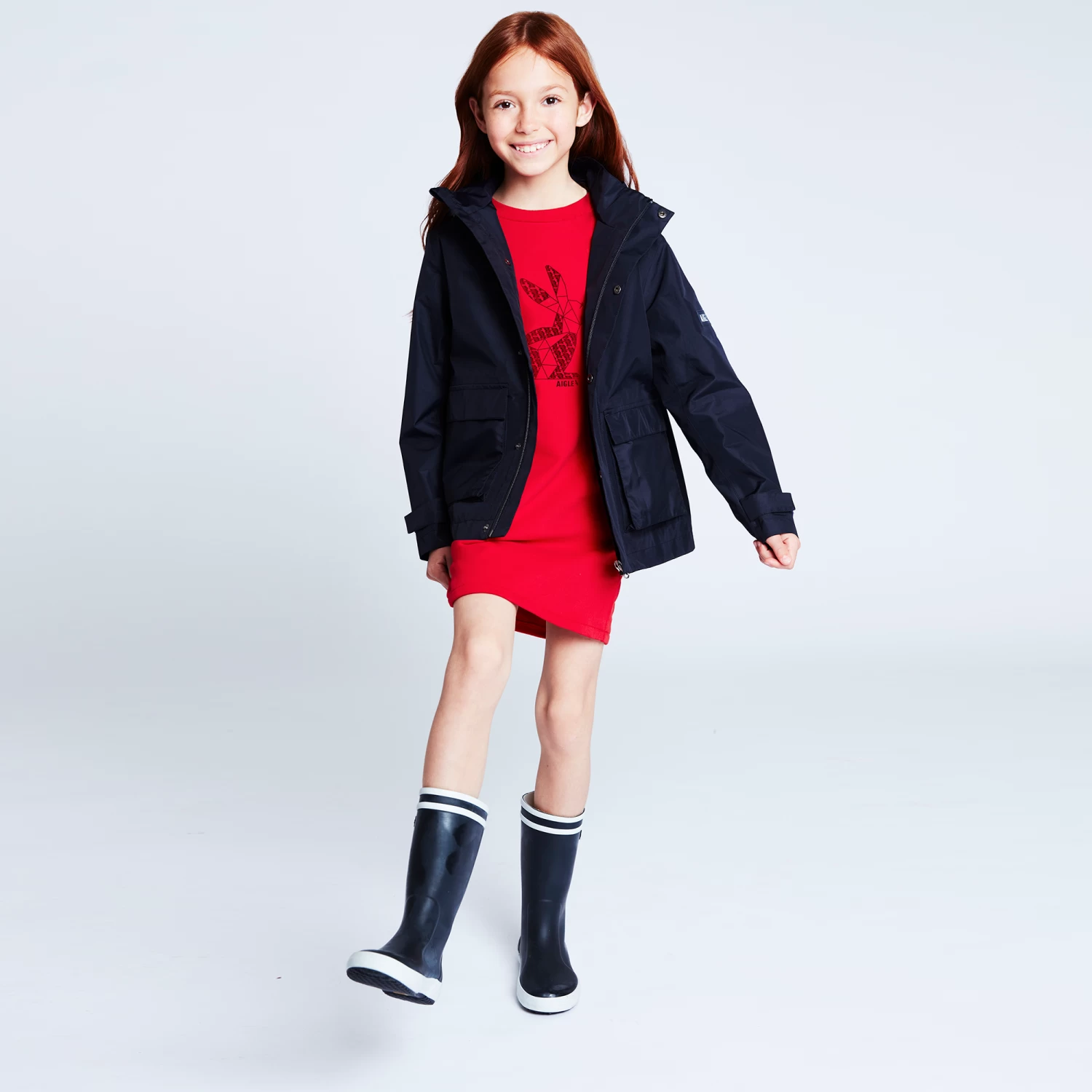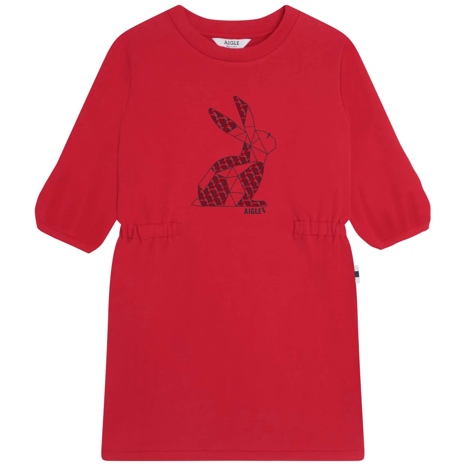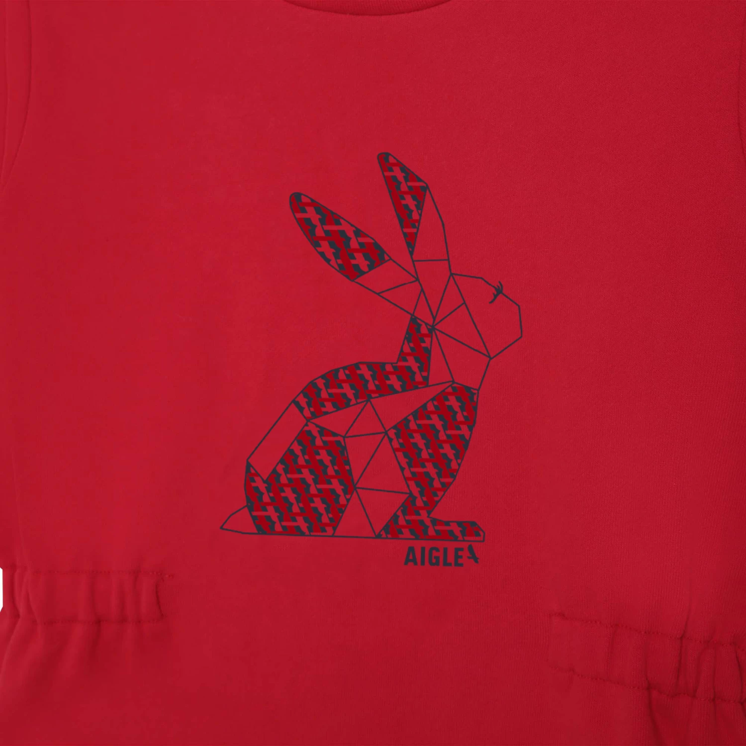 La nouvelle collection Aigle mise sur les coupes droites intemporelles. La preuve : cette robe confectionnée en coton majoritaire issu de l’agriculture biologique. Le lapin imprimé en motifs géométriques en fait une pièce très moderne. Le petit plus ? Les élastiques à la taille.