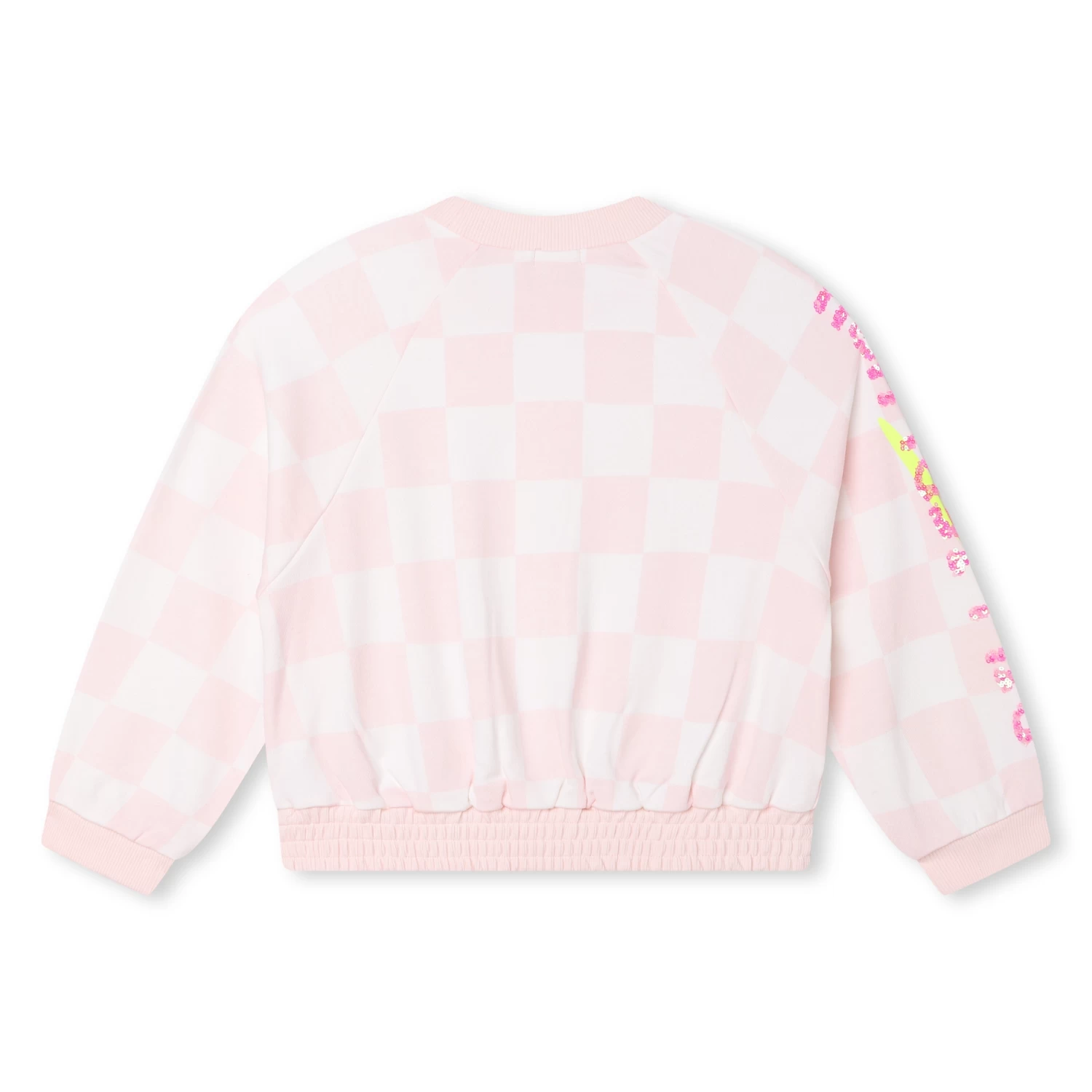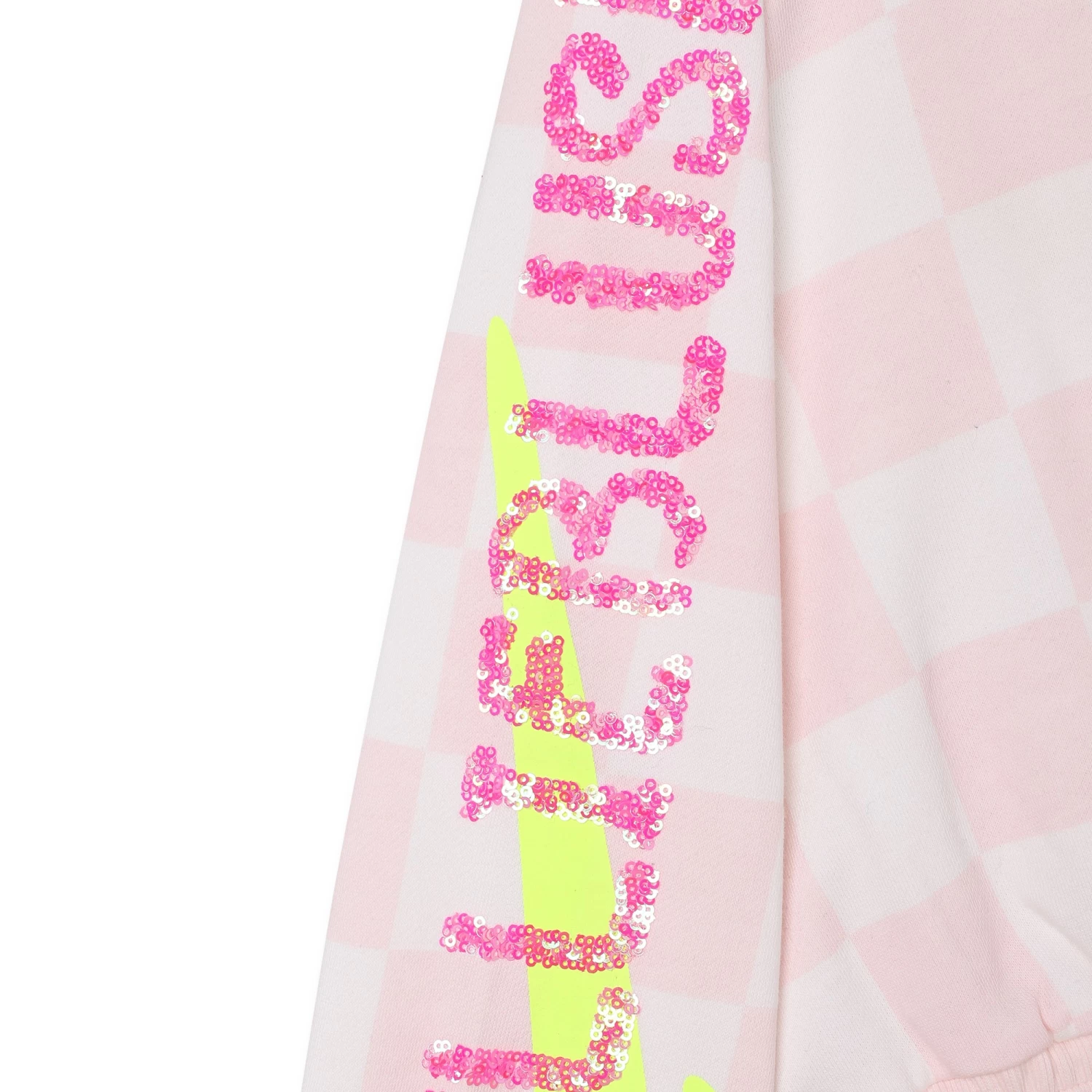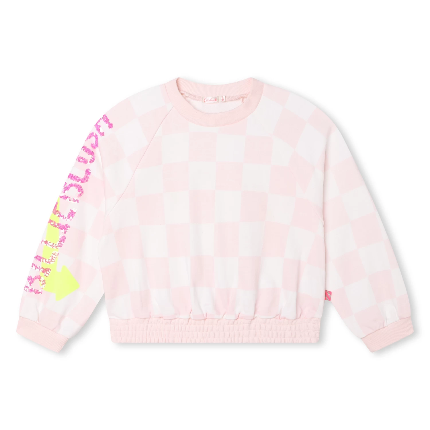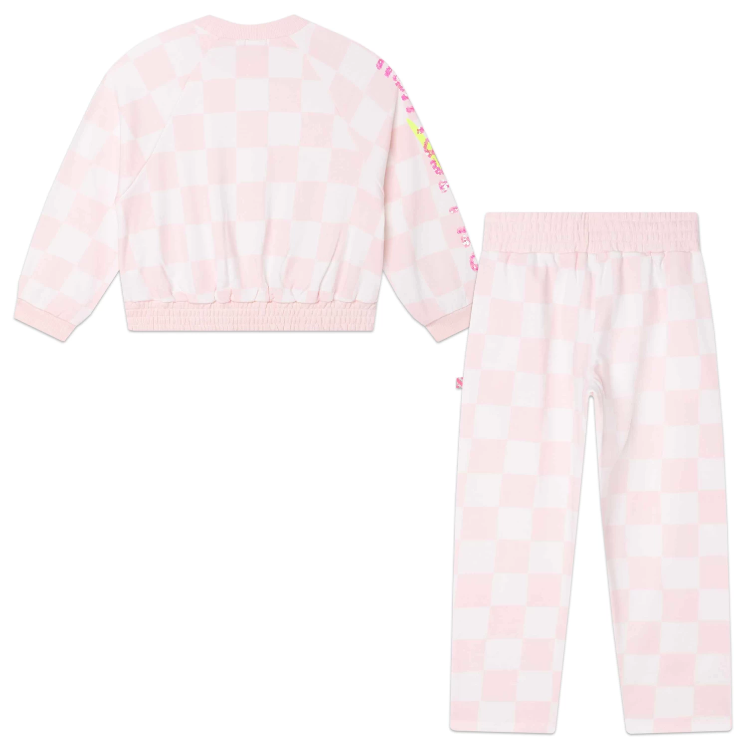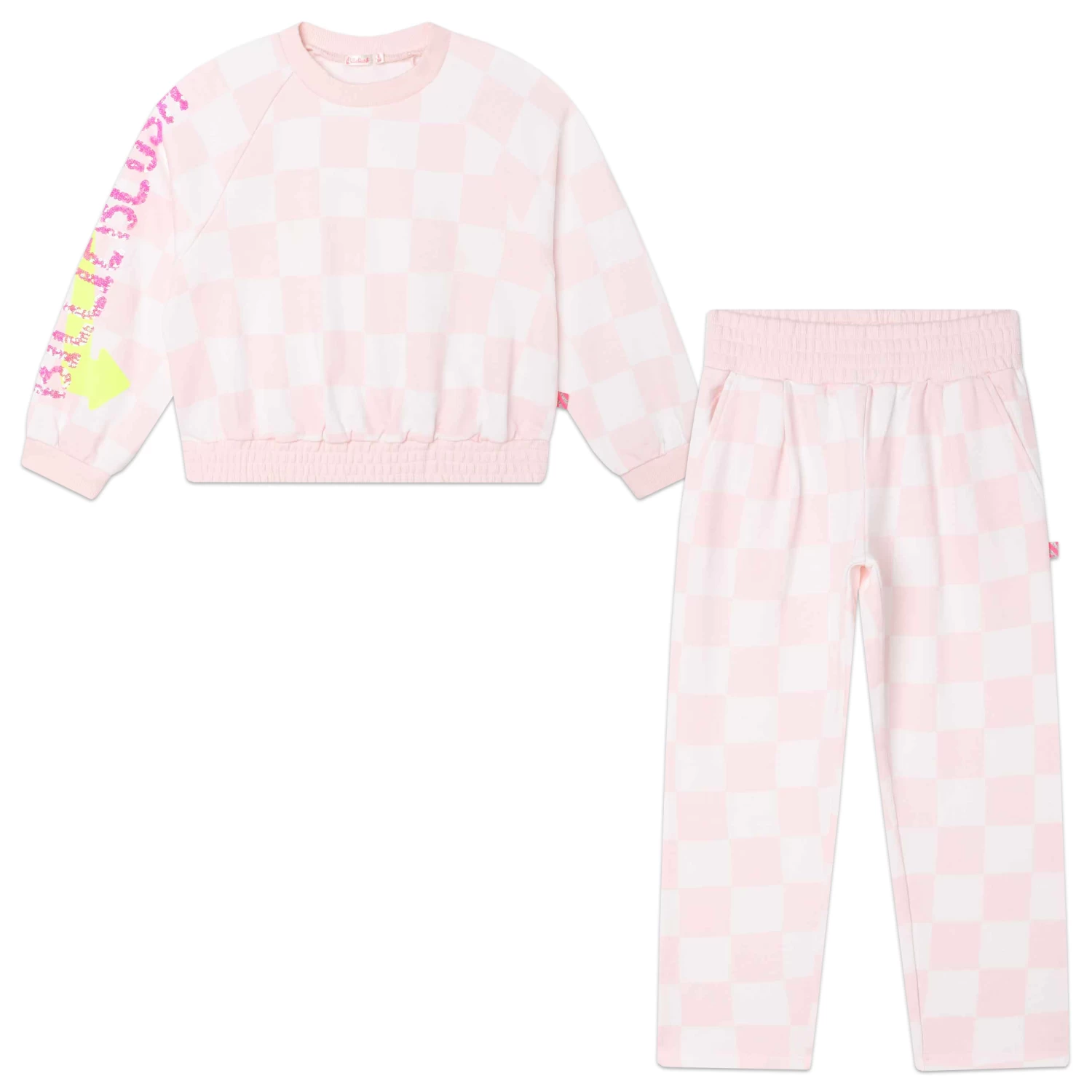 Cet ensemble de jogging Billieblush présente une confection en coton et élasthanne avec un imprimé « damiers ». Il est composé d’un sweat-shirt avec un bord-côte à l’encolure, aux poignets et dans le bas, ainsi que d’un pantalon à taille élastiquée avec deux poches.