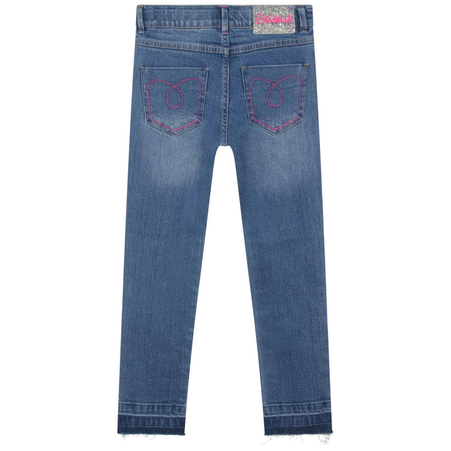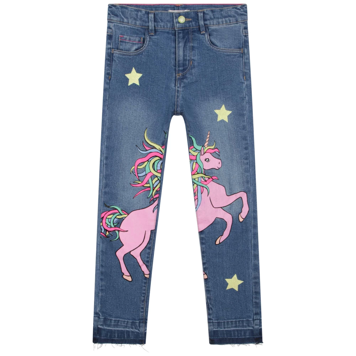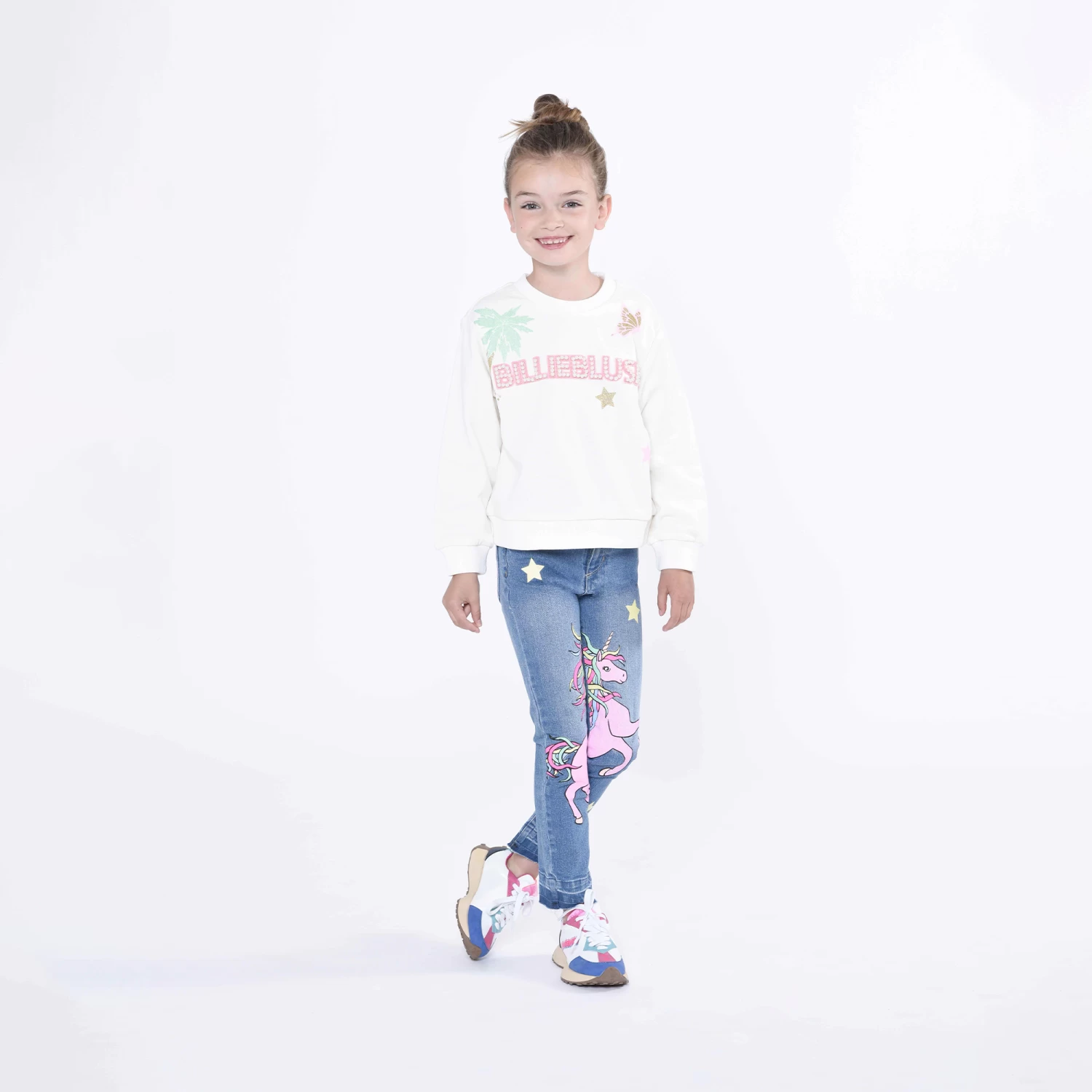 Les petites filles vont adorer ce jean Billieblush à motif licorne. Ce modèle dispose d’une taille ajustable, de cinq poches, d’une fermeture zippée et d’un jacron en silicone pailleté dans le dos. Des franges ornent le bas des jambes.