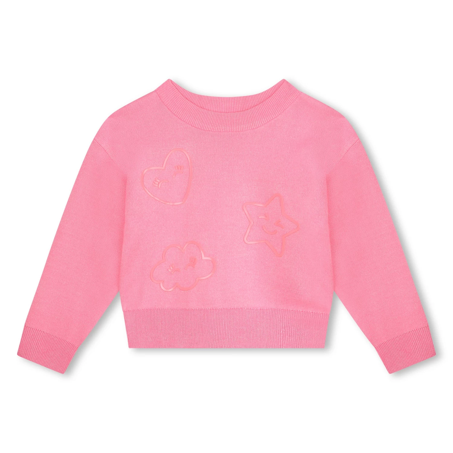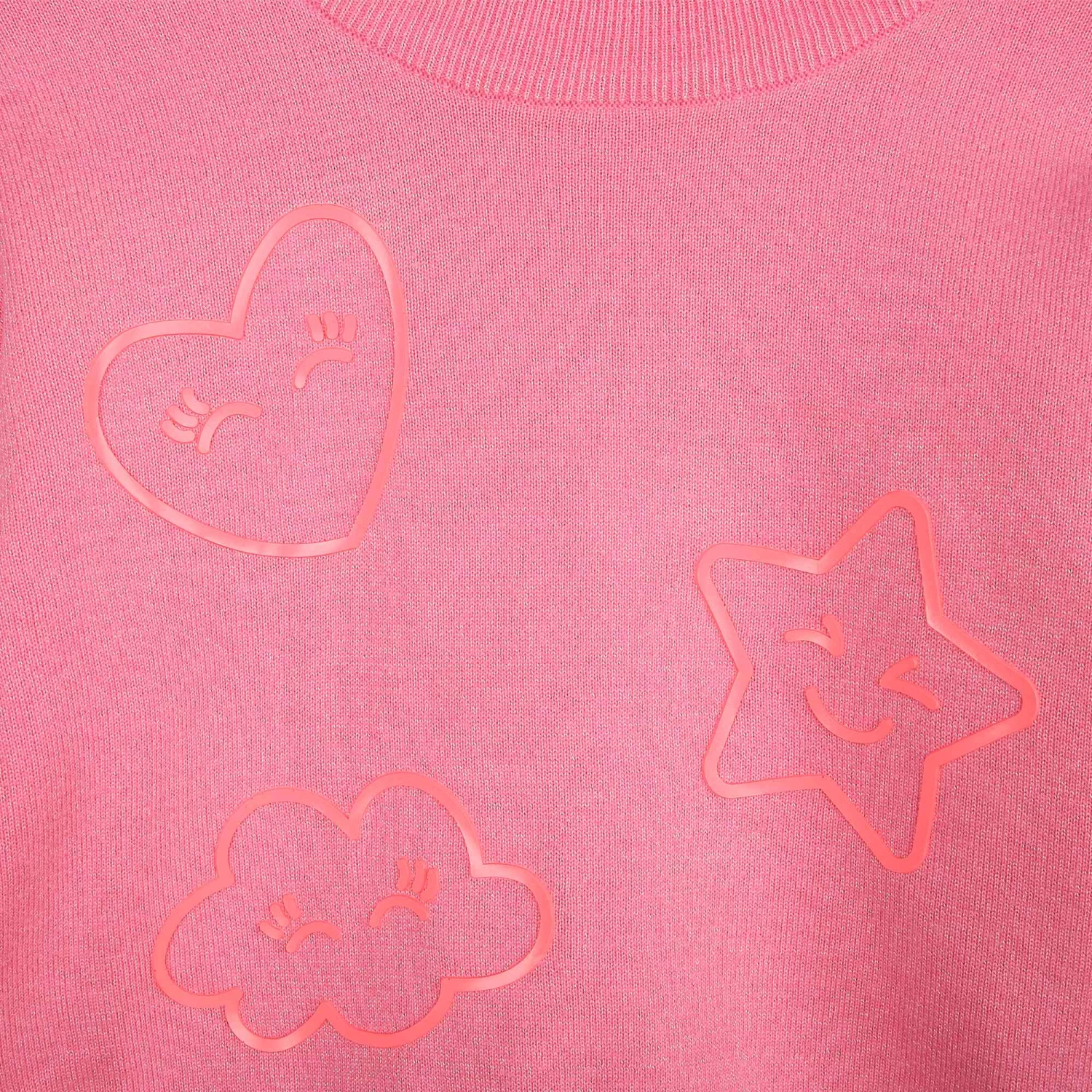 Ce pull pour fille Billieblush en tricot brillant est confectionné dans un mélange de coton et de viscose. Sur le devant se trouvent une étoile, un nuage et un coeur aux visages malicieux. Un bord-côte souligne l’encolure, les poignets et le bas.