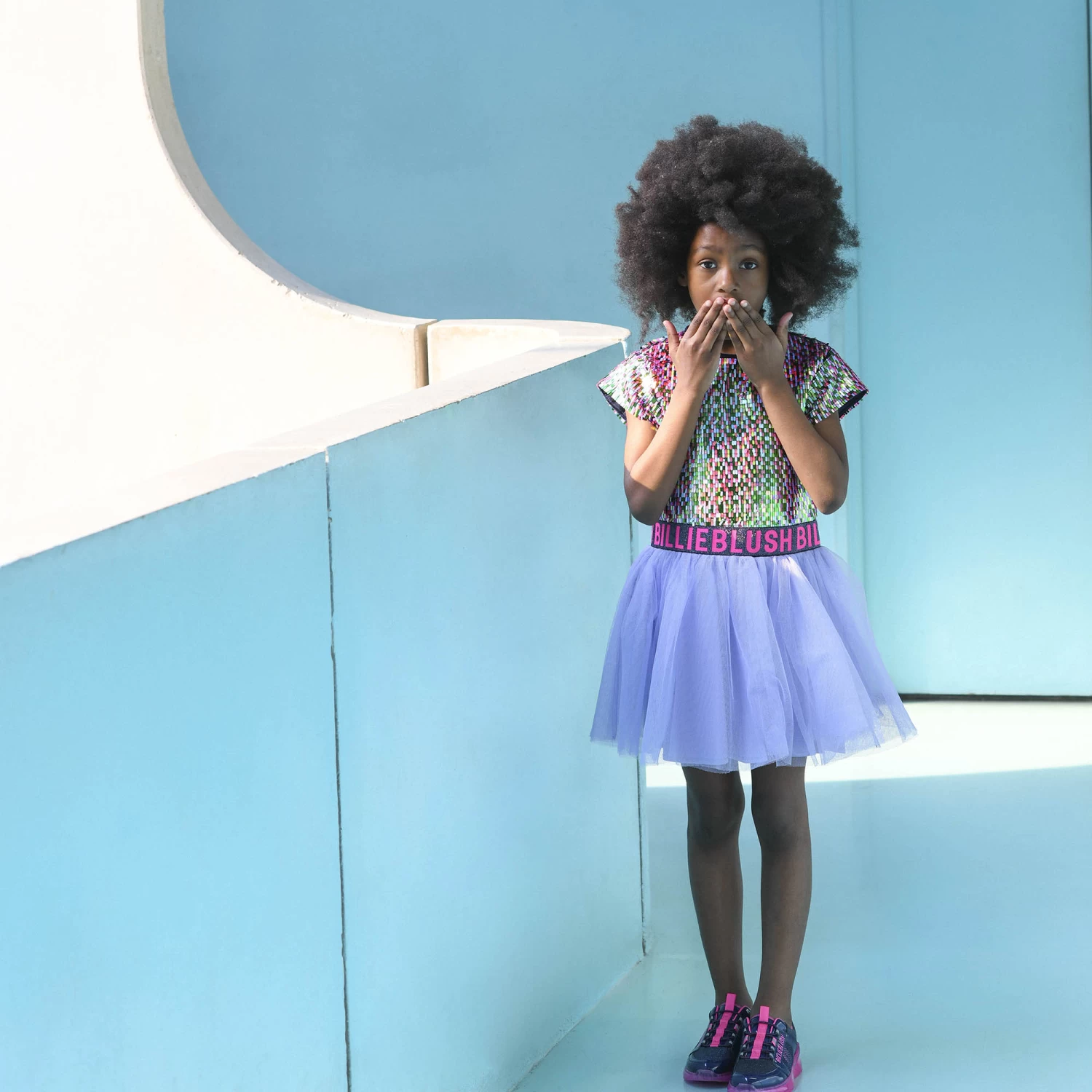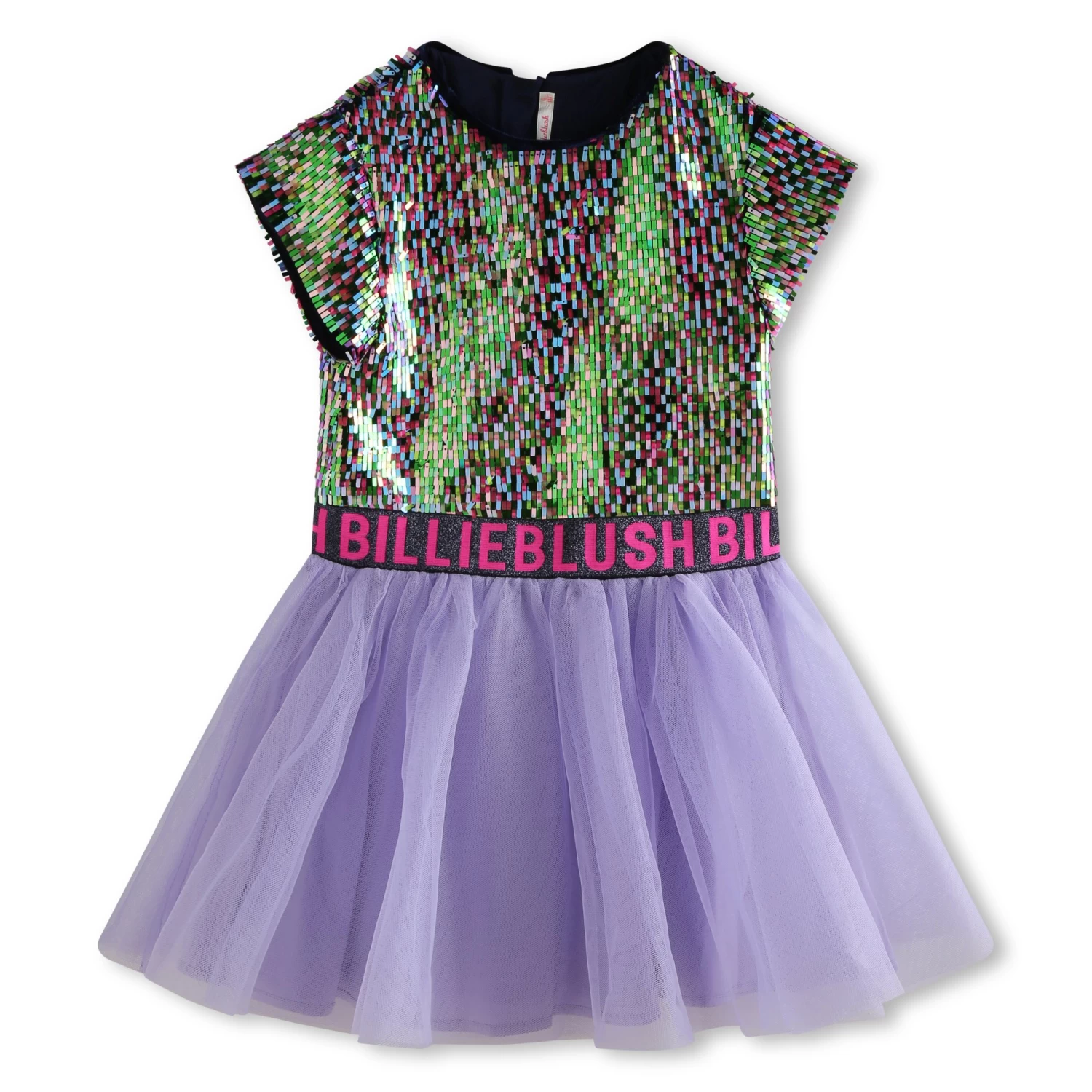 Cette robe Billieblush affiche des sequins rectangulaires brodés sur le haut en velours. Un élastique au jacquard Billieblush souligne la taille de la jupe en tulle doublée. Un zip au dos ferme ce modèle à manches courtes, disponible à partir du 3 ans.