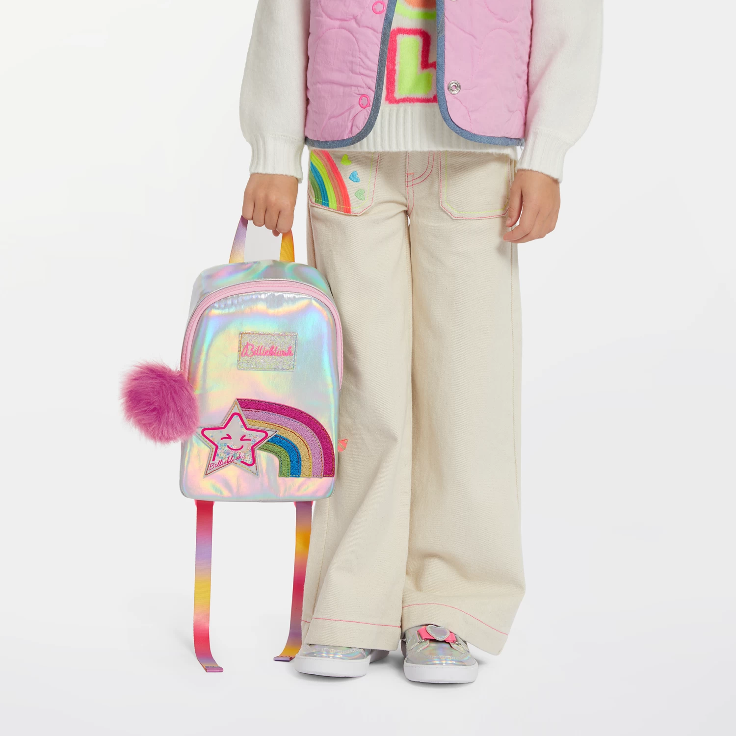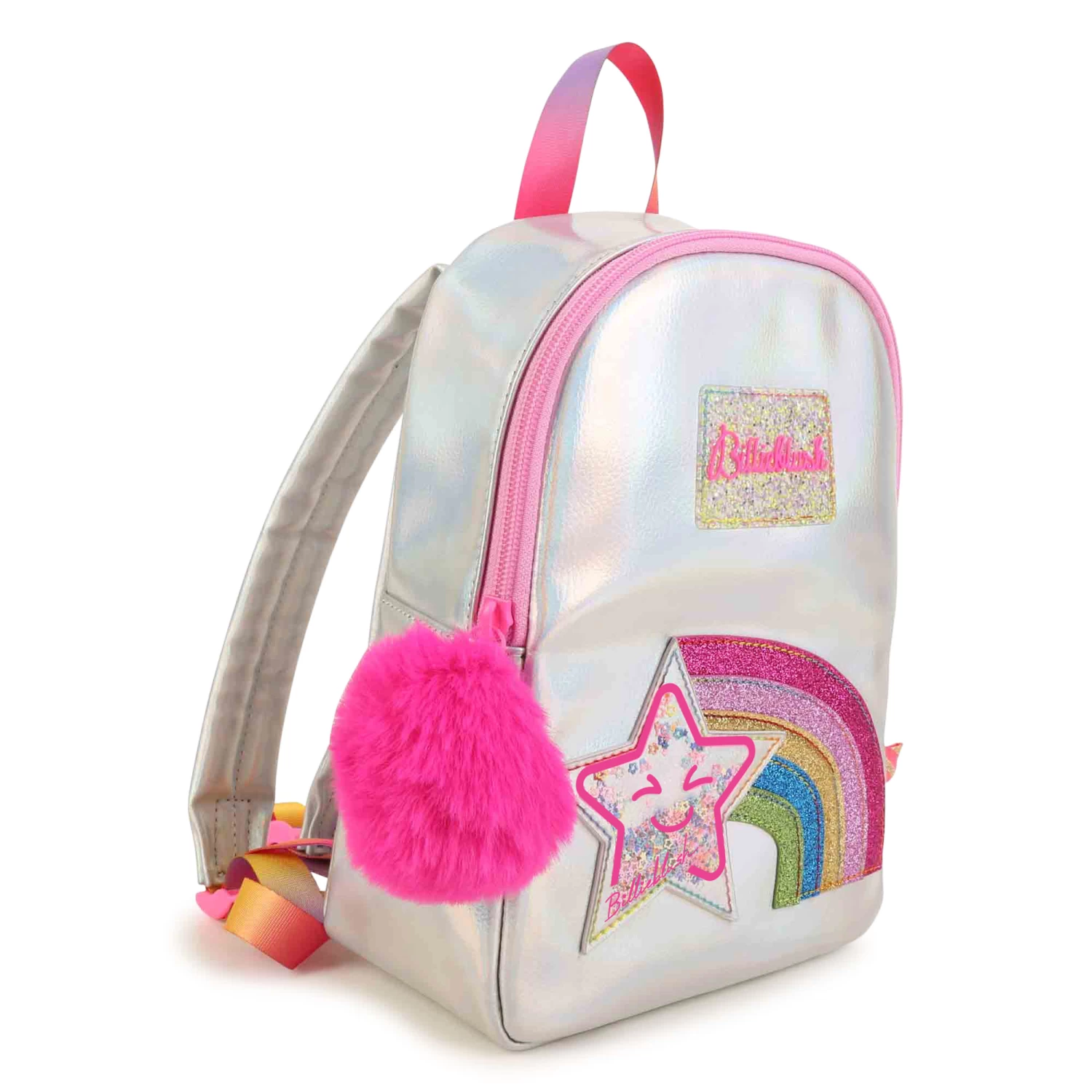 Ce sac à dos Billieblush apporte une dose de bonne humeur avec son applique arc-en-ciel à paillettes, agrémentée d’une étoile souriante siglée Billieblush. Le zip se termine par un gros pompon rose. Dimensions : 27 x 18 x 10 cm.