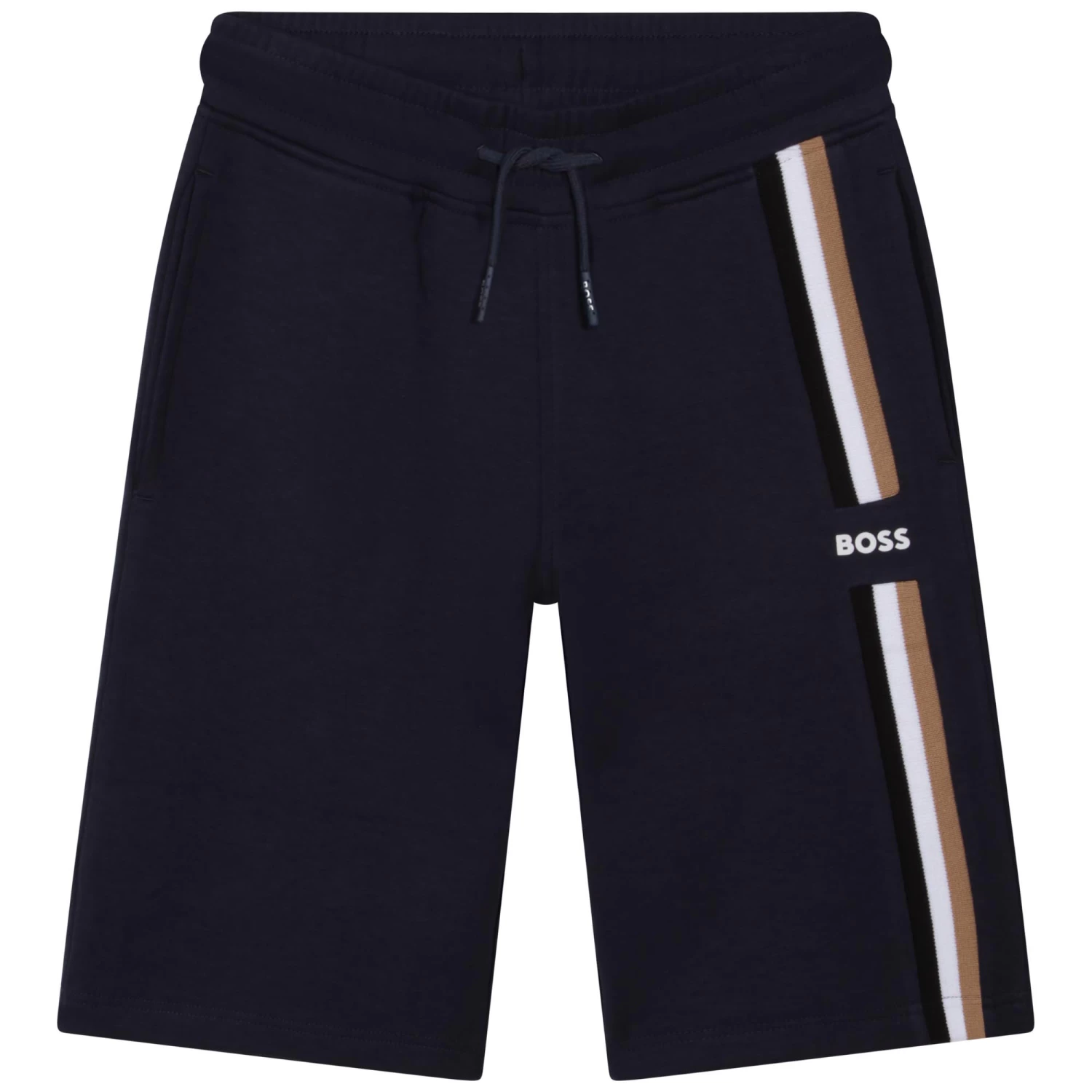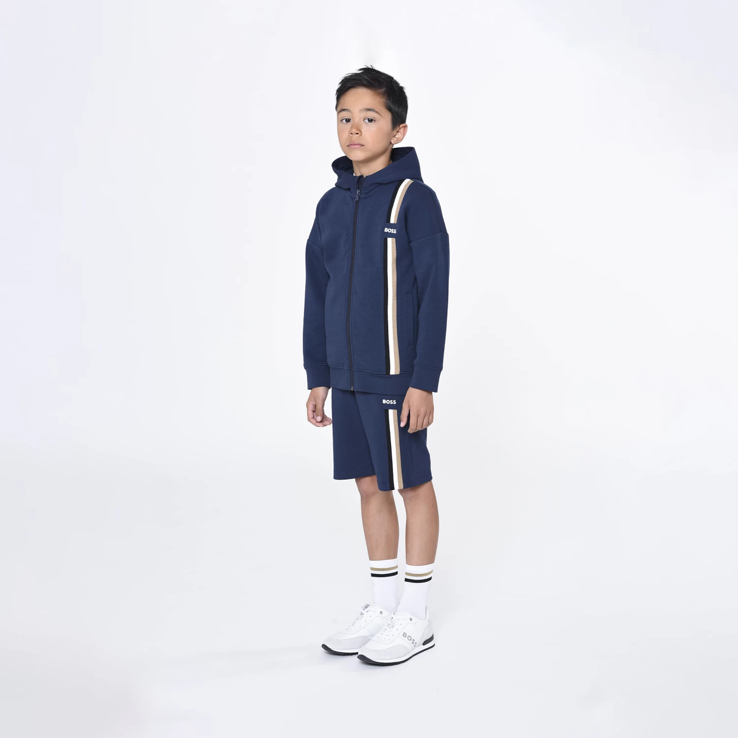 Ce bermuda de jogging BOSS s’avère confortable avec une confection en coton, polyester et élasthanne. Muni d’une taille élastiquée avec cordon de serrage, il est sublimé d’une bande tricolore contrastante sur le côté agrémentée du logo BOSS.