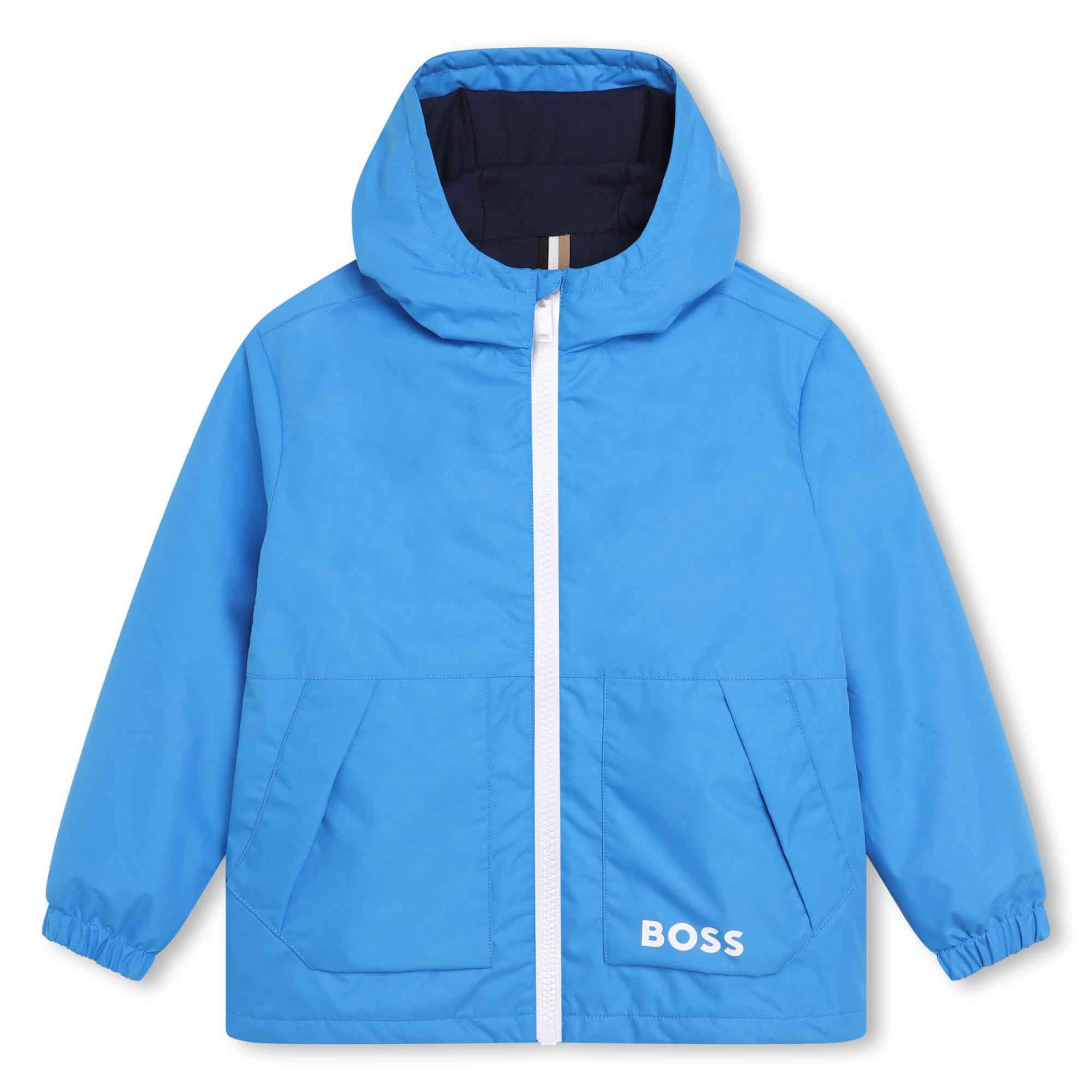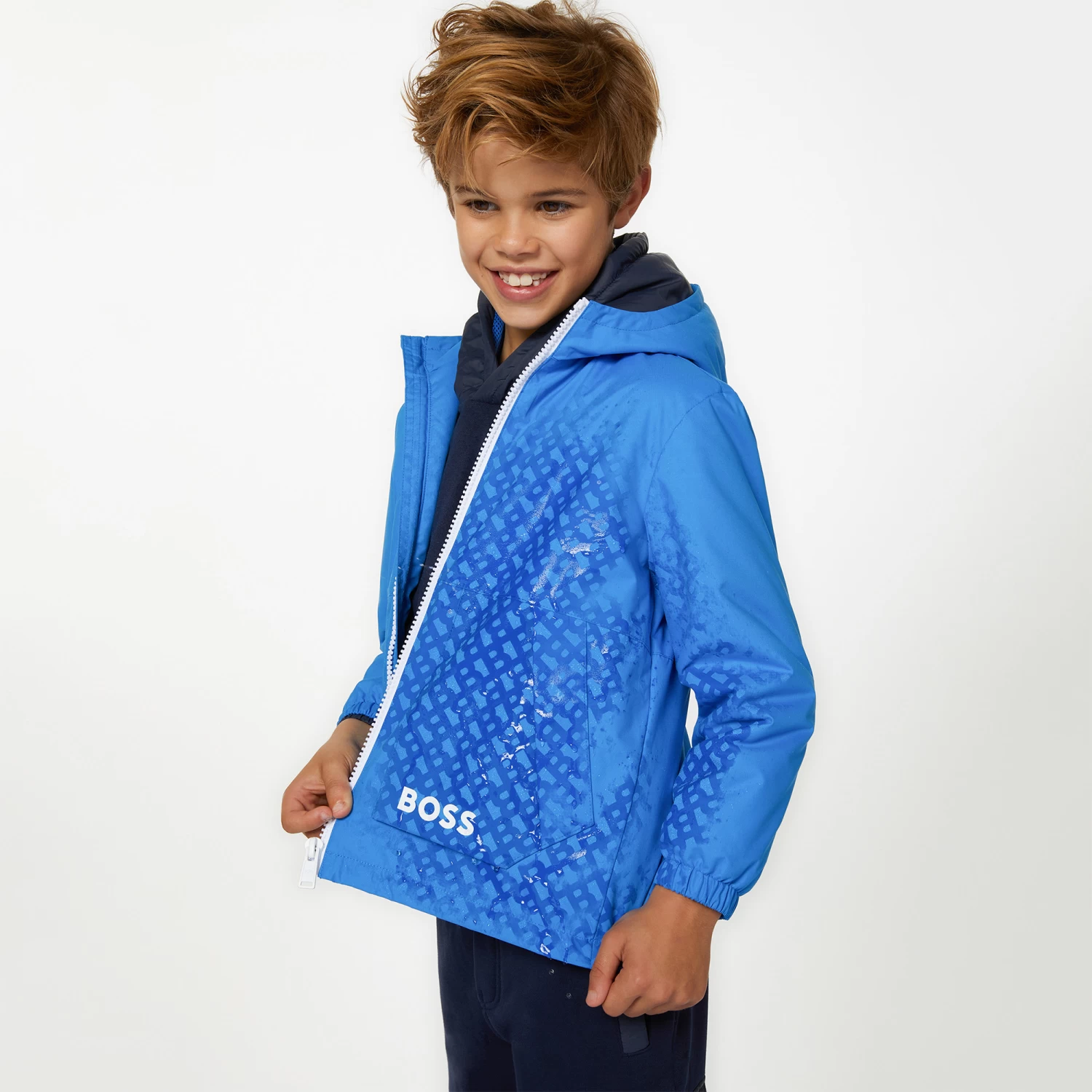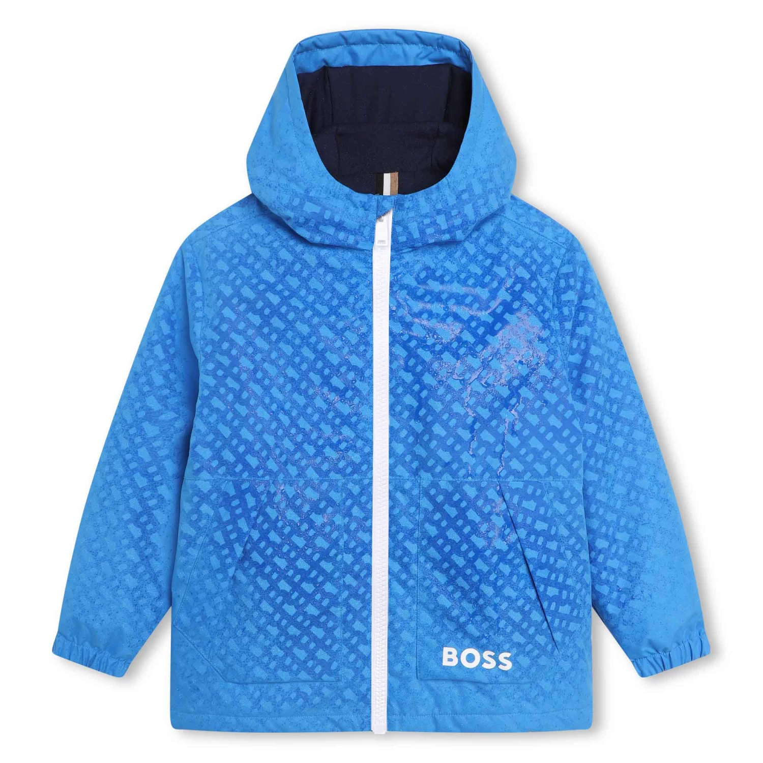 Ce coupe-vent à capuche BOSS présente une confection 100% polyester. Il est muni d’une fermeture zippée et de poches latérales. Original, il présente un imprimé intégral « MAGIQUE » qui apparaît au contact de l’eau. Le logo « BOSS » est imprimé sur la poche.