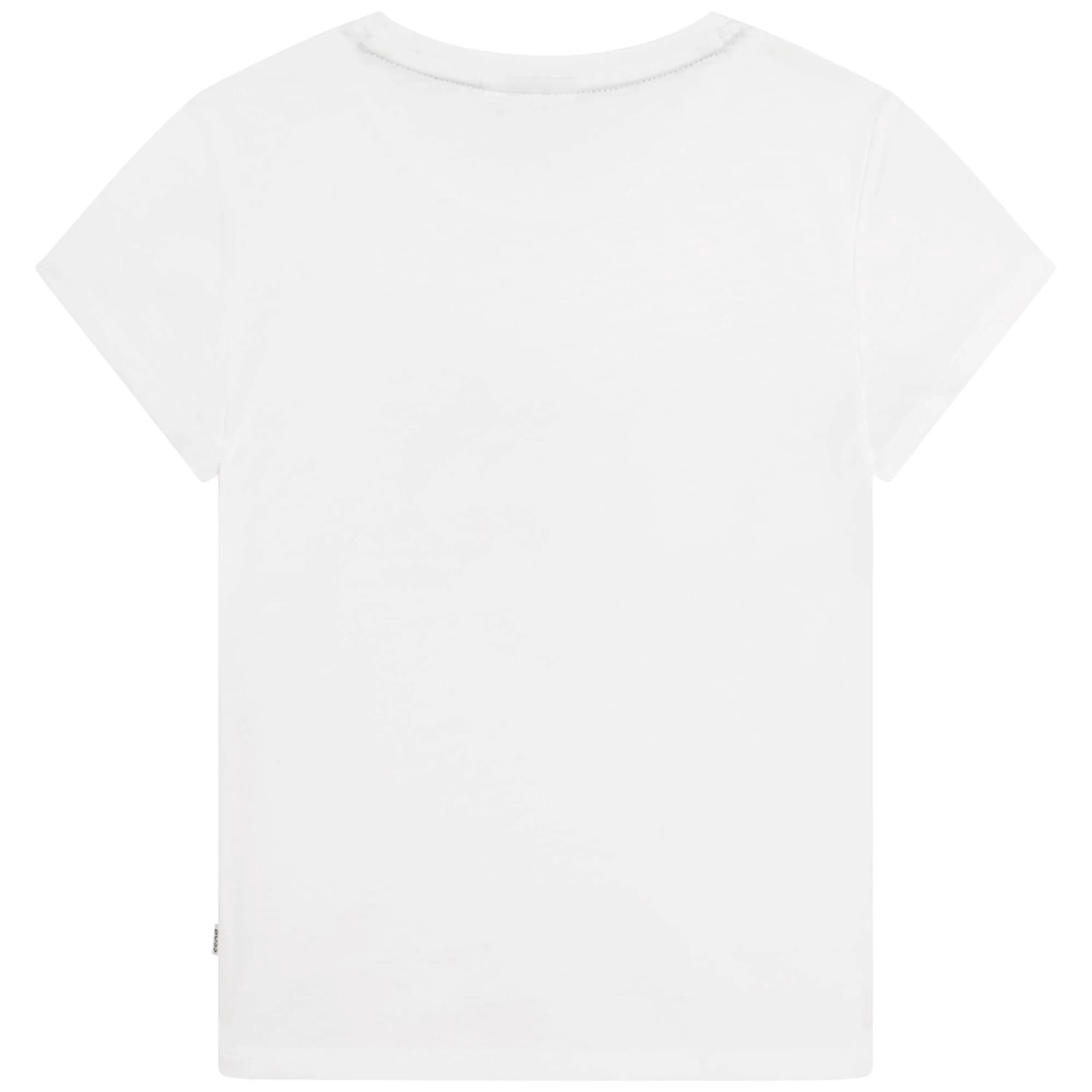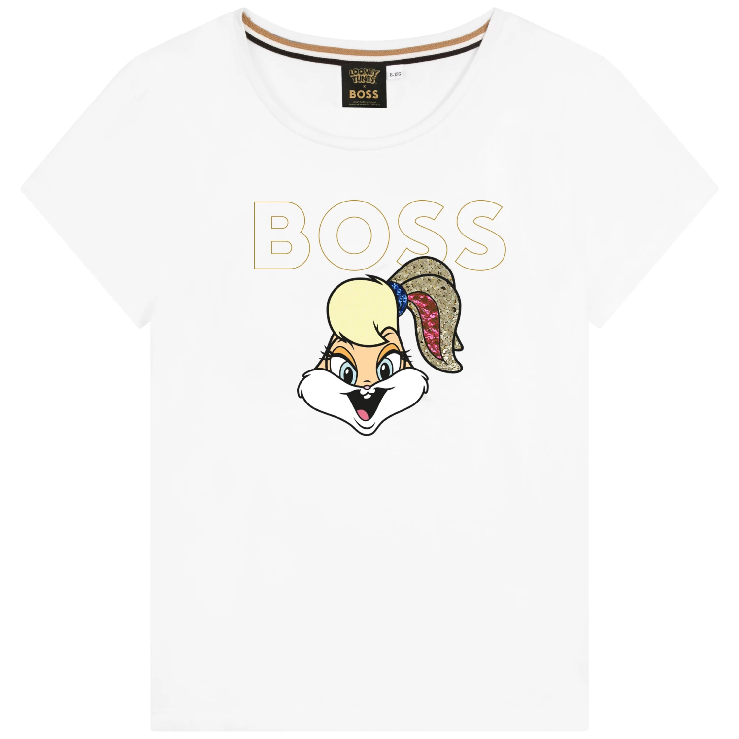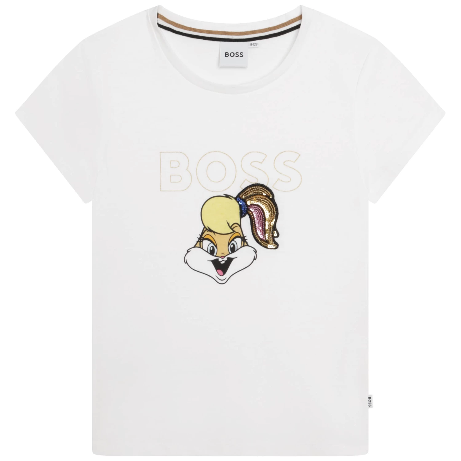 Ce T-shirt pour fille BOSS à manches courtes est disponible en plusieurs coloris. Il est composé d’un mélange de coton et d’élasthanne. Sur le devant se trouve un personnage de l’univers Looney Tunes, Lola Bunny, dont les oreilles sont agrémentées de sequins.