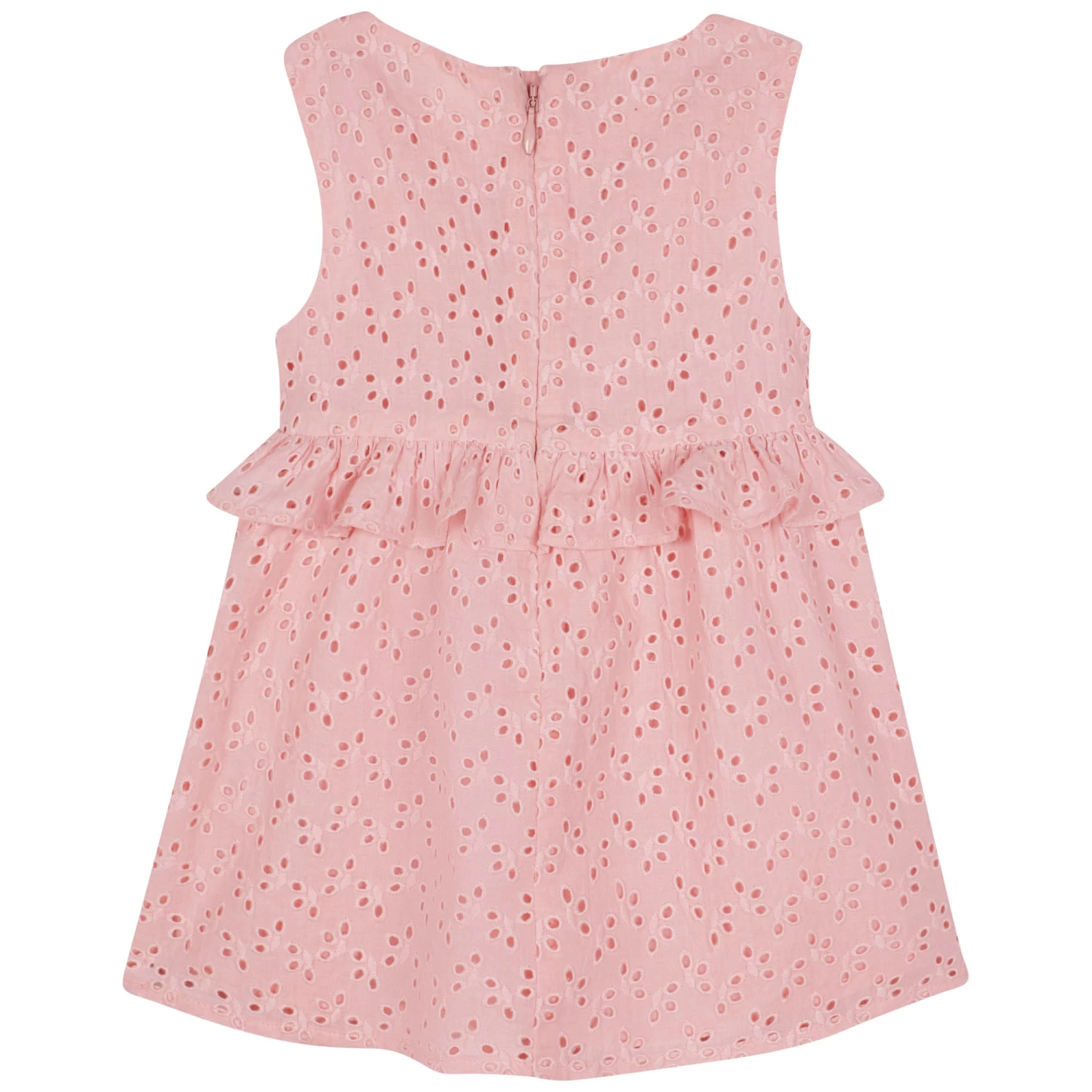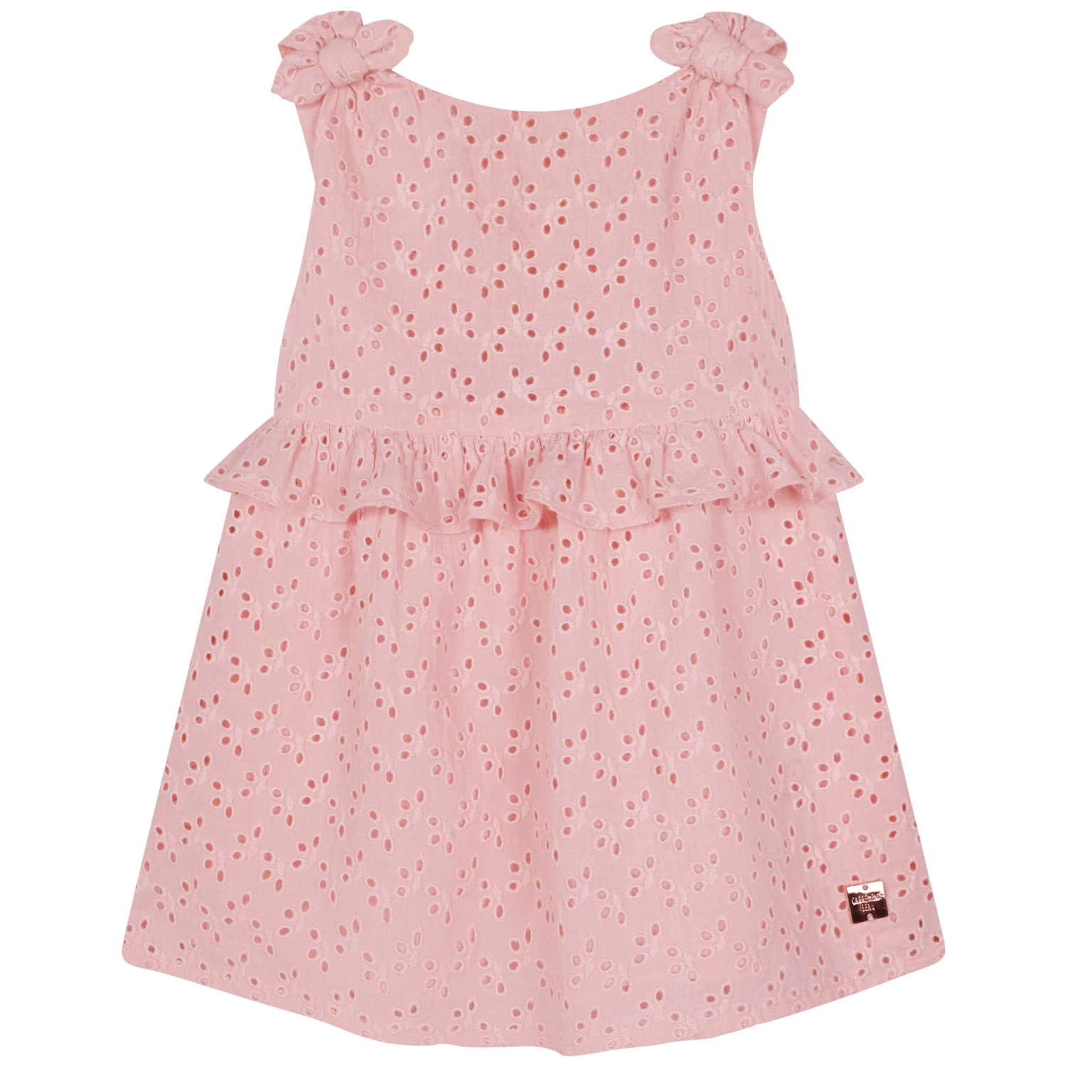Cet ensemble de cérémonie Carrément Beau est confectionné en broderie anglaise 100 % coton. La robe sans manche arbore des noeuds sur les épaules et un volant à la taille. Elle se ferme par une glissière invisible au dos. Un noeud orne le bandeau assorti.