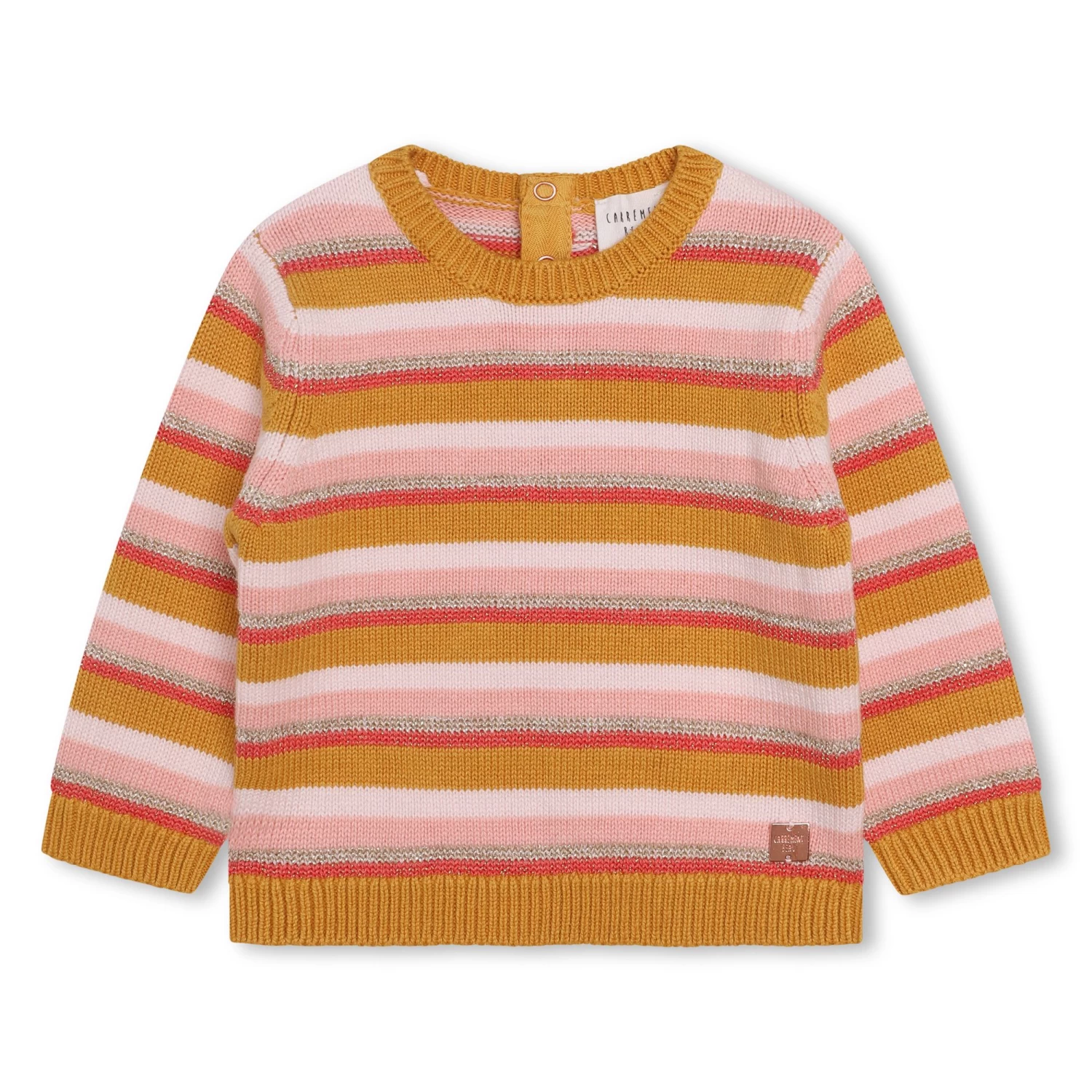 Ce pull rayé Carrément Beau est tricoté avec du coton issu de l’agriculture biologique, de la laine et du fil métallisé. Il se caractérise par un point fantaisie, des manches longues, une encolure ronde et une fermeture boutonnée au dos.