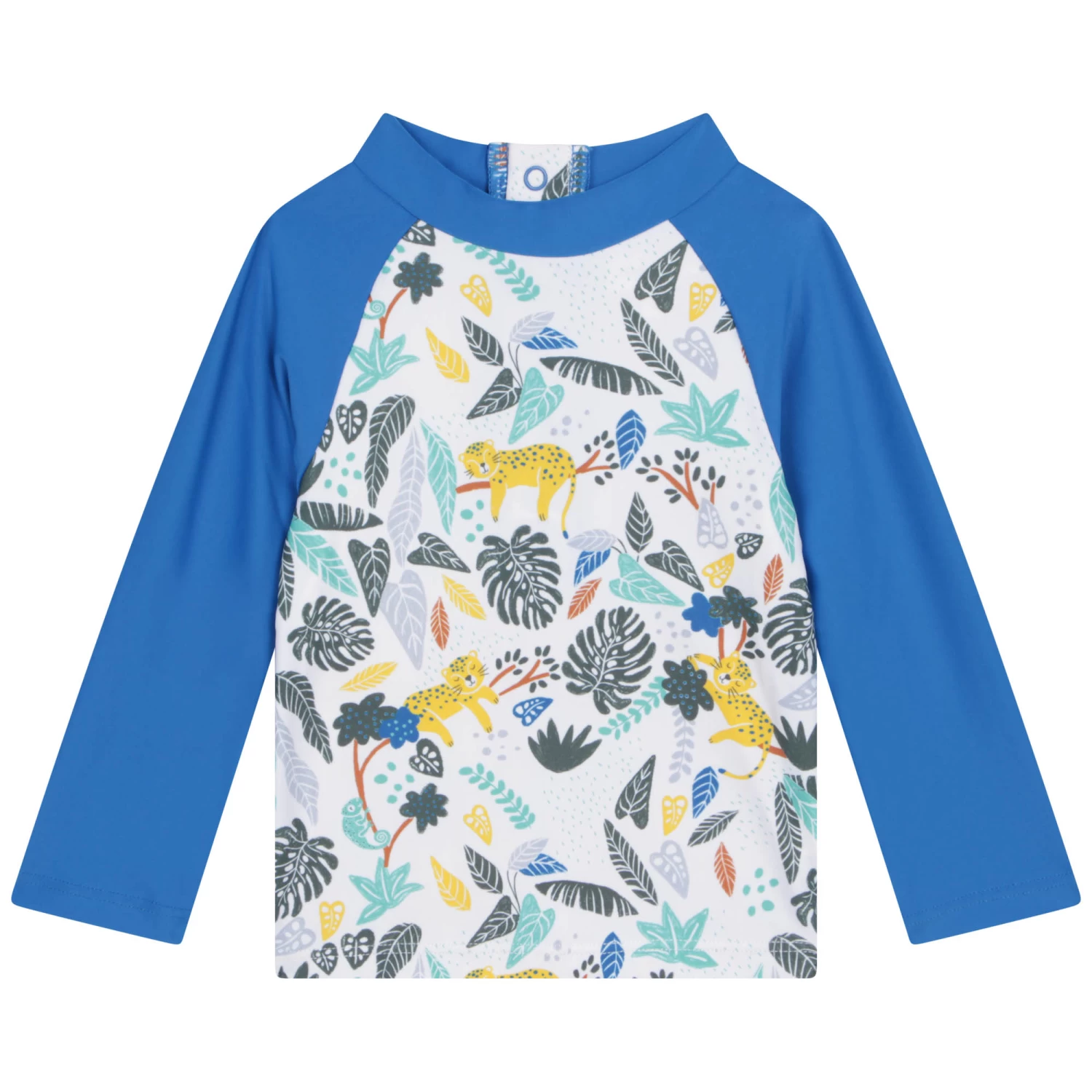 Ce T-shirt de bain Carrément Beau protège des rayons UV. Les manches longues à emmanchures raglan et le col montant affichent une teinte unie. Le devant et le dos pressionné arborent un imprimé jungle. Ce modèle est vendu en pochette zippée Carrément Beau.