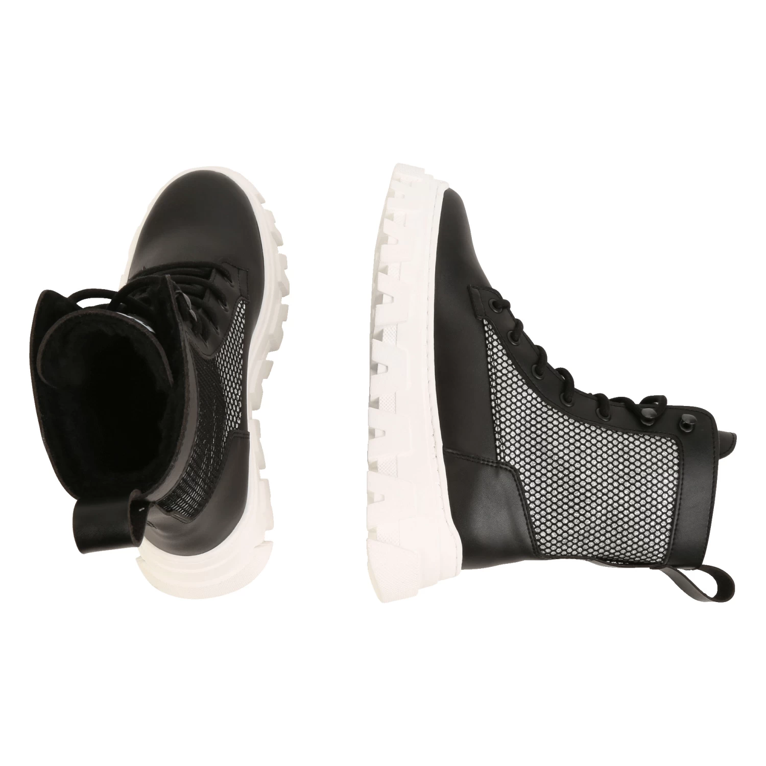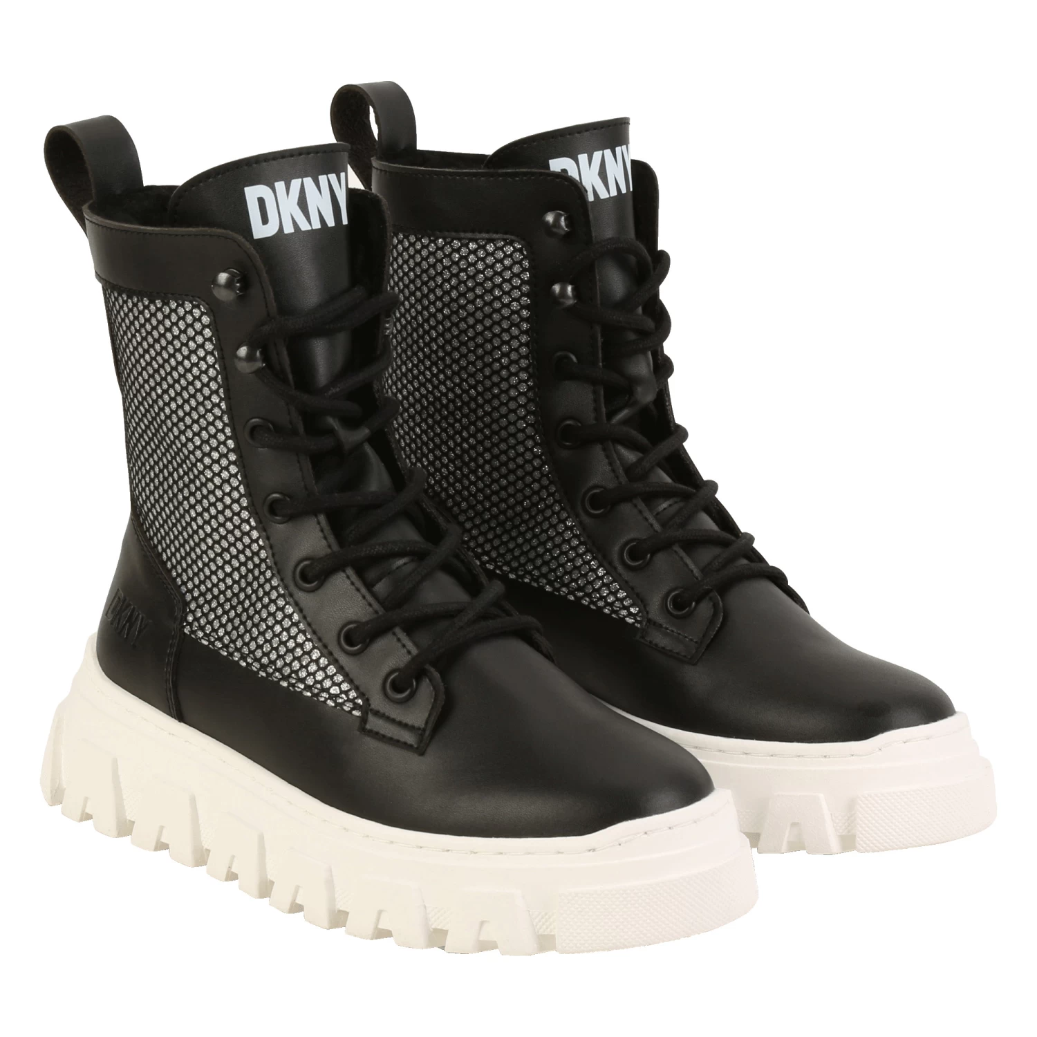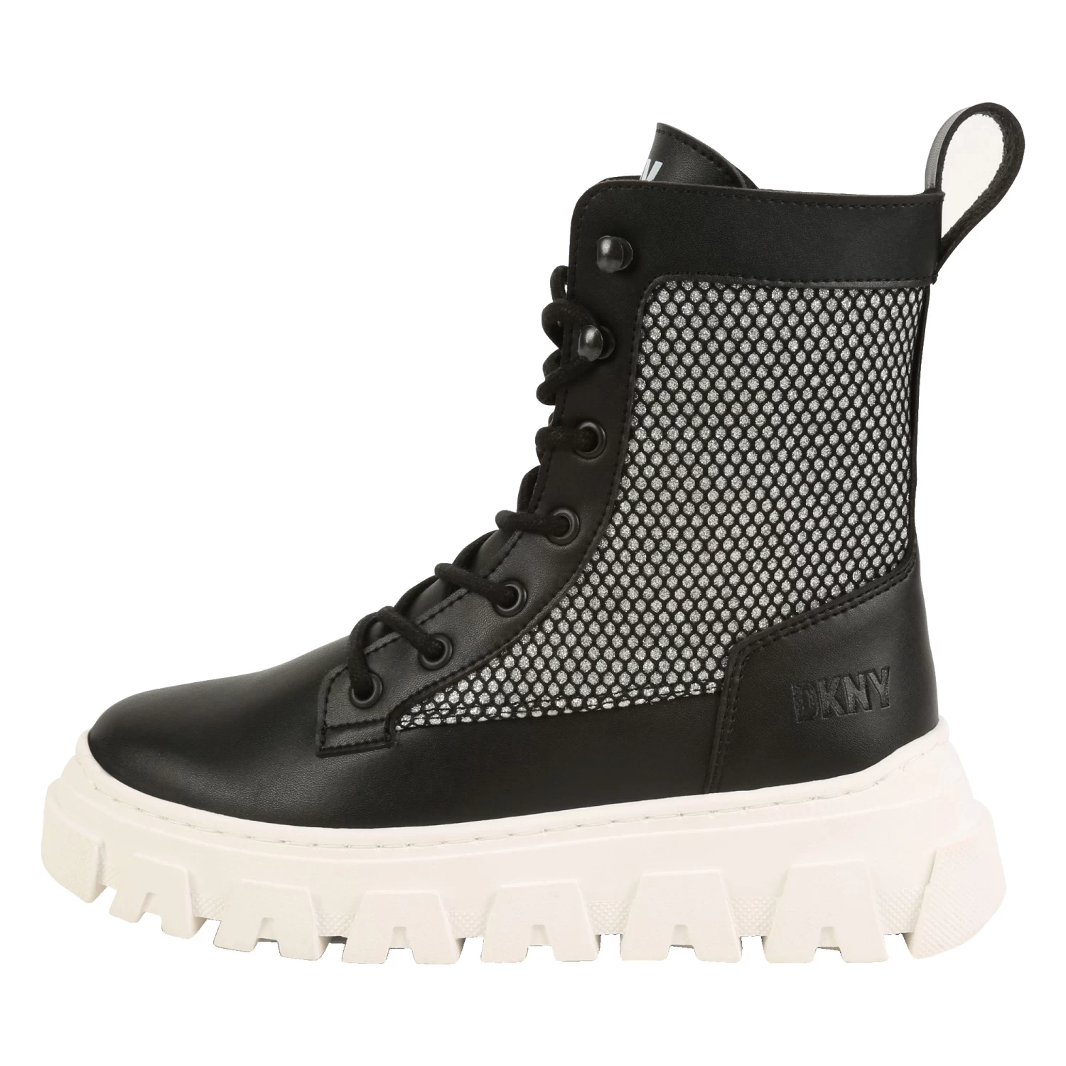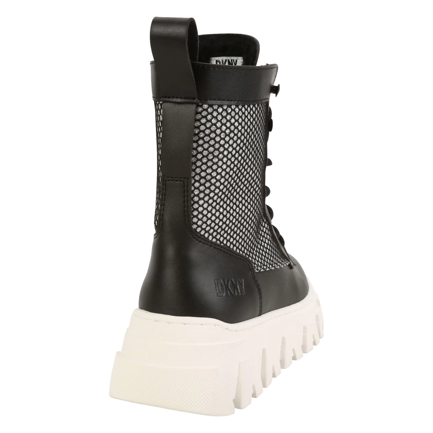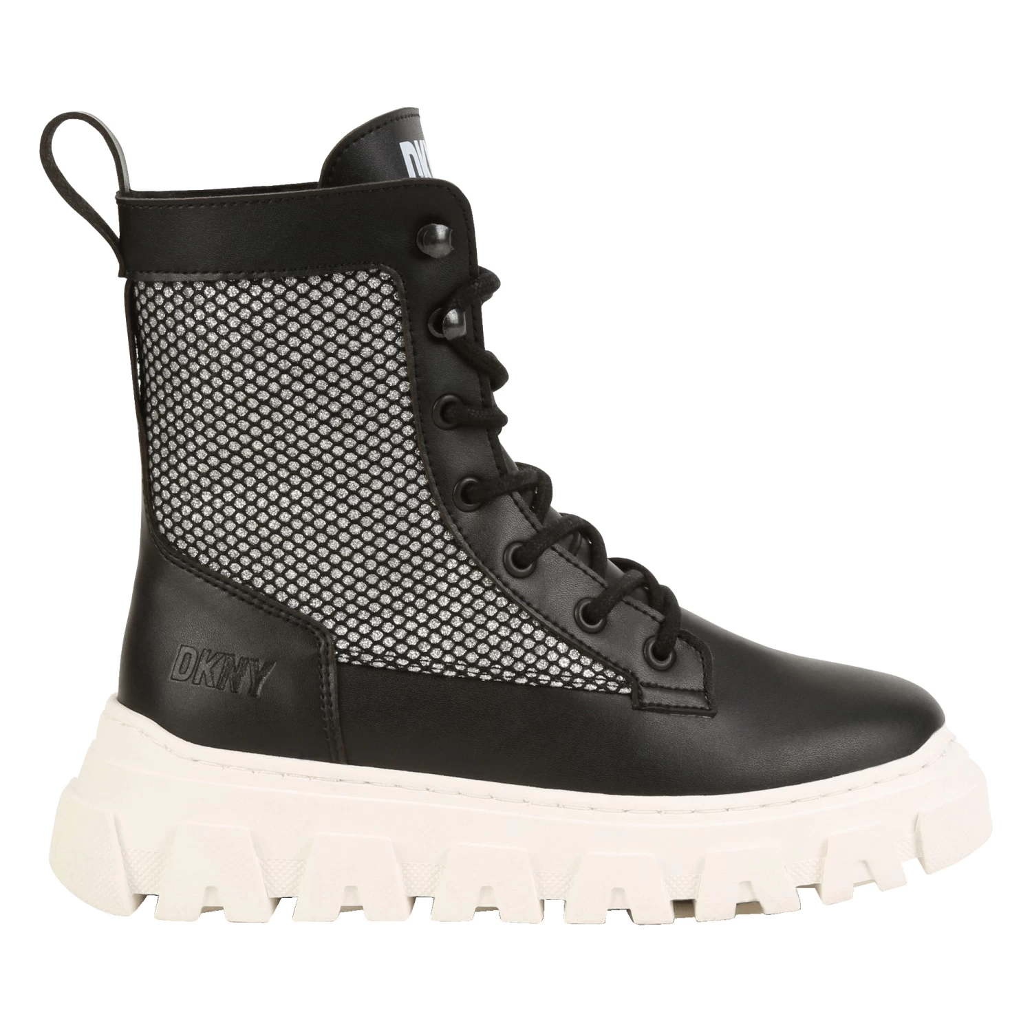 Vendues dans une boite, ces bottines à lacets DKNY sont confectionnées en cuir de vachette. Elles sont munies d’une semelle épaisse crantée, d’empiècements en résille sur les côtés, ainsi que de crochets et d’oeillets en métal. Contient des parties non textiles d’origine animale.