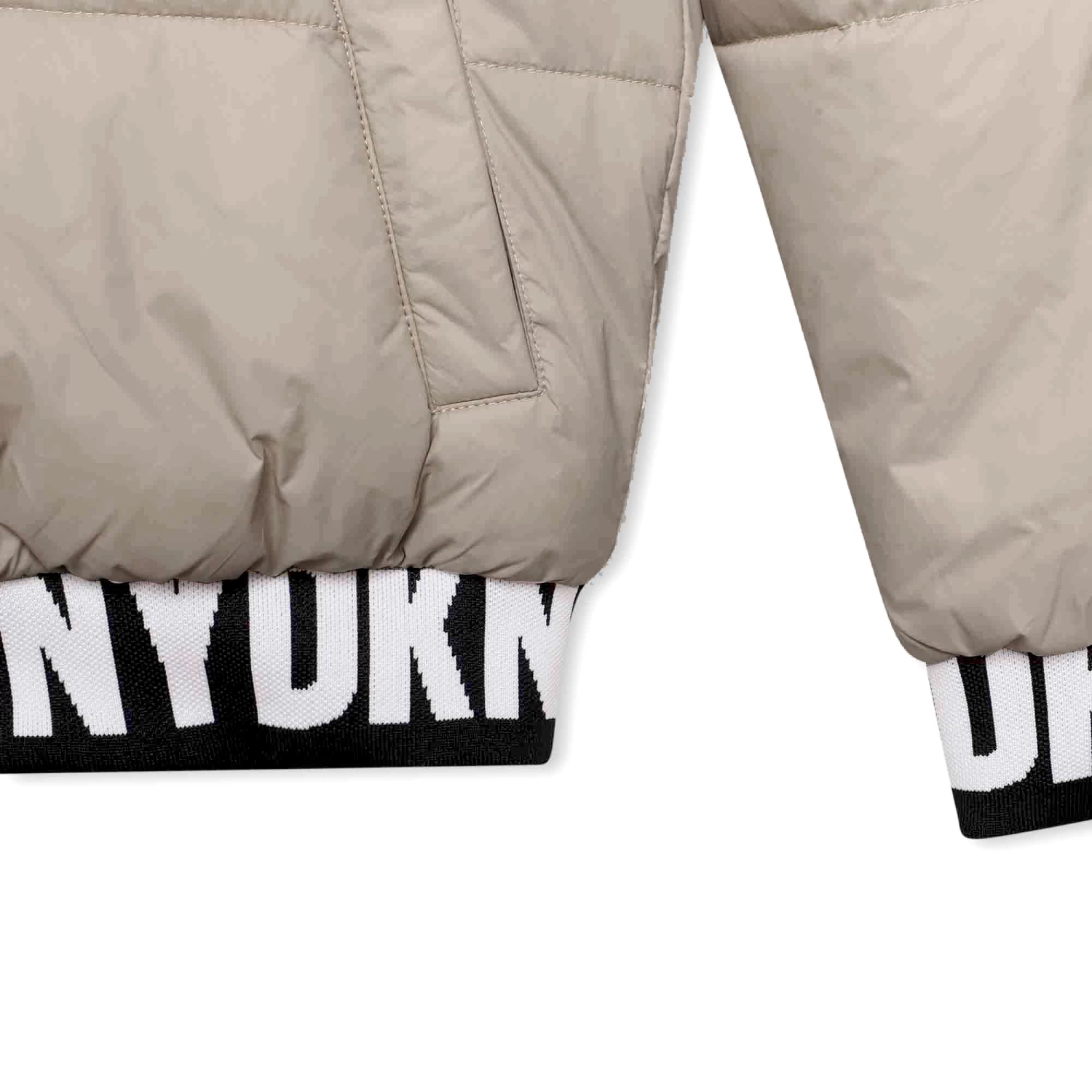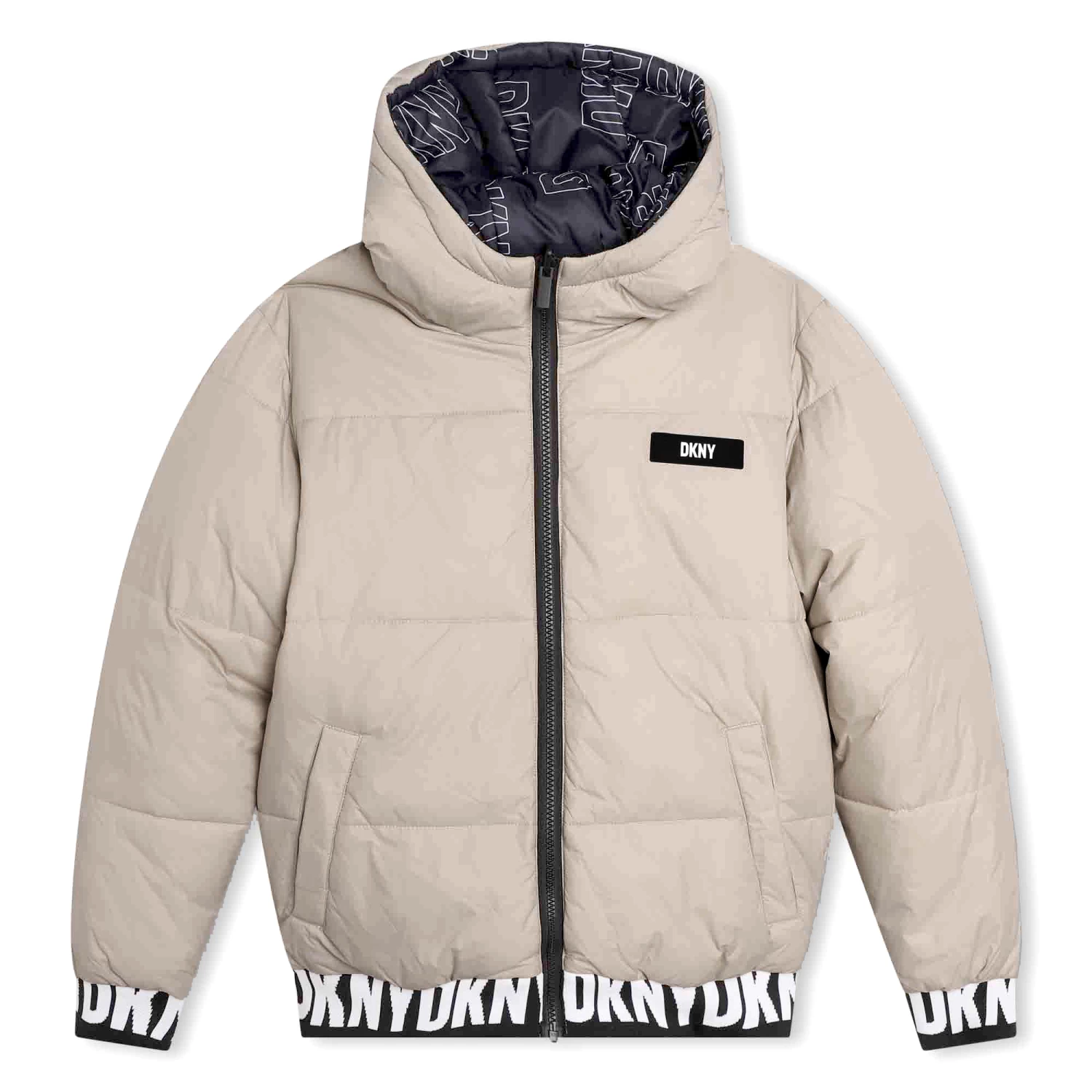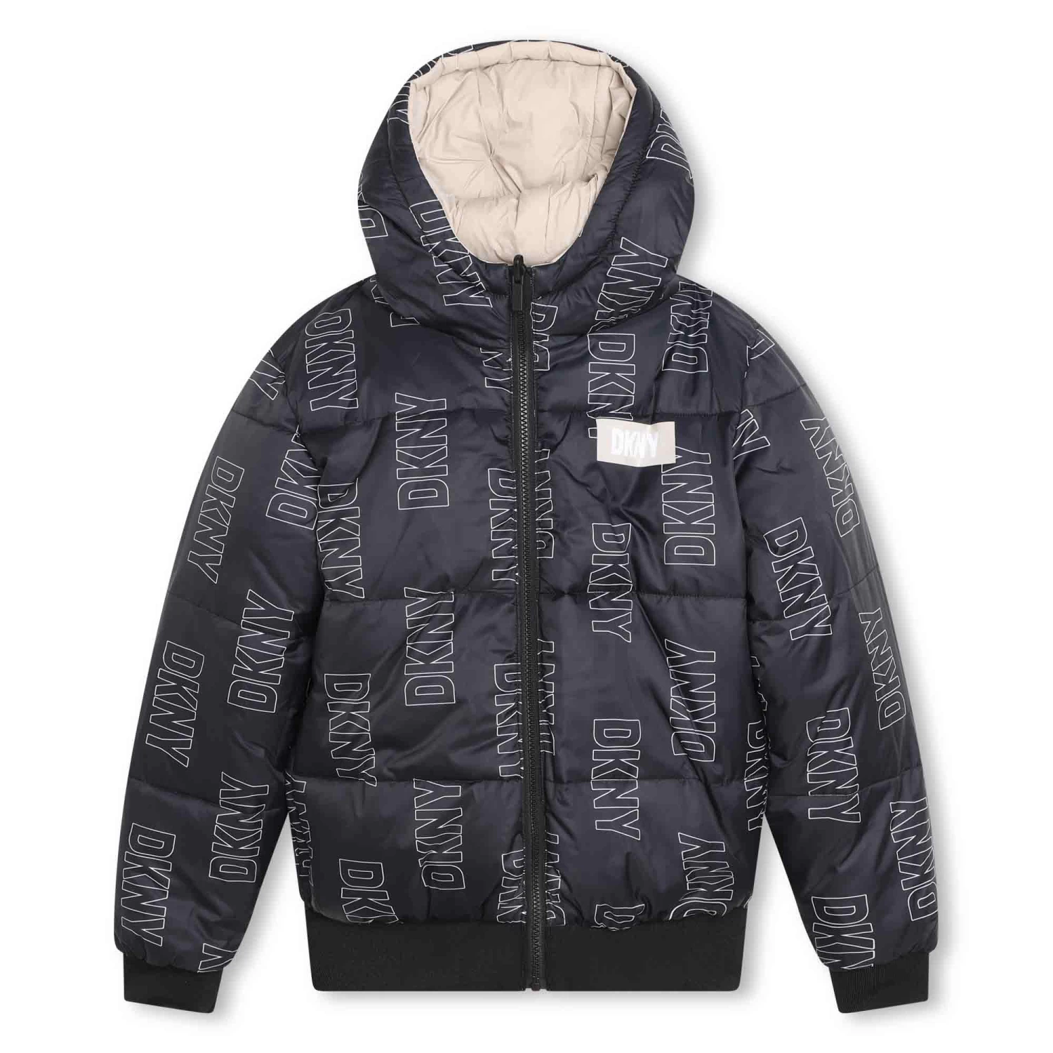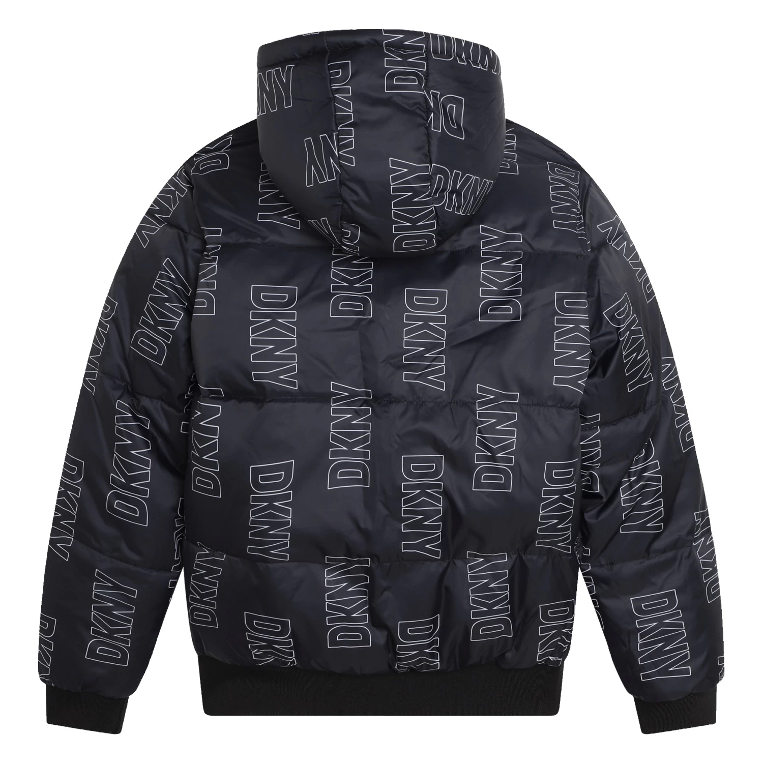 Cette doudoune à capuche est confectionnée en polyester et déperlant. Réversible, elle présente un côté uni avec une bande siglée en tricot dans le bas et aux poignets. L’autre côté arbore un imprimé DKNY. Elle dispose d’une fermeture zippée et d’un rembourrage en ouate.