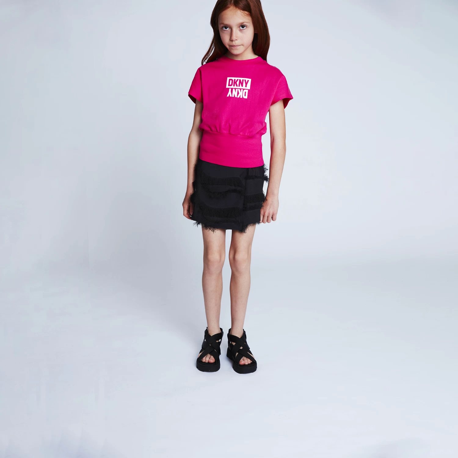 Sous cette jupe de cérémonie pour fille se cache un short offrant un porté plus confortable. Agrémenté de franges, ce modèle dispose d’une taille élastiquée avec le logo DKNY en lettres contrastantes et d’une doublure en viscose.