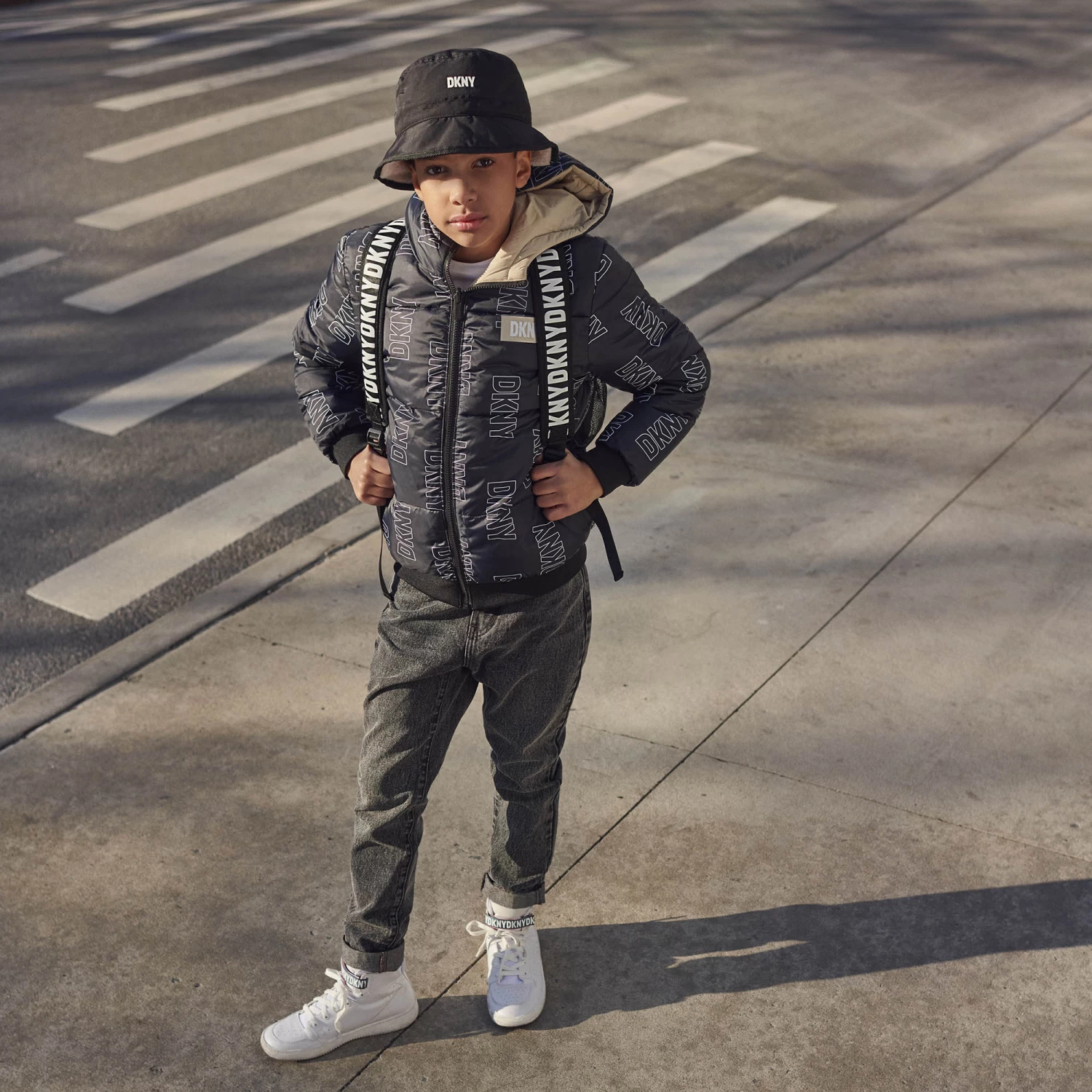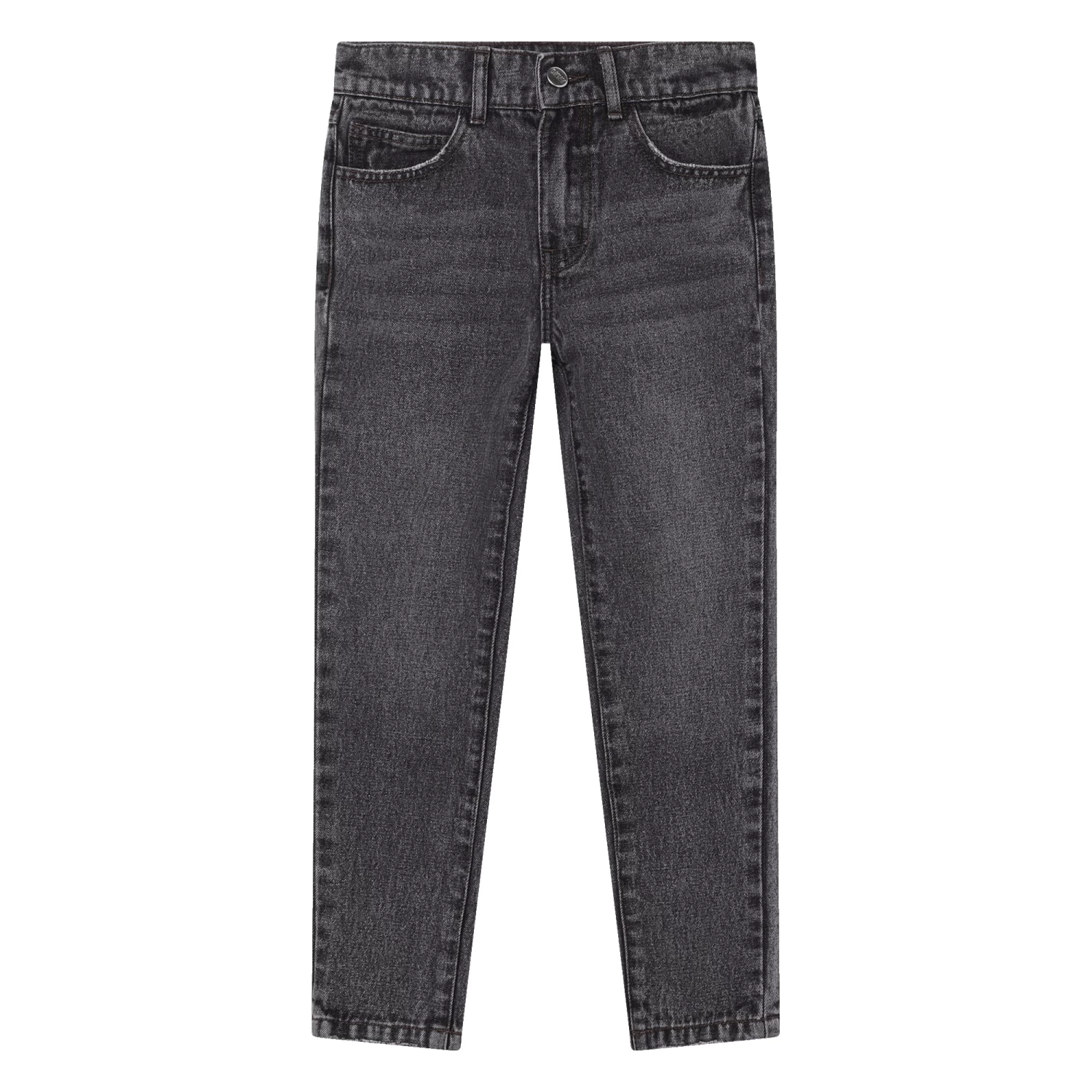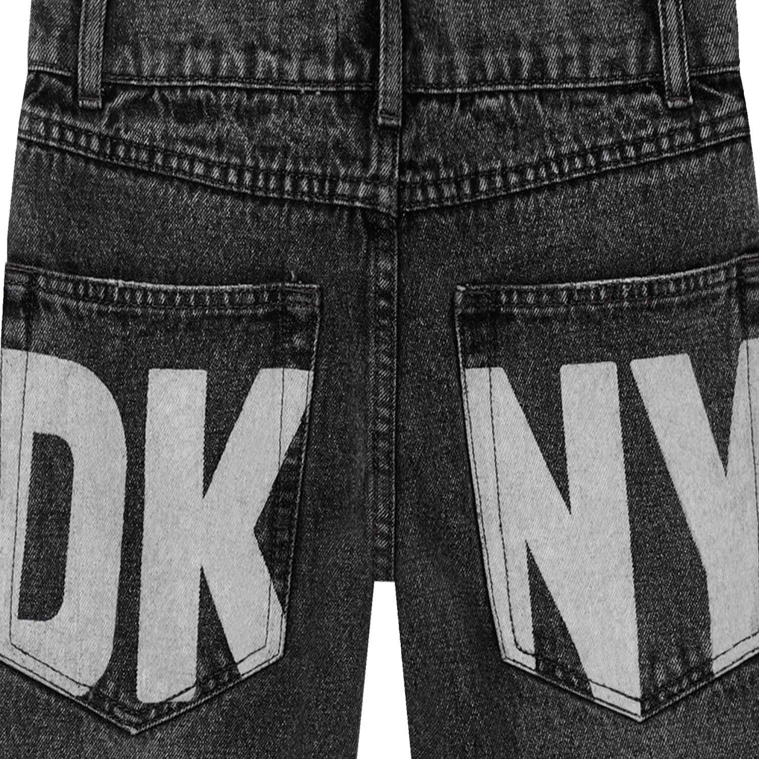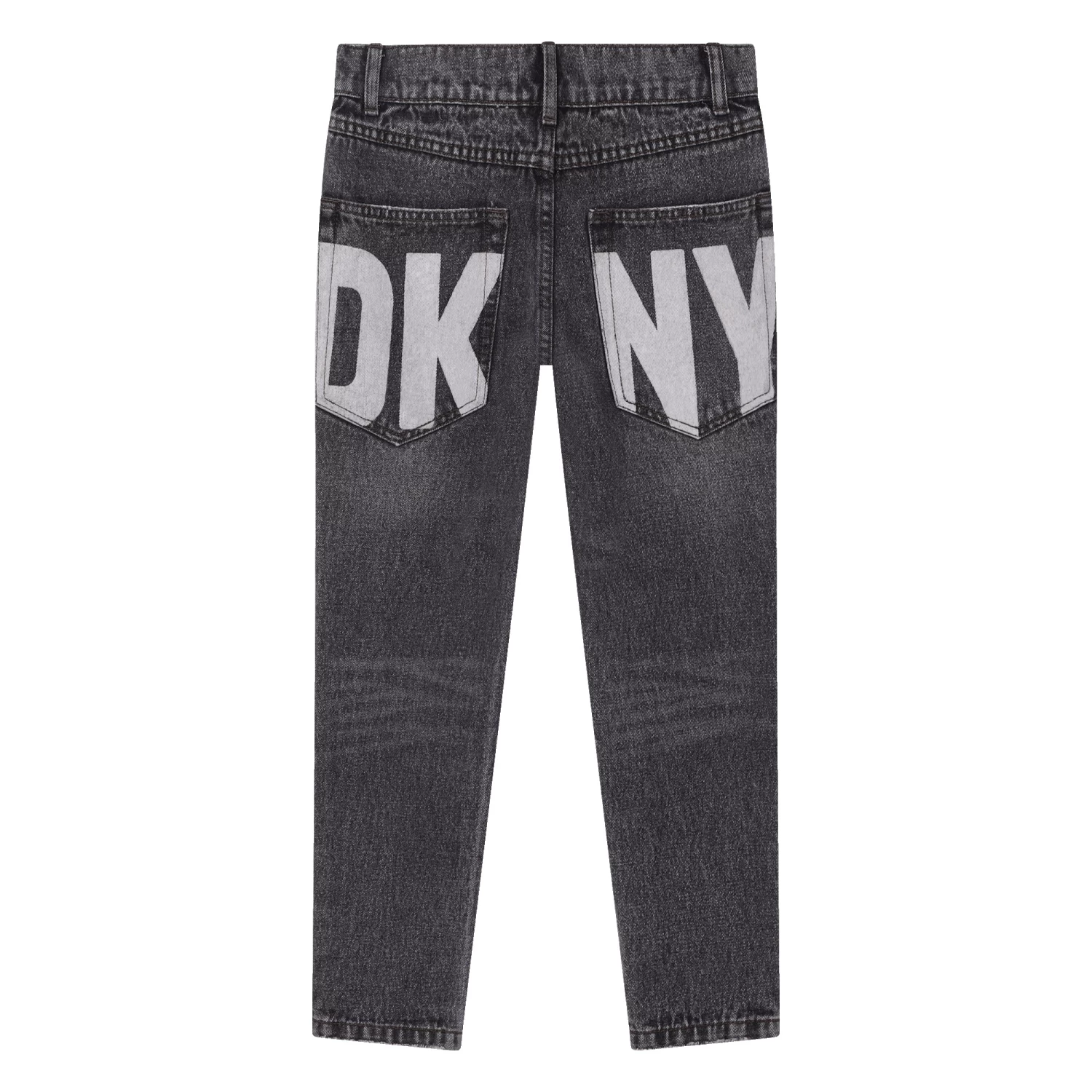 Ce pantalon en jean 100 % coton est unisexe. Il est agrĂ©mentĂ© d’un logo DKNY dans le dos, en lettres XXL. Il dispose d’une taille rĂ©glable, d’une fermeture zippĂ©e et boutonnĂ©e, ainsi que de cinq poches.