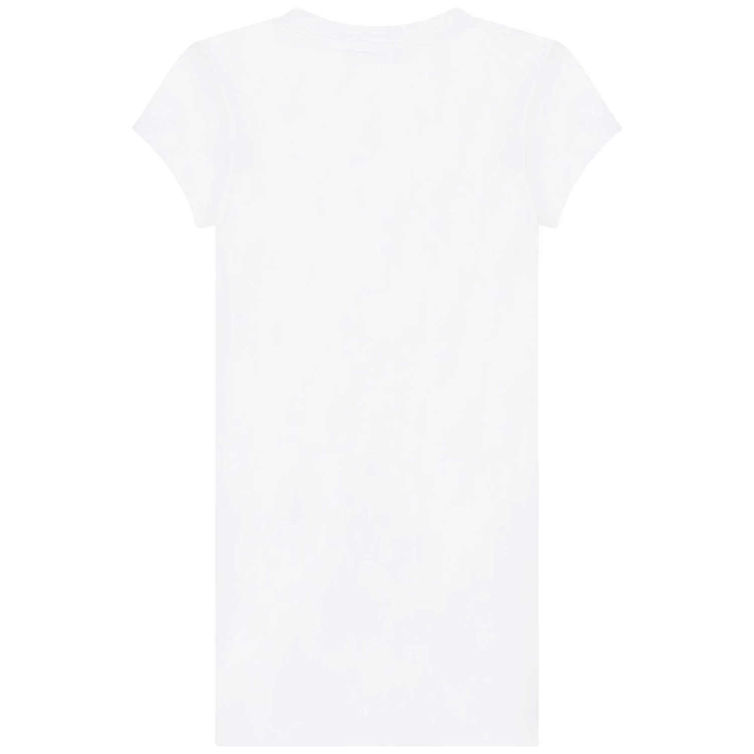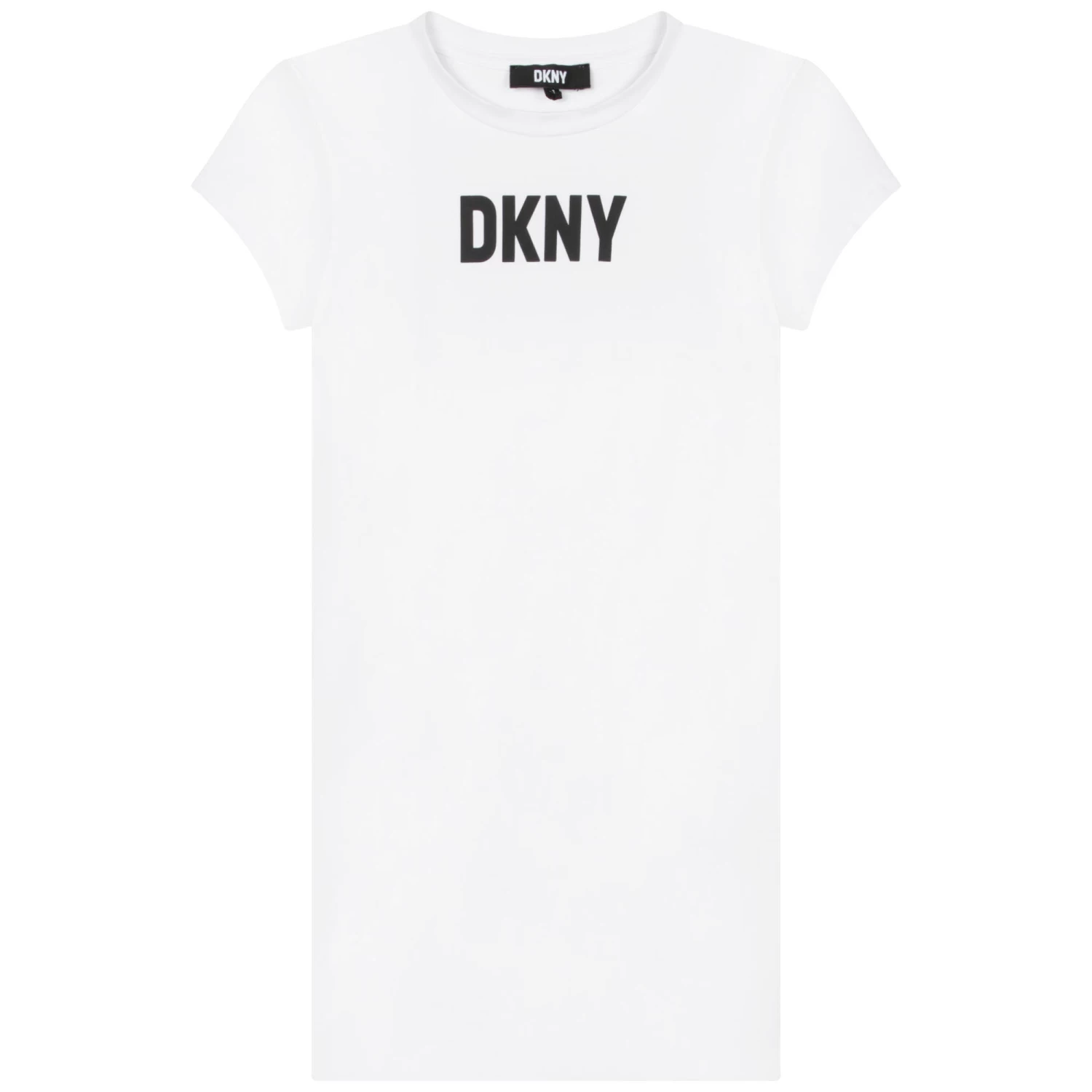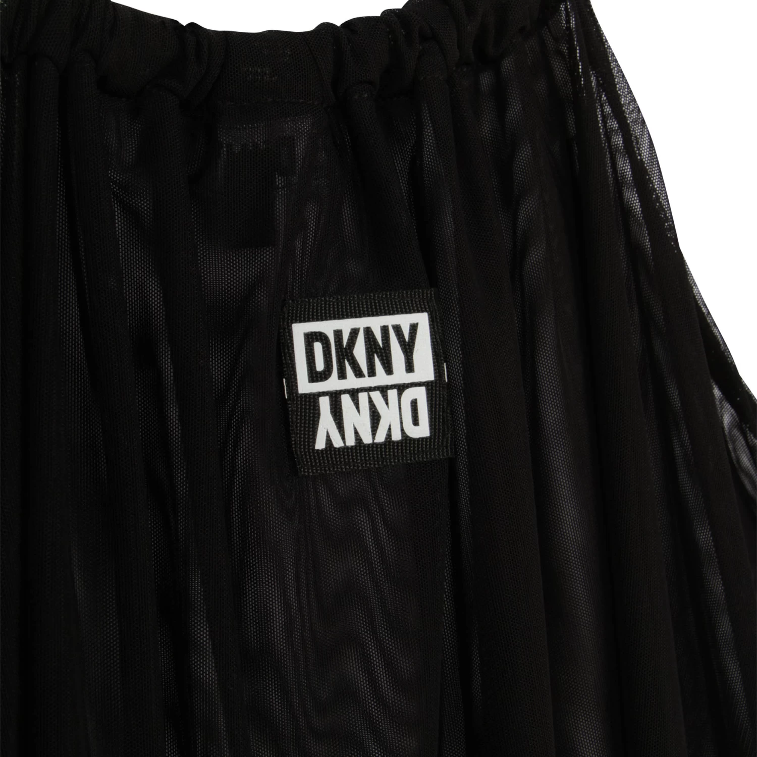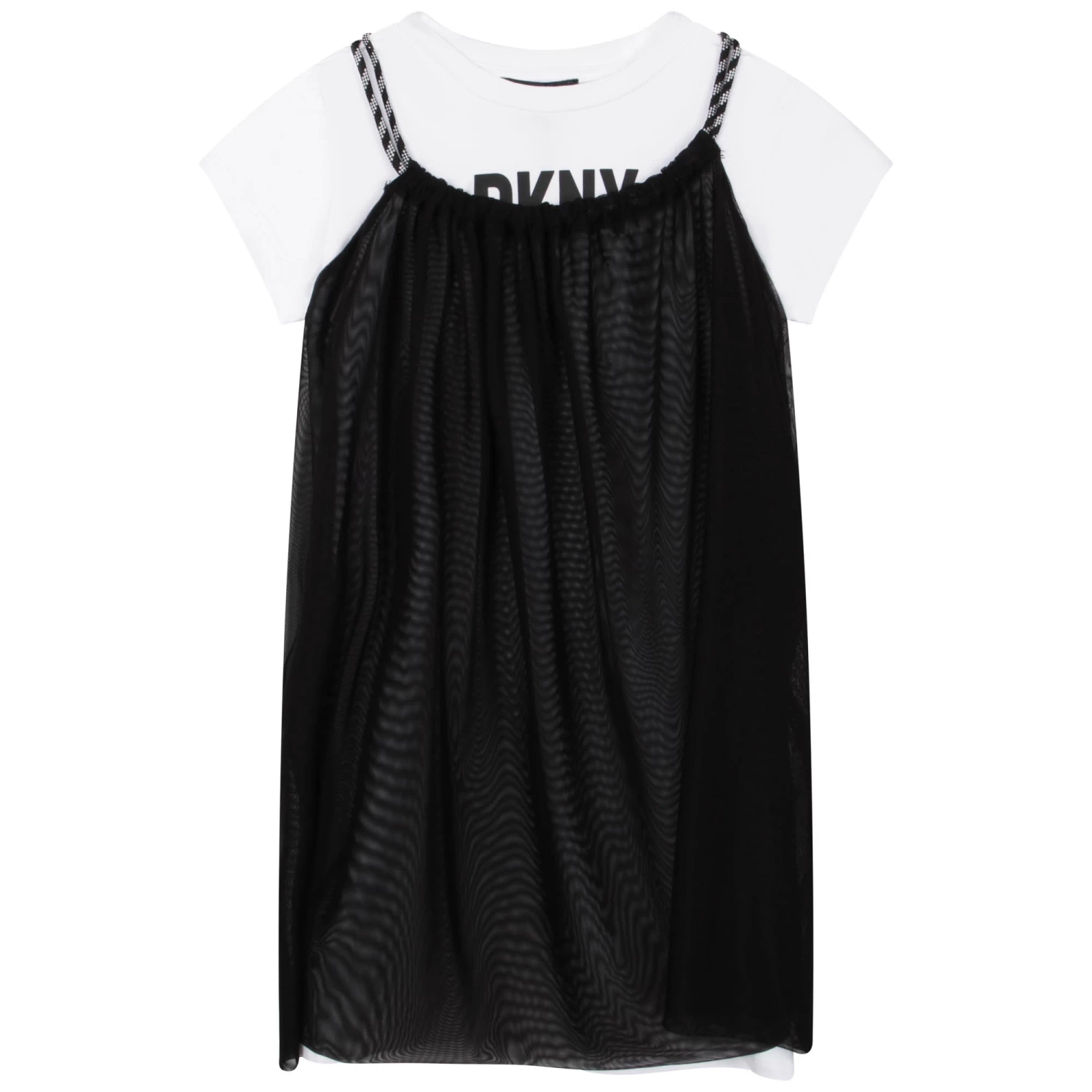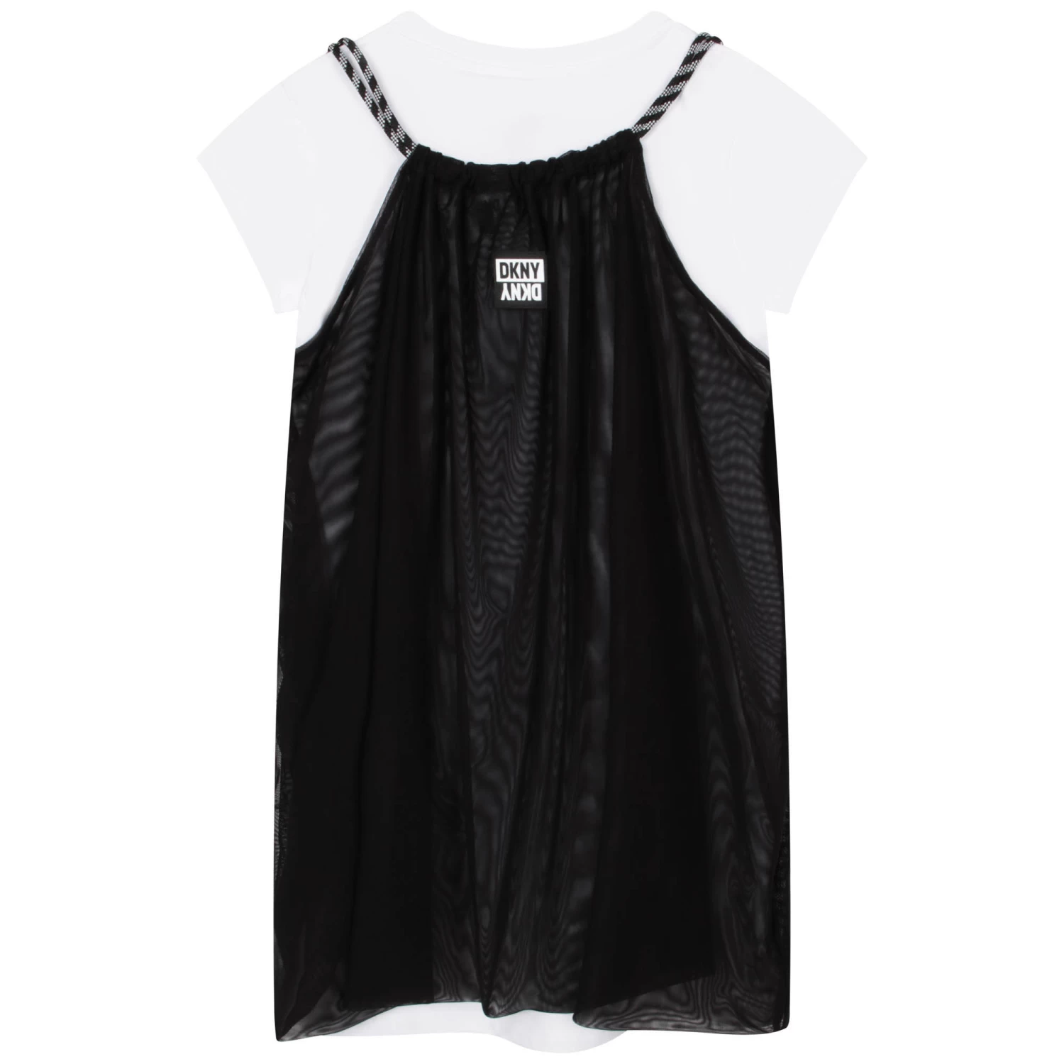 Cette robe 2 en 1 DKNY se partage en 2 modèles distincts. Dessous, la robe T-shirt à manches courtes est confectionnée en coton majoritaire. Elle affiche le sigle DKNY sur la poitrine. Dessus, la robe fluide en résille est dotée de bretelles tissées bicolores.