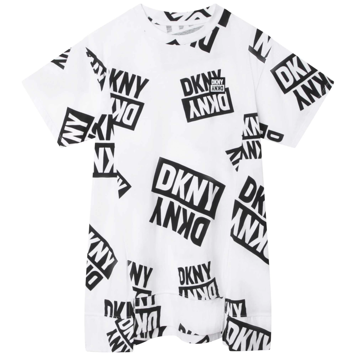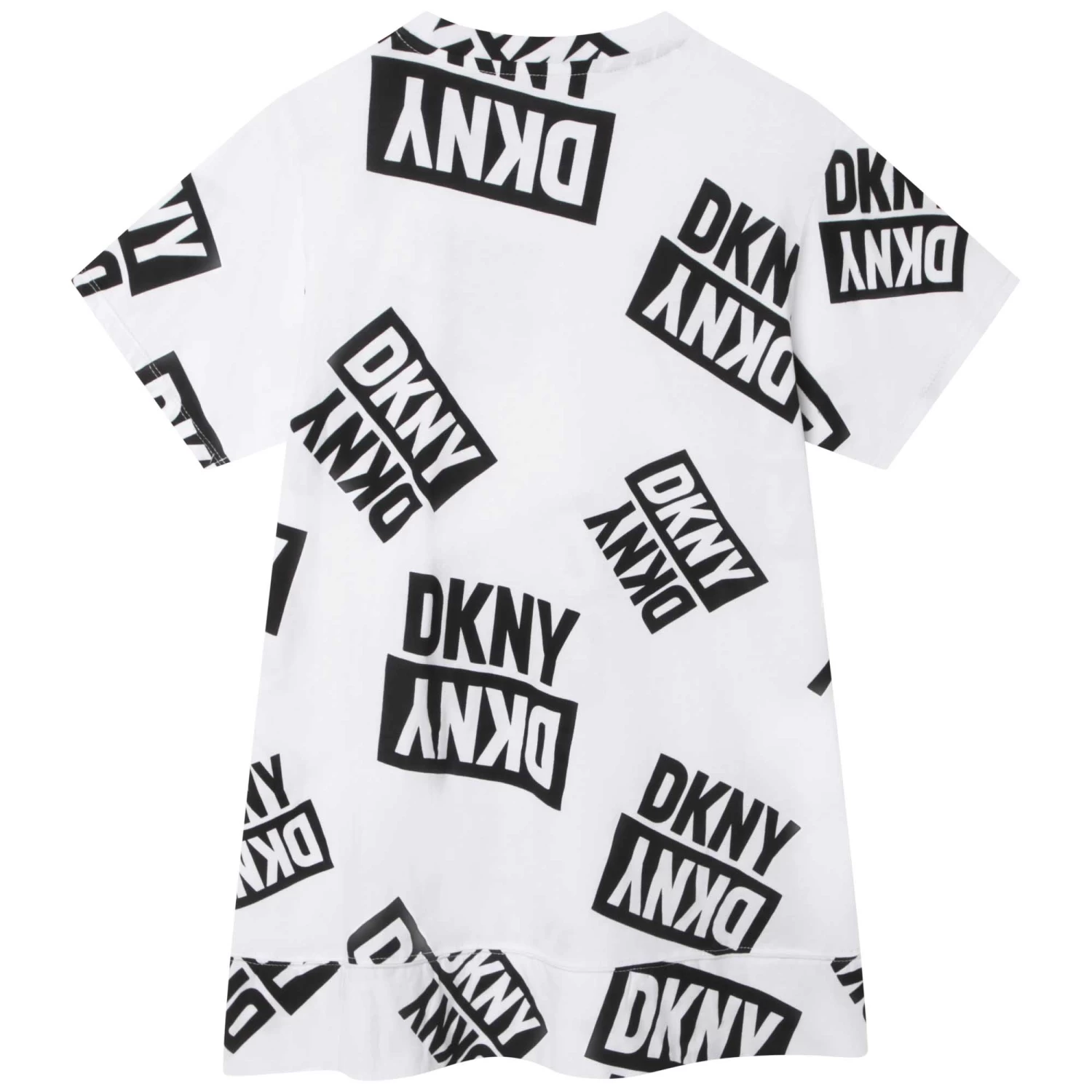 Cette robe DKNY à manches courtes est confectionnée en 100 % coton. En plus de l’imprimé DKNY sur toute la surface, la poitrine arbore un badge DKNY. Le large ourlet possède 2 fentes dans la continuité des découpes devant. Elle est composée d’une ceinture.