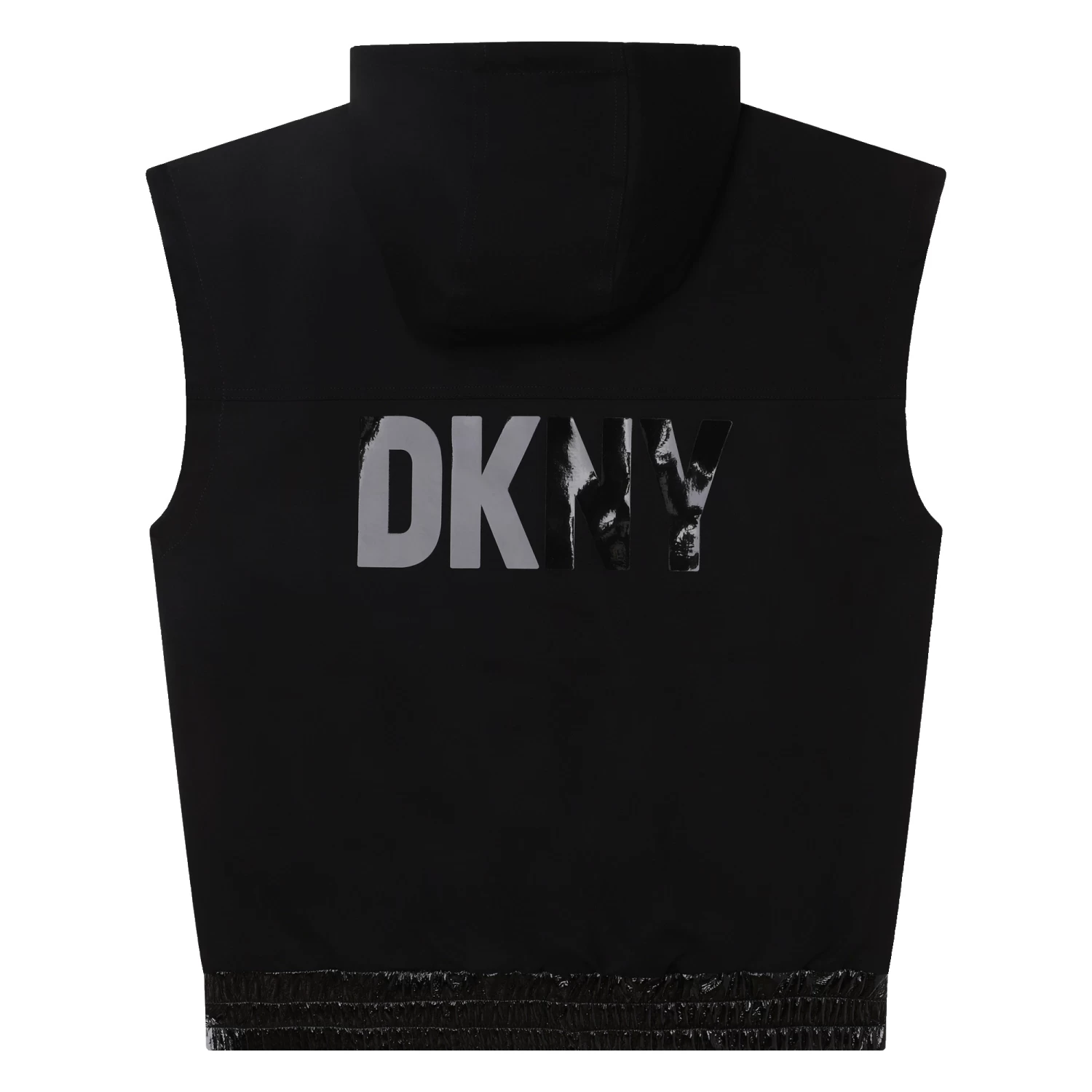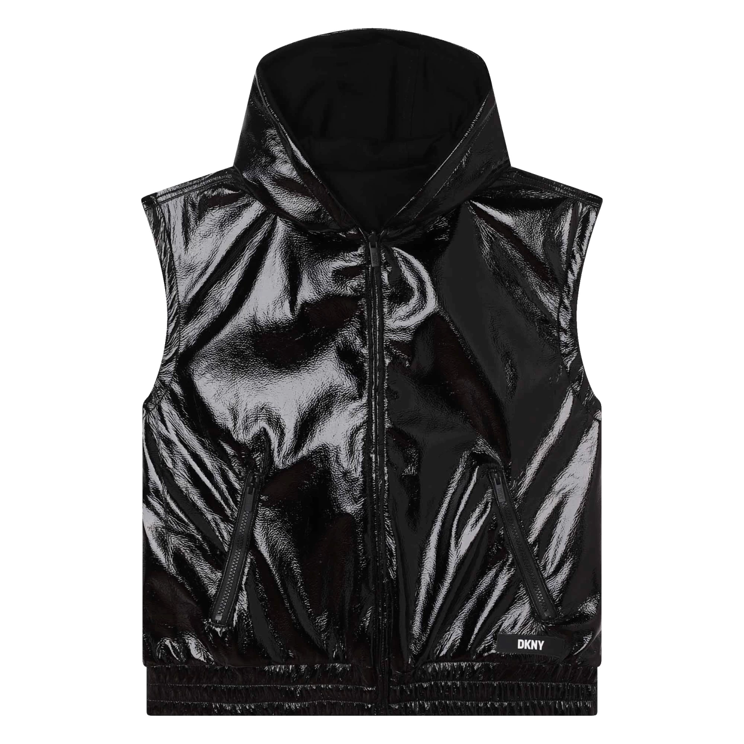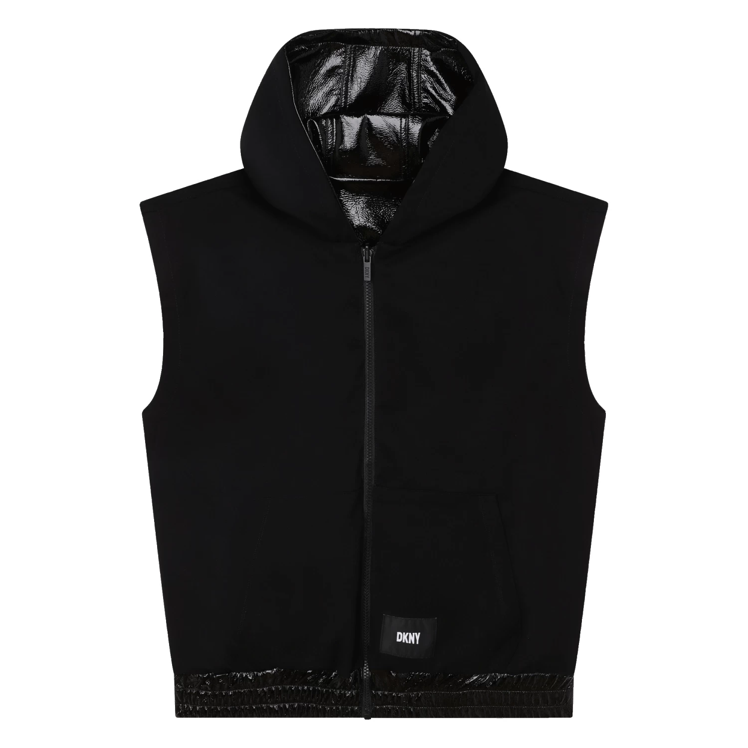 Cette veste sans manche à capuche est réversible, avec un côté brillant. Ce dernier dispose de deux poches zippées sur le devant et d’une étiquette effet gomme dans le bas. L’autre côté est uni et présente un logo DKNY dans le dos.