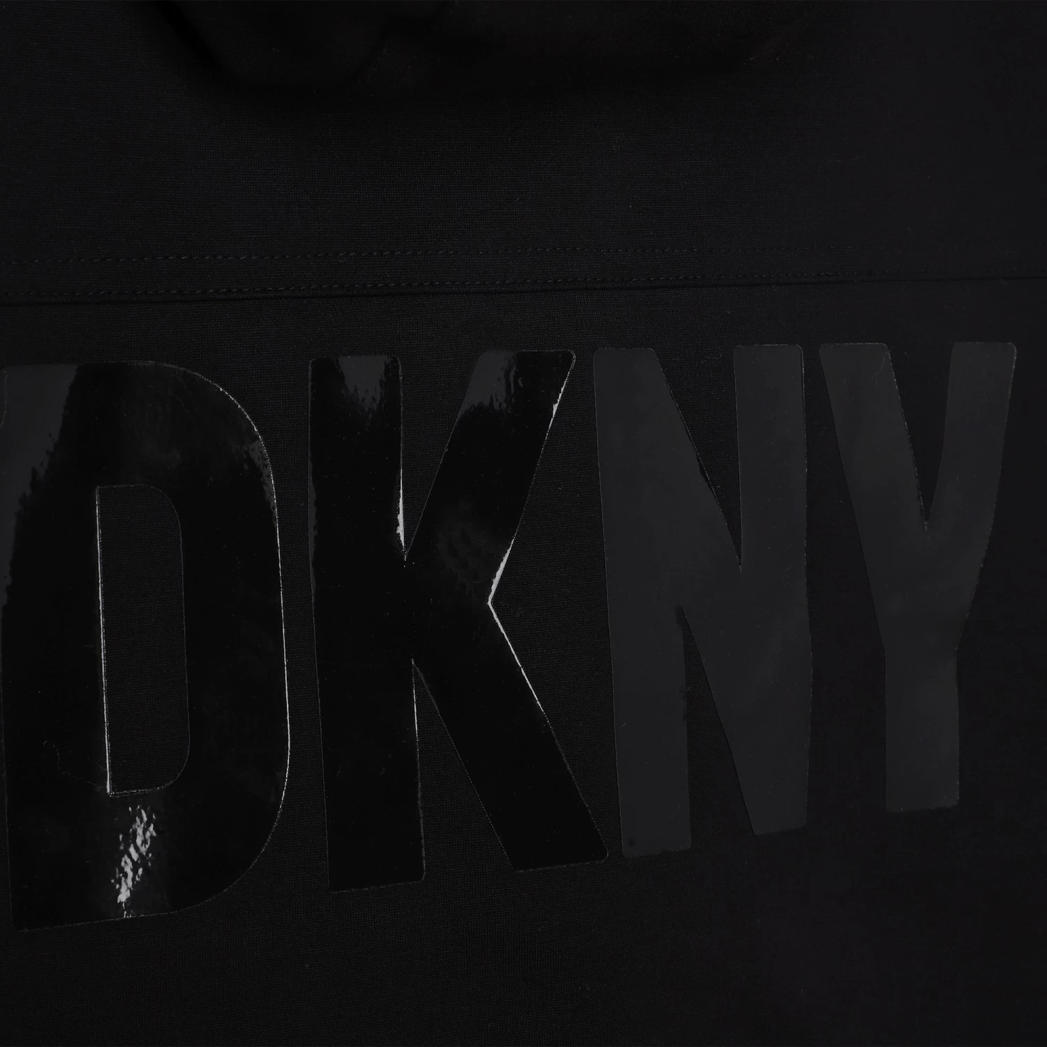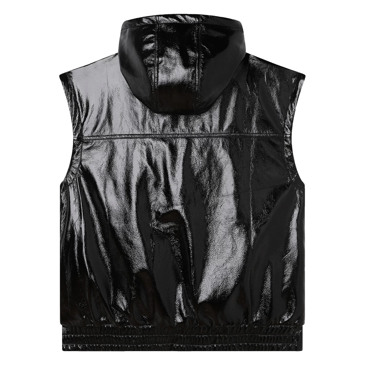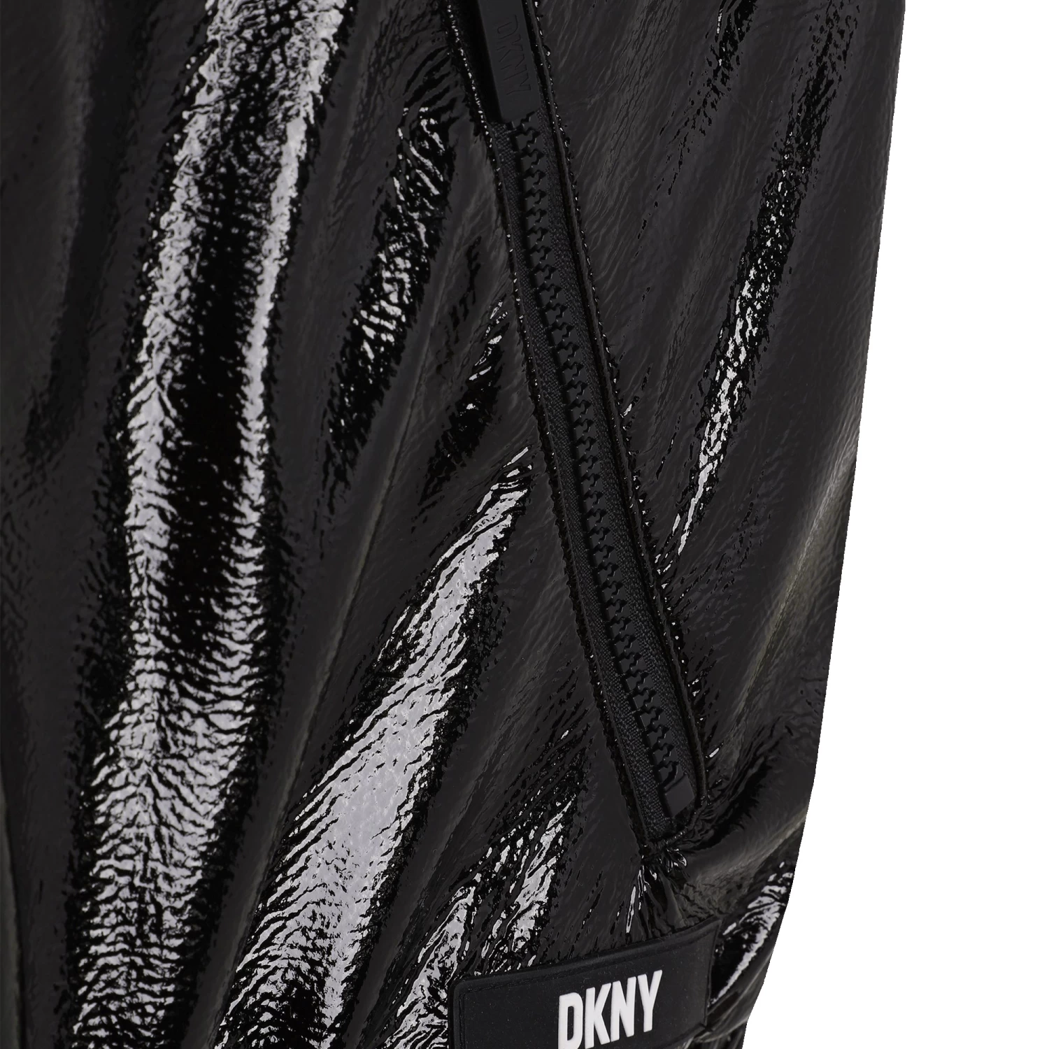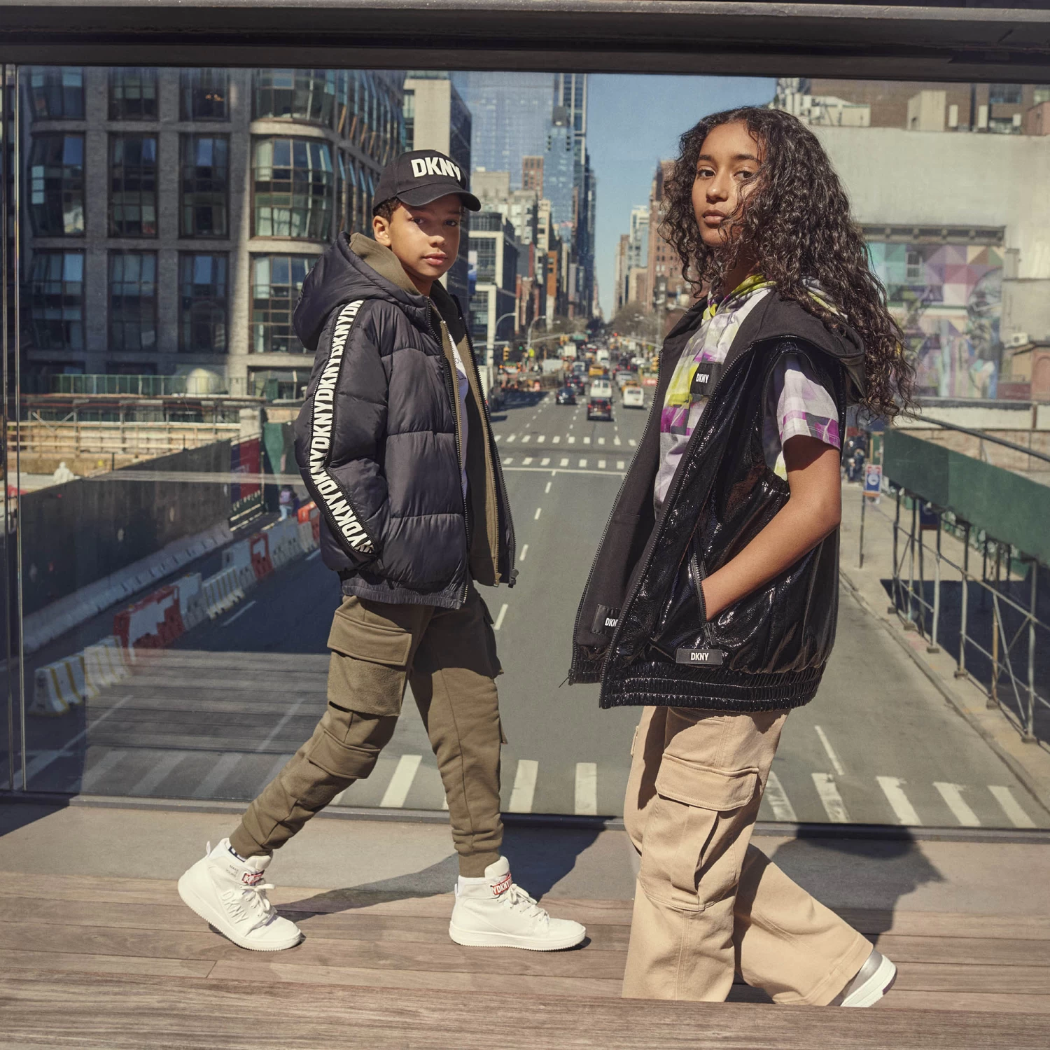 Cette veste sans manche à capuche est réversible, avec un côté brillant. Ce dernier dispose de deux poches zippées sur le devant et d’une étiquette effet gomme dans le bas. L’autre côté est uni et présente un logo DKNY dans le dos.