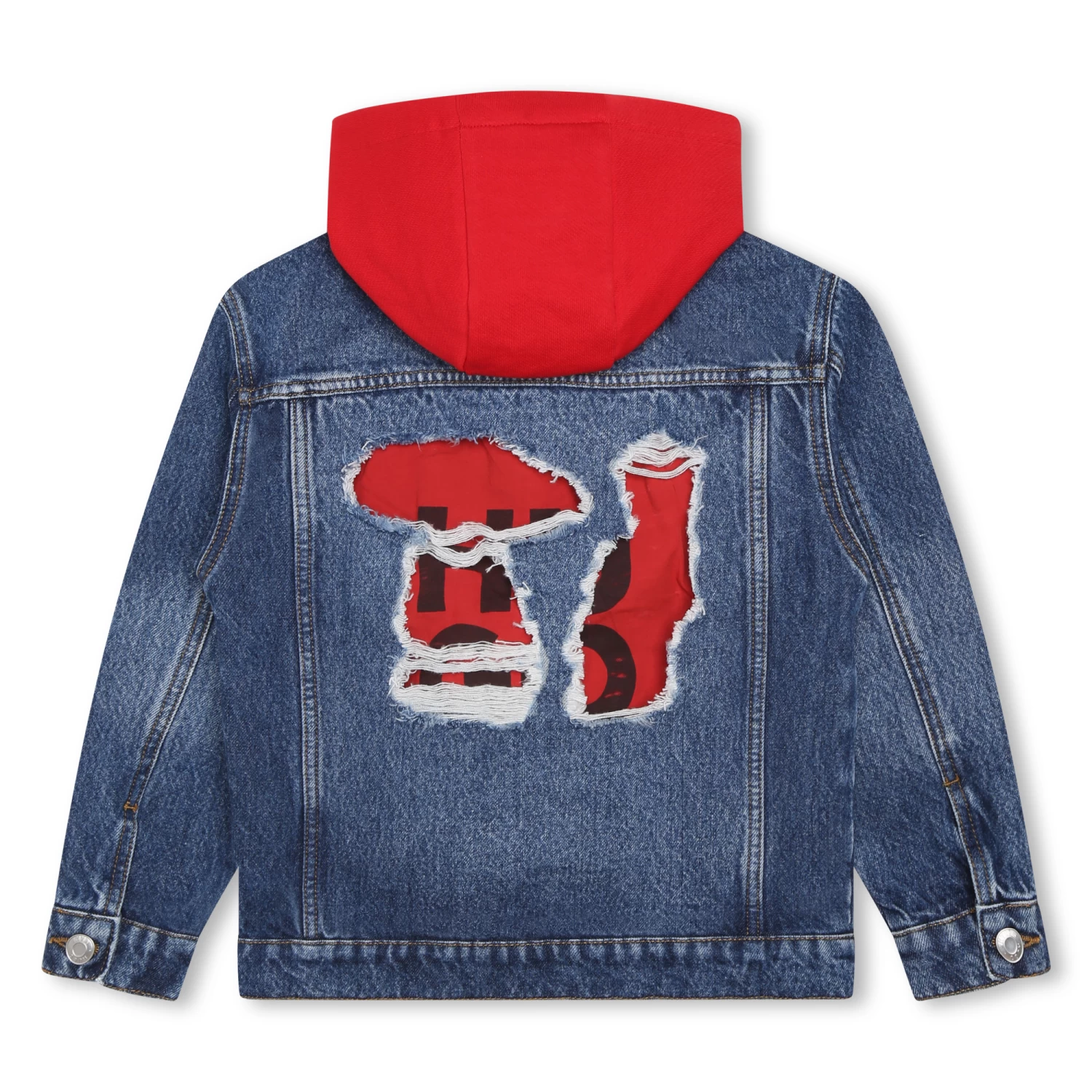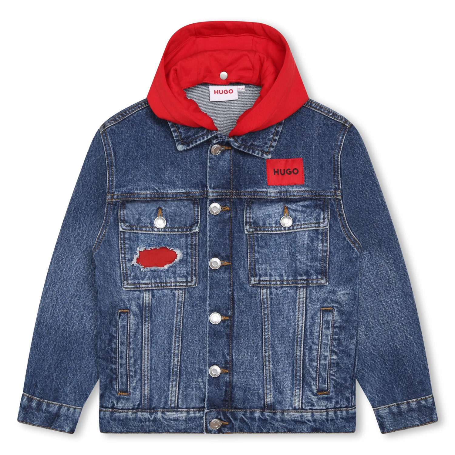 Cette veste HUGO en denim est confectionnĂ©e majoritairement en coton. Elle se distingue par ses dĂ©tails dĂ©chirĂ©s sur les poches et dans le dos, qui laissent apparaitre la doublure imprimĂ©e du logo HUGO. La capuche molletonnĂ©e peut-ĂȘtre retirĂ©e grĂące Ă des pressions.