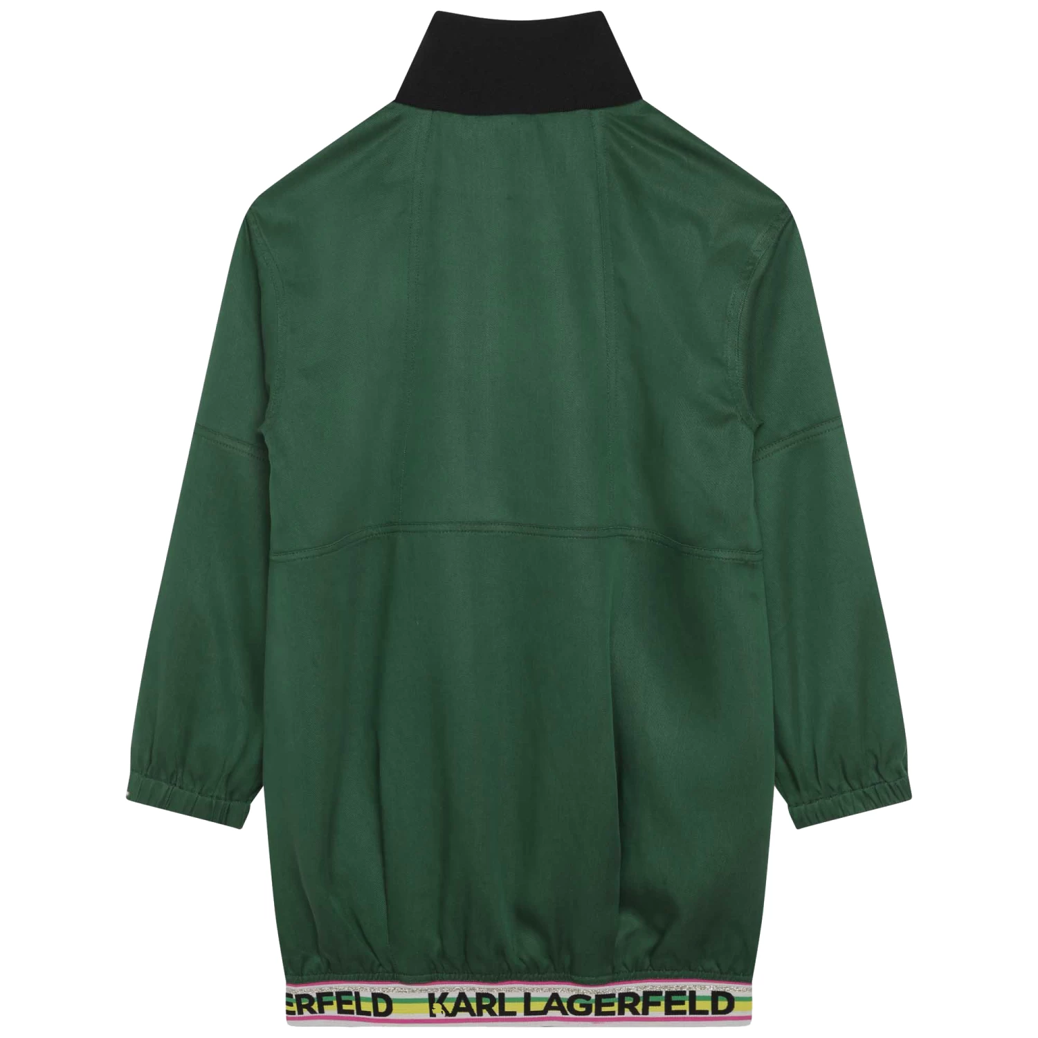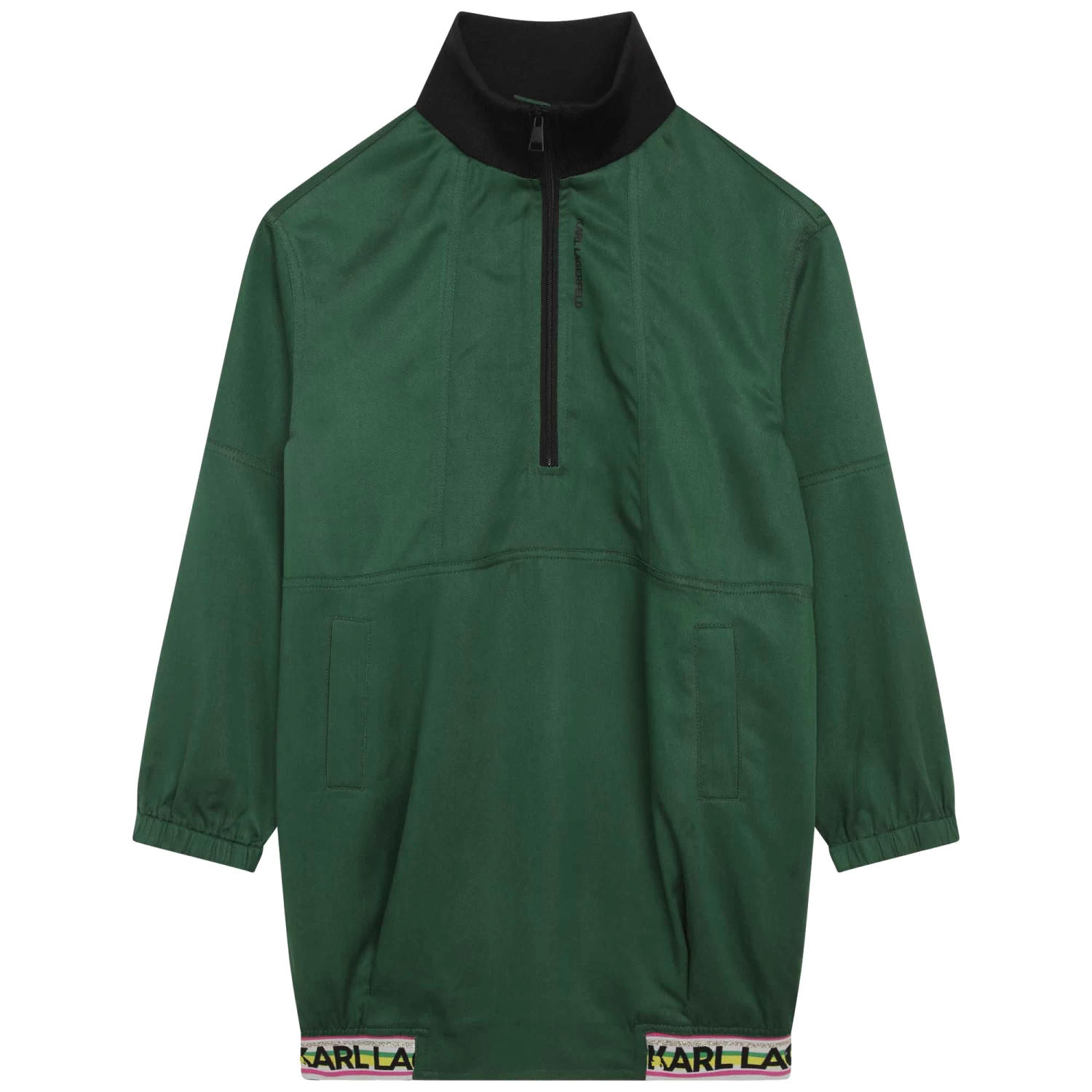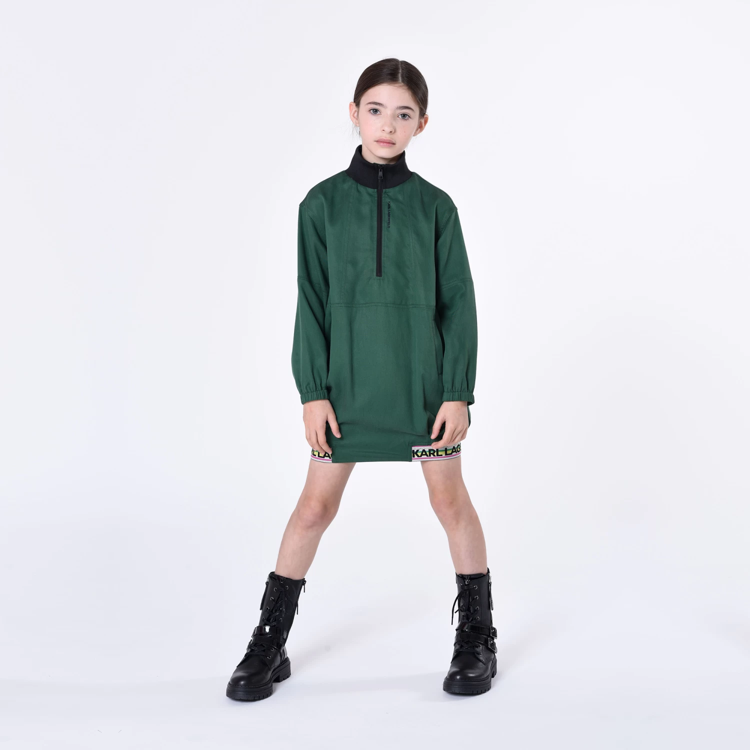 Cette robe sweat-shirt KARL LAGERFELD KIDS est confectionnée en lyocell. Dotée d’un col montant, elle se ferme au moyen d’un zip devant souligné du logo KARL LAGERFELD. Une bande élastiquée logotée KARL LAGERFELD en jacquard multicolore resserre délicatement la base.