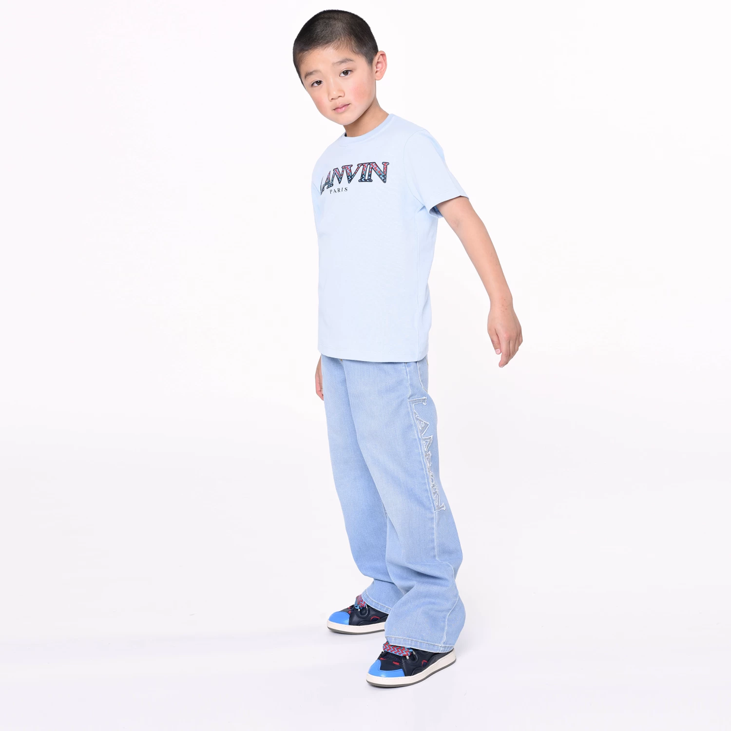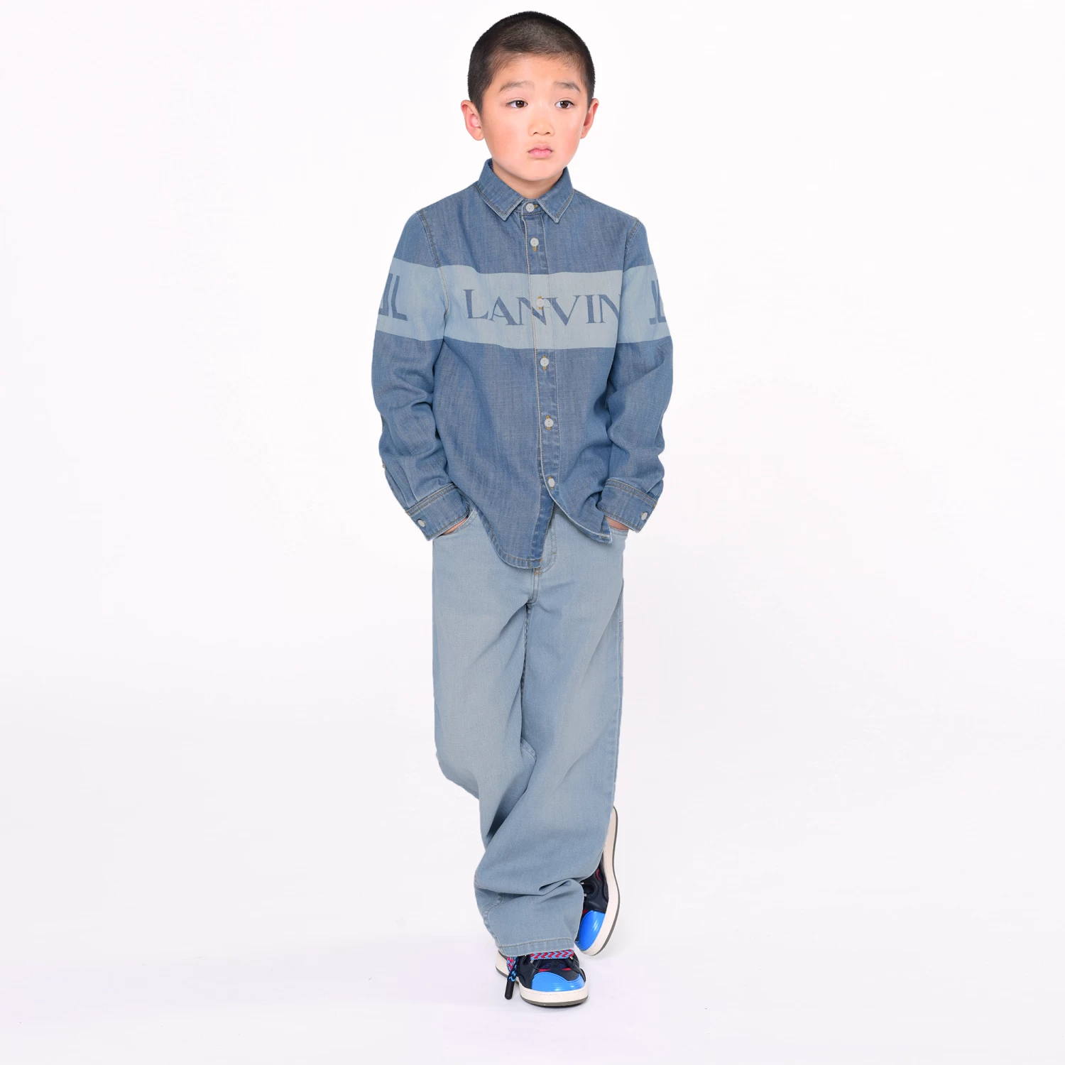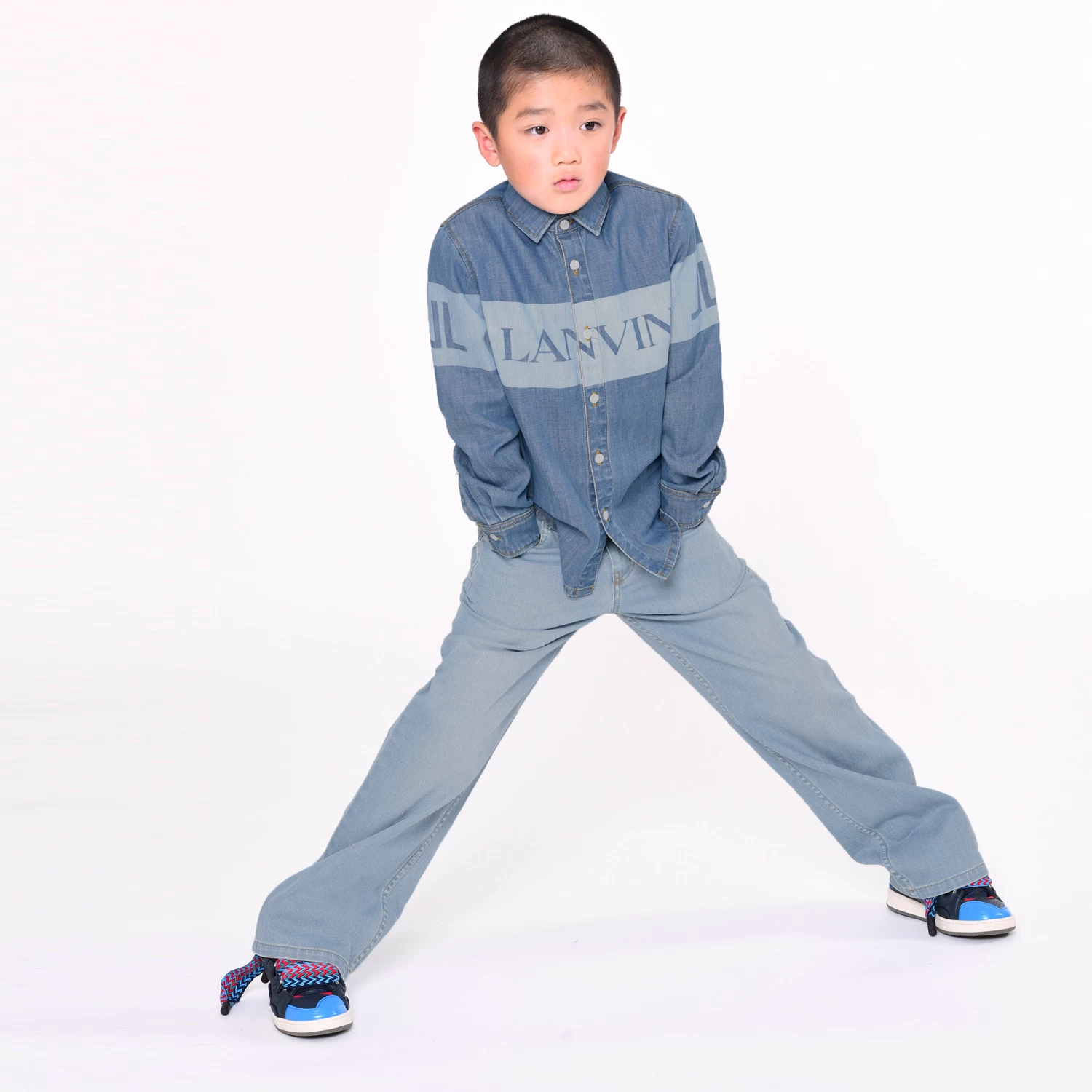 Ce jean Lanvin est confectionné en coton et élasthanne. Le dos de la taille à passants arbore un jacron siglé Lanvin. Le côté d’une jambe affiche le logo Lanvin en lettres découpées et effilochées. Des surpiqûres décorent les poches au dos.
