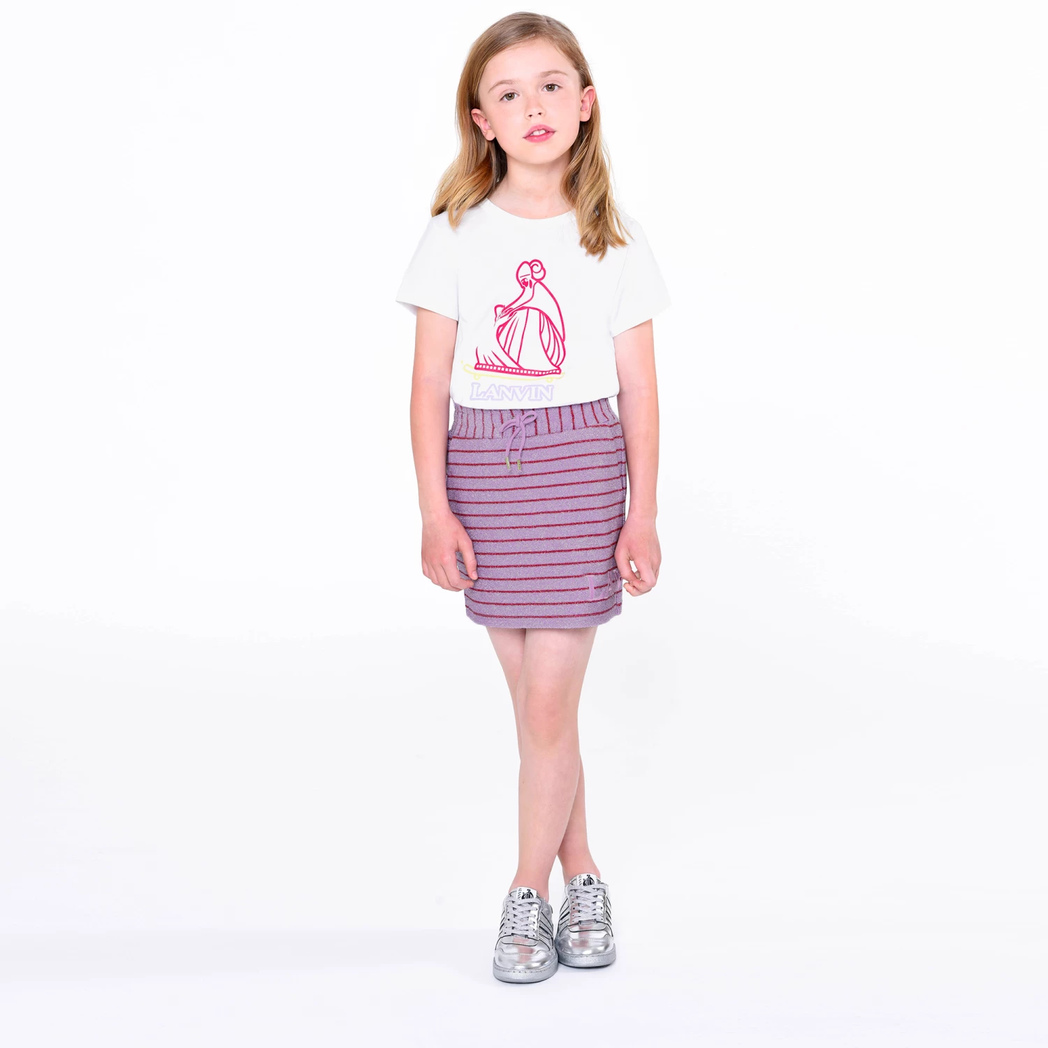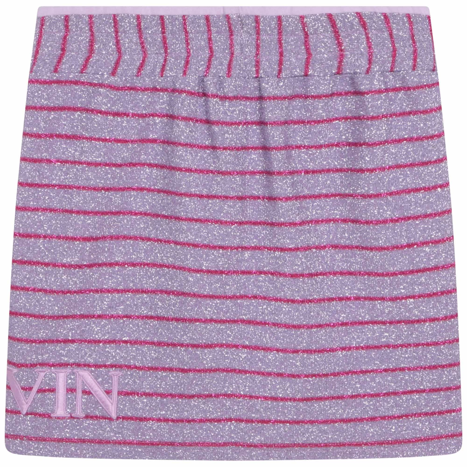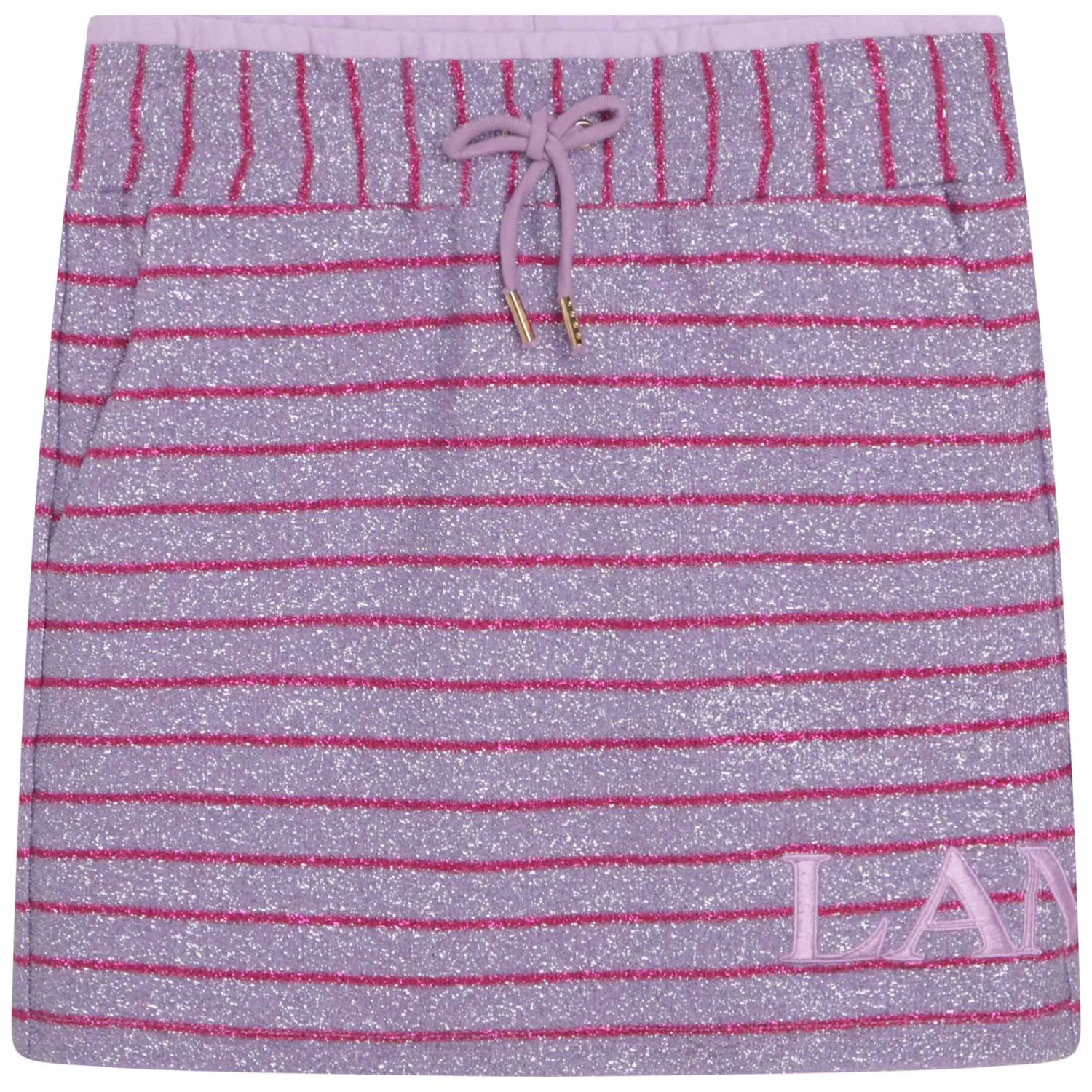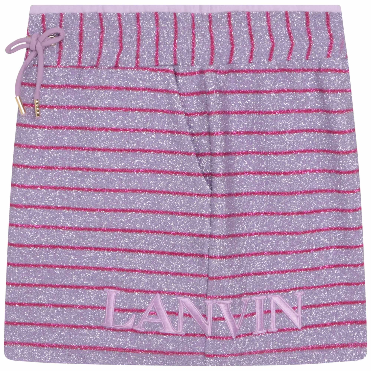Cette jupe tube molletonnée est réalisée dans un tissu métallisé à rayures. Doté de poches italiennes, ce modèle affiche le sigle Lanvin en lettres badgées brodées sur le côté. La taille élastiquée est secondée par un cordon à nouer devant.