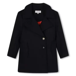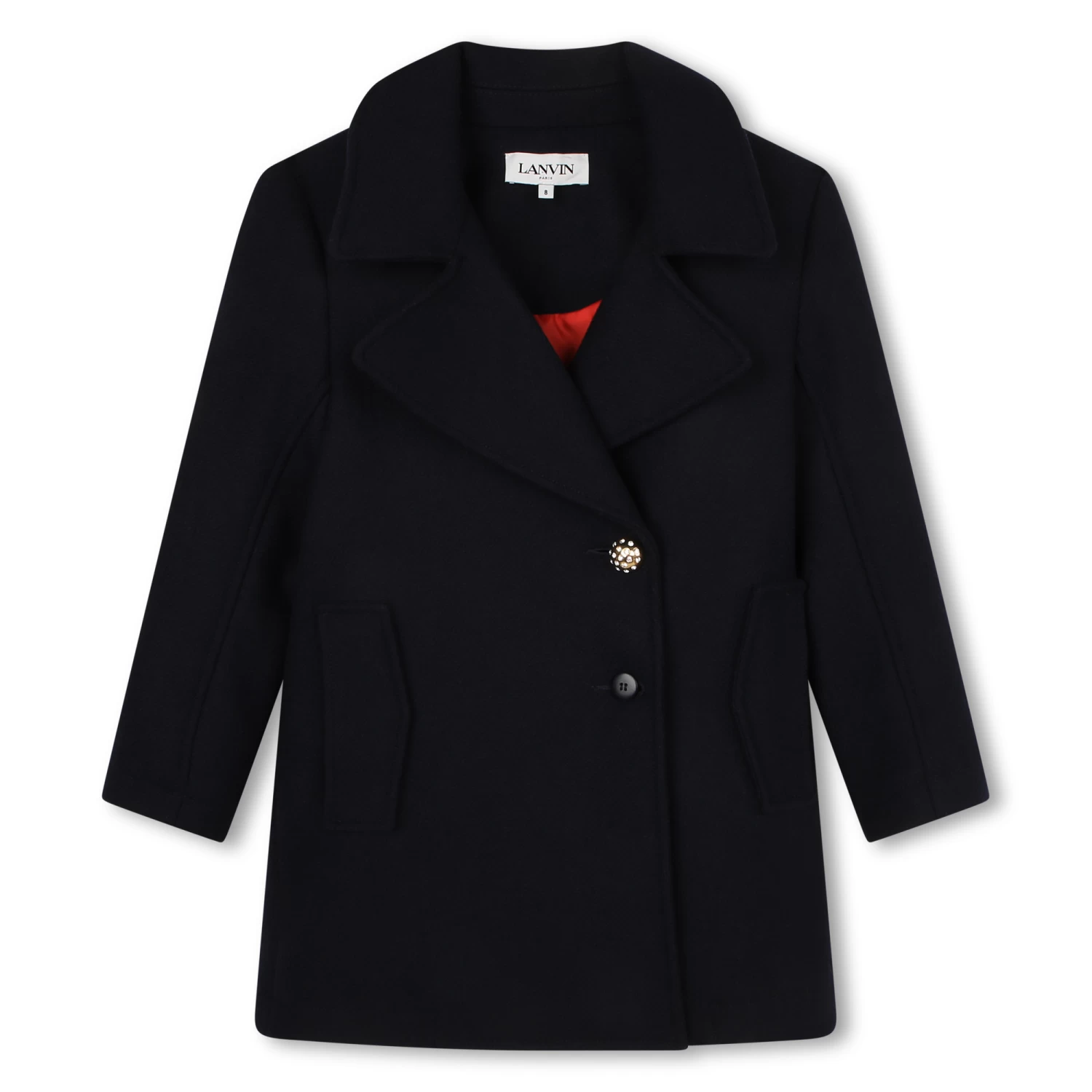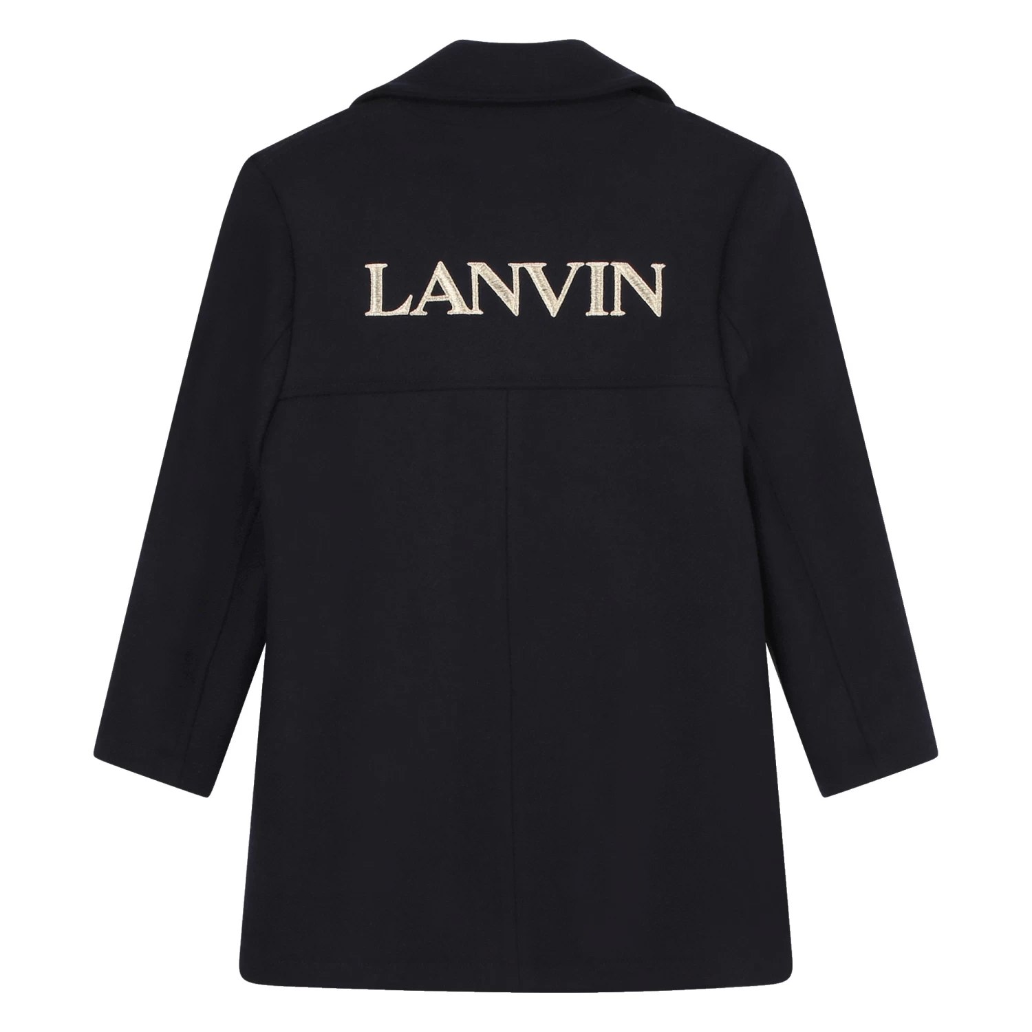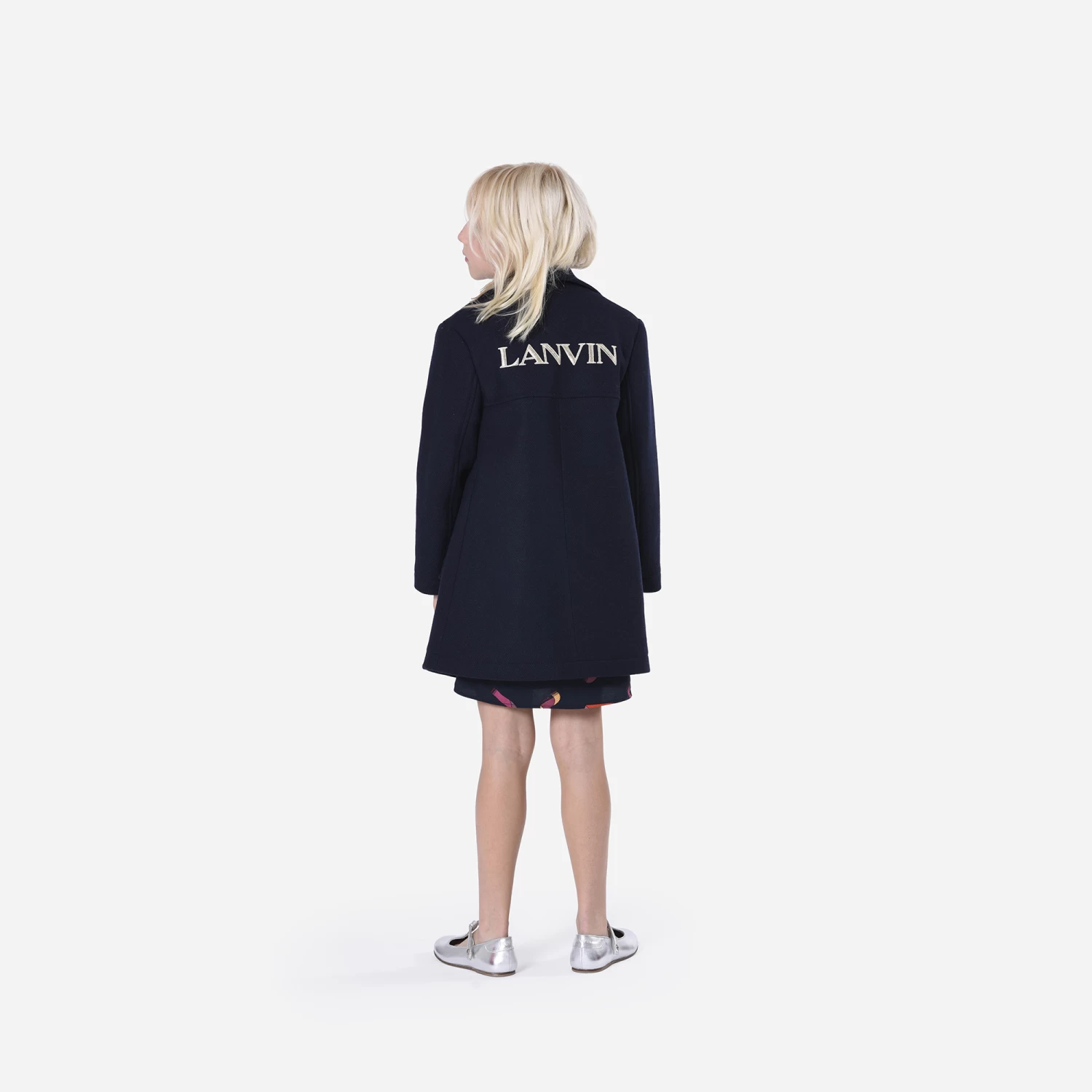 Confectionné en drap de laine, ce manteau Lanvin est un indispensable pour se protéger du froid. Élégant et intemporel, il se ferme à l’aide d’un unique bouton sur le devant, un détail inspiré de la collection adulte. Une broderie Lanvin iconique est présente au dos.
