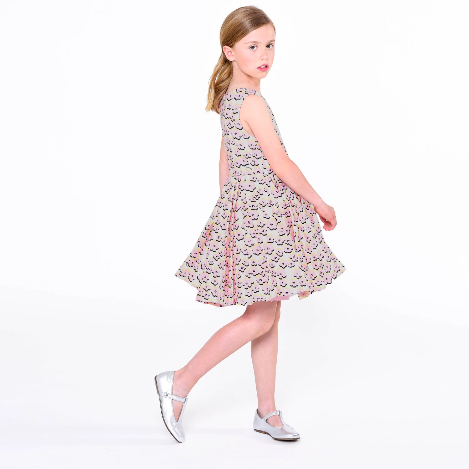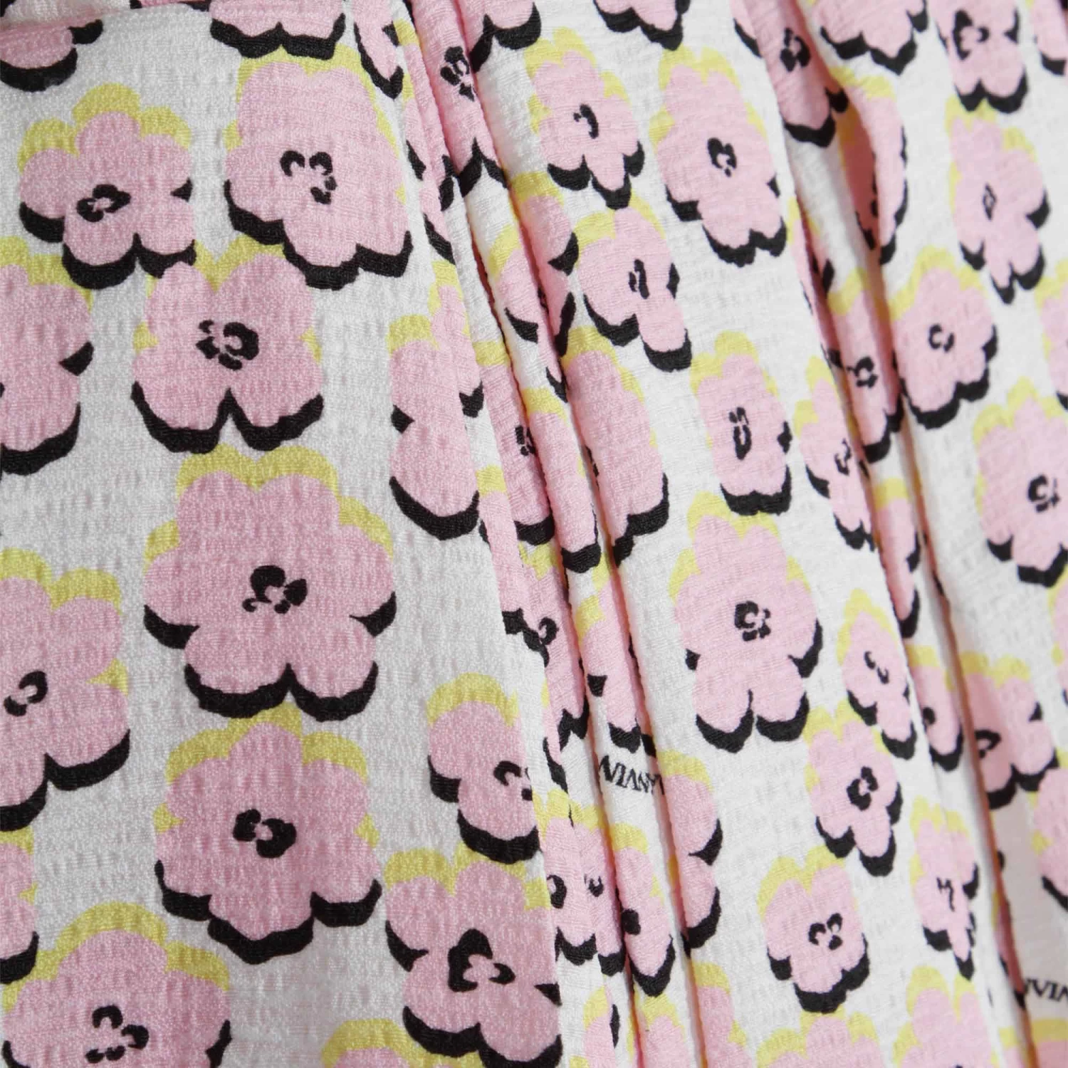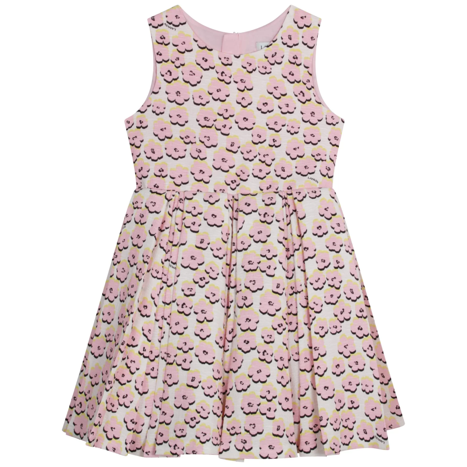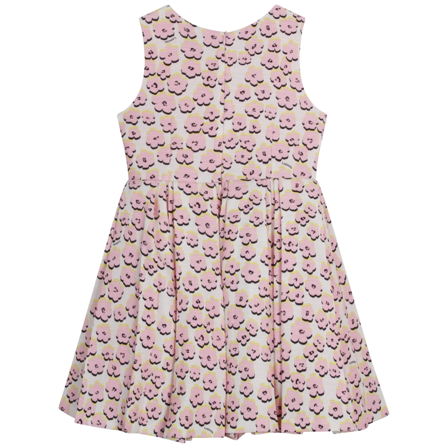 Cette robe de cérémonie Lanvin est inspirée de la collection adulte. Une glissière invisible la ferme au dos. Confectionné en tissu gaufré, ce modèle sans manche arbore un imprimé marguerite multicolore. Des plis renforcent l’évasé de la jupe.