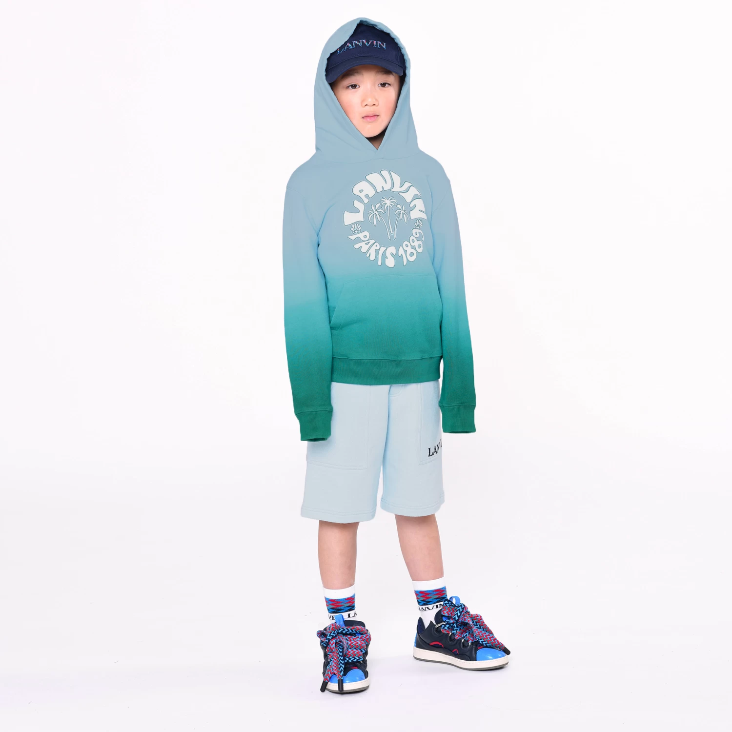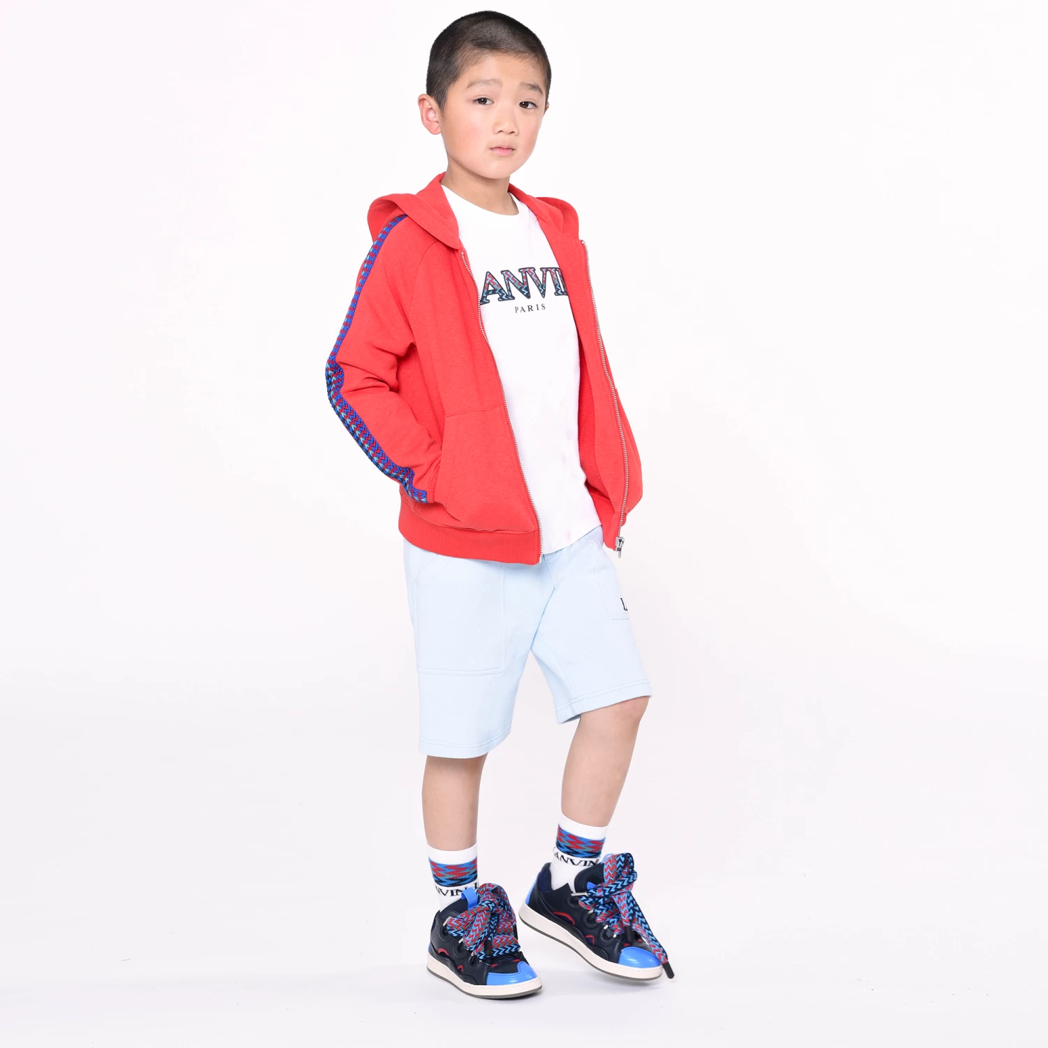 Ce short molletonné Lanvin est confectionné en 100 % coton issu de l’agriculture biologique. Une broderie contrastée au nom de la marque orne une des poches plaquées devant. Un cordon tissé de zigzags multicolores permet d’ajuster la taille élastiquée.