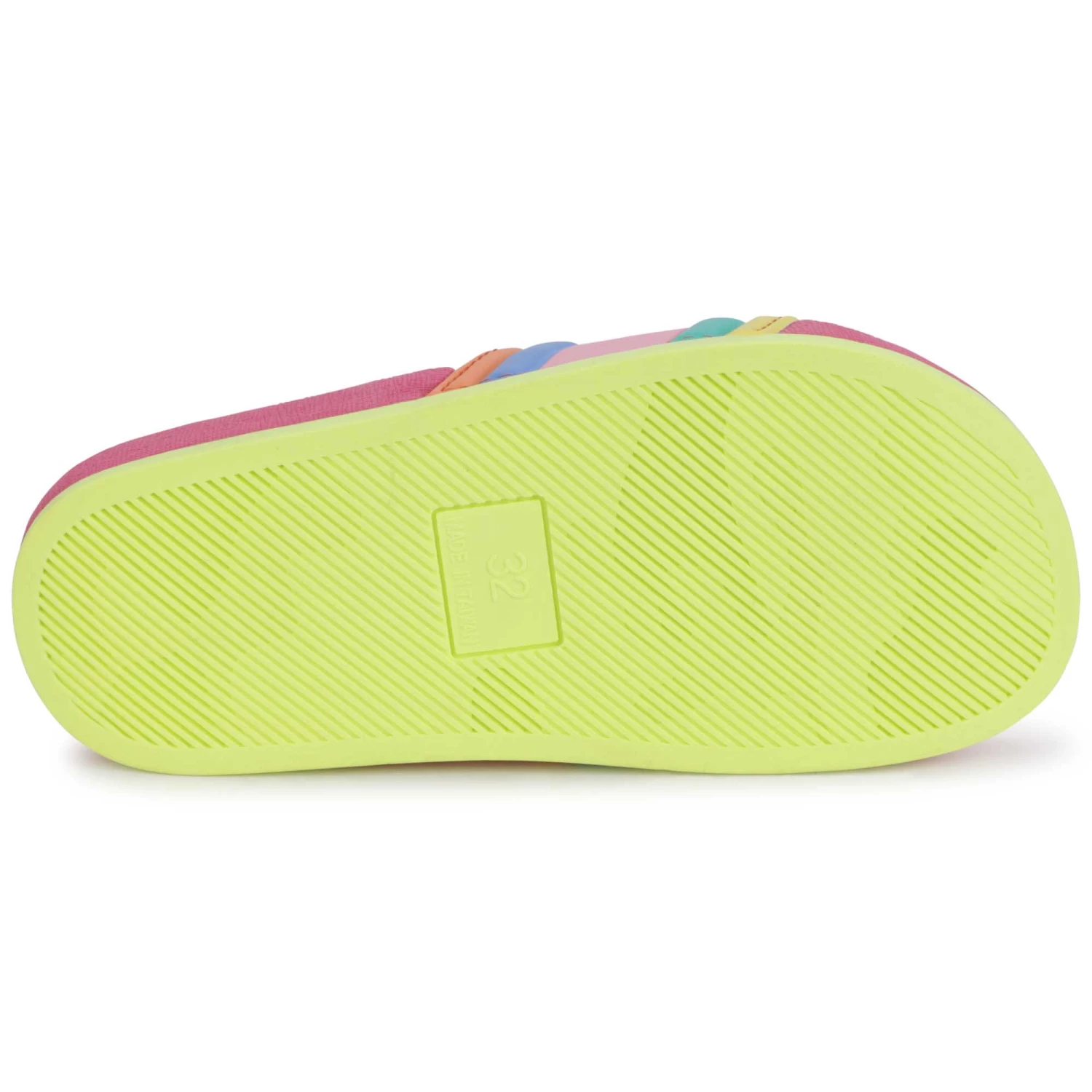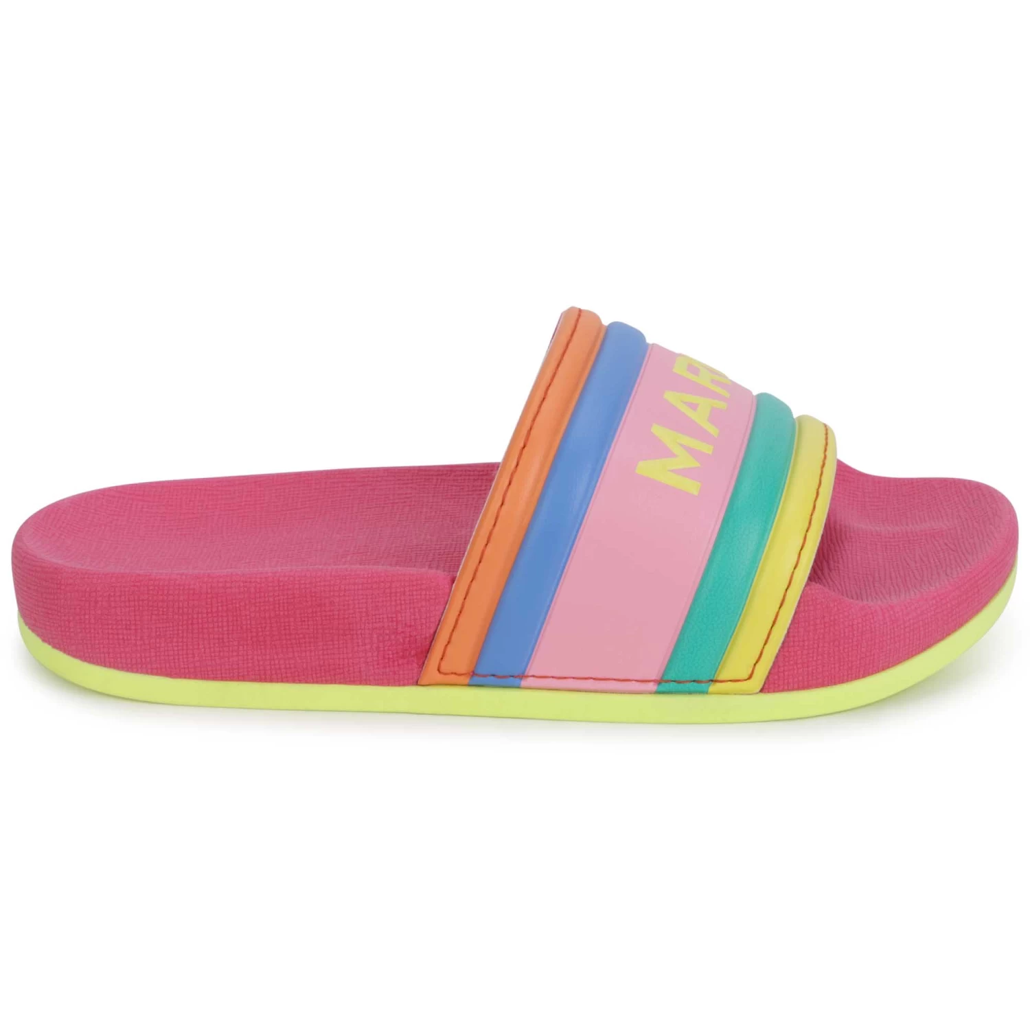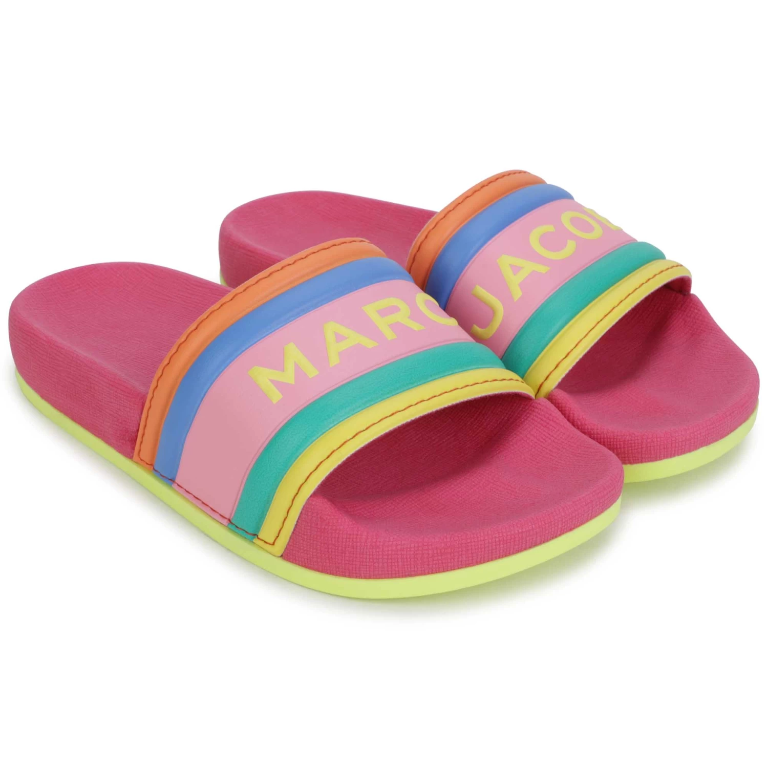 Indispensables dans le vestiaire de l’été, ces claquettes Marc Jacobs séduisent avec leur design multicolore fluo. Ce modèle se caractérise par une illustration MARC sur le pied droit et JACOBS sur le pied gauche.
