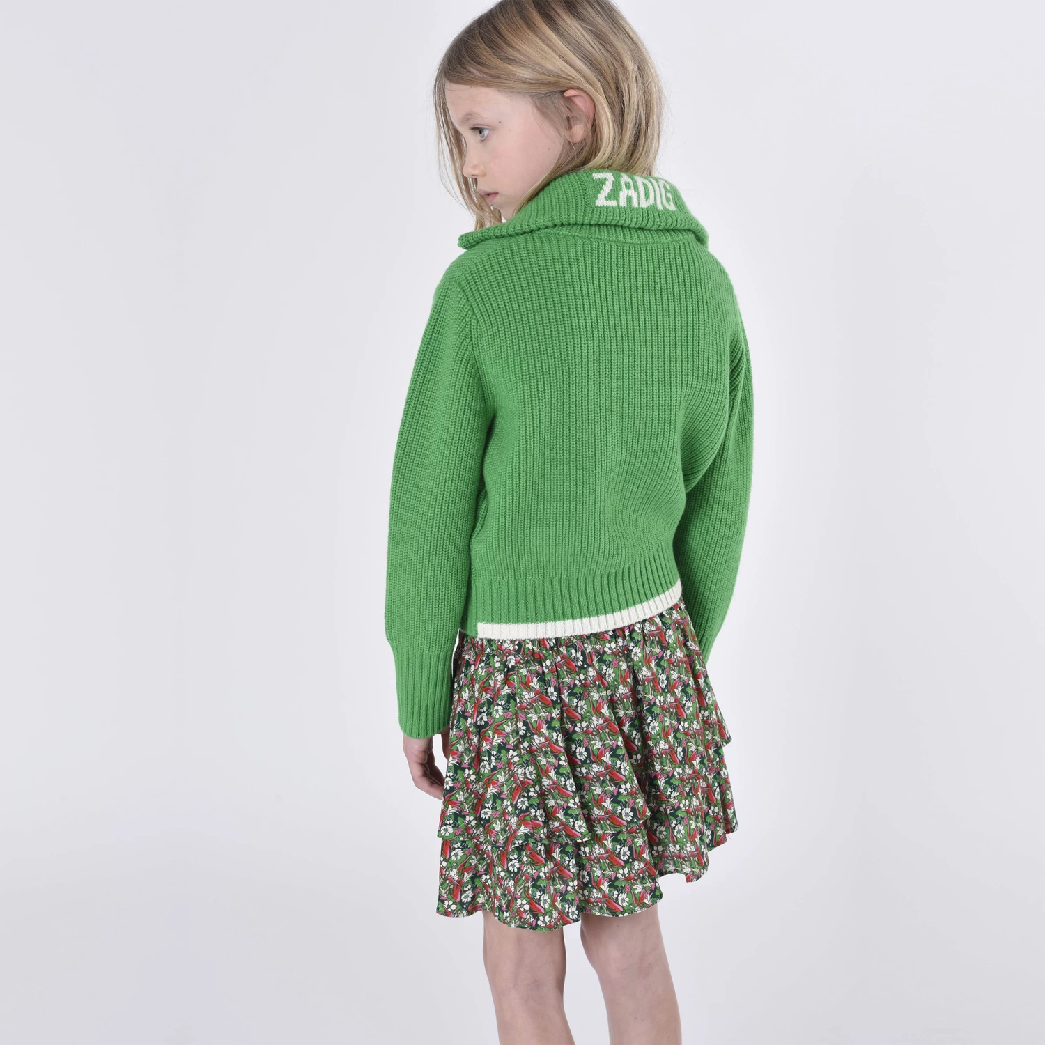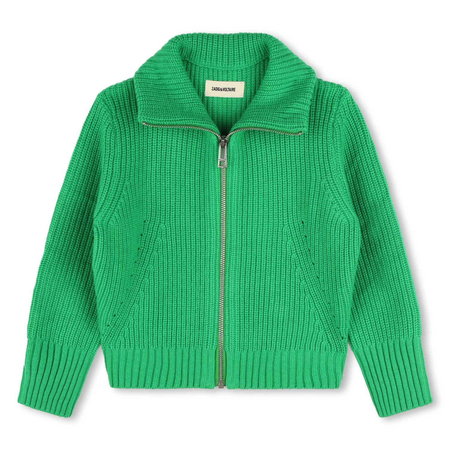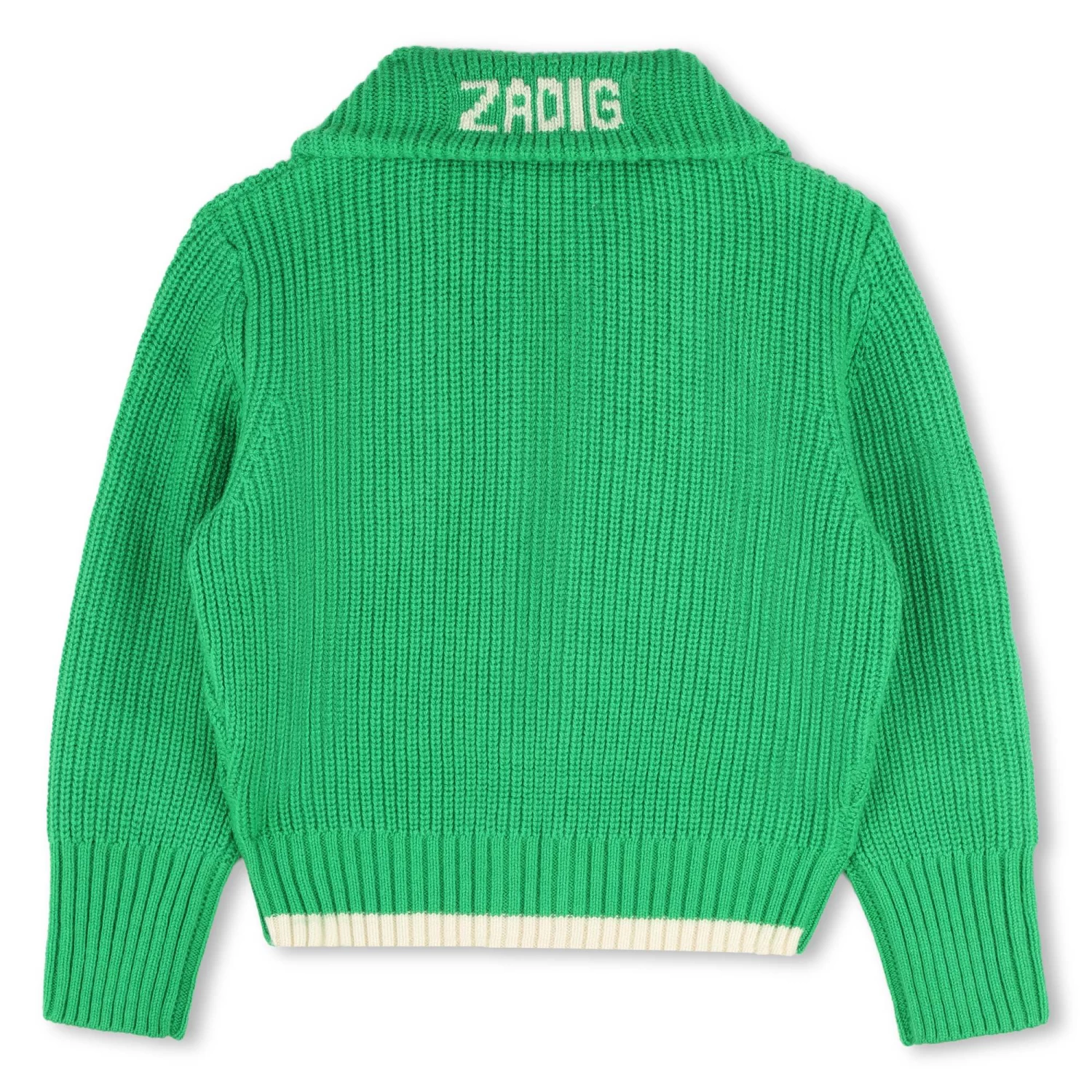 Ce cardigan Zadig & Voltaire inspiré de la collection adulte est confectionné à 65 % en laine. Fermé par un zip, il affiche un encart jacquard siglé Zadig au dos du col. Des points ajourés devant apportent de la fantaisie sur le tricot uni.