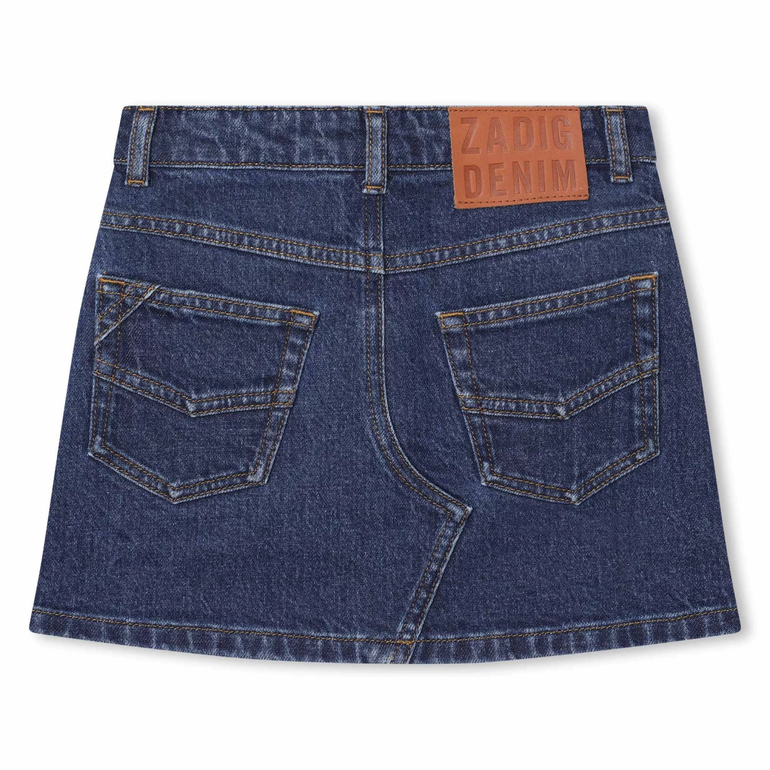 InspirĂ©e de la marque adulte, cette jupe en jean Zadig & Voltaire est confectionnĂ©e en denim extensible. Du cuir de vache au tannage minĂ©ral constitue le jacron embossĂ© Zadig Denim au dos de la ceinture Ă passants. Contient des parties non textiles d’origine animale.