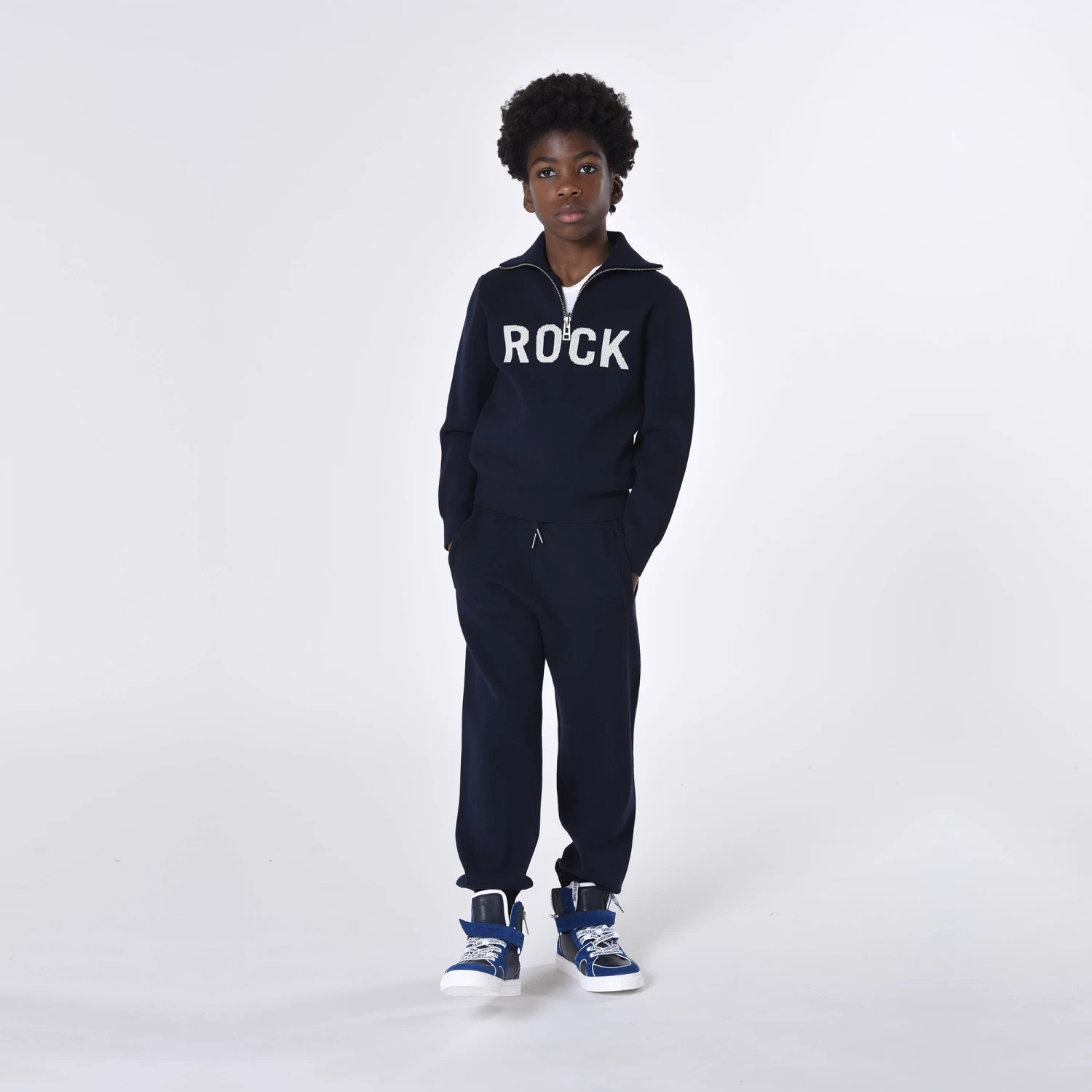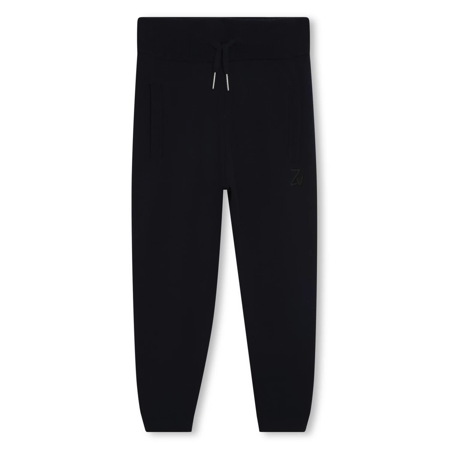 Ce pantalon en tricot prĂ©sente une taille ajustable avec un lien de serrage ton sur ton, afin de s’adapter Ă toutes les morphologies. Il est dotĂ© de poches sur les cĂŽtĂ©s. Le logo Zadig & Voltaire est brodĂ© sur la jambe.