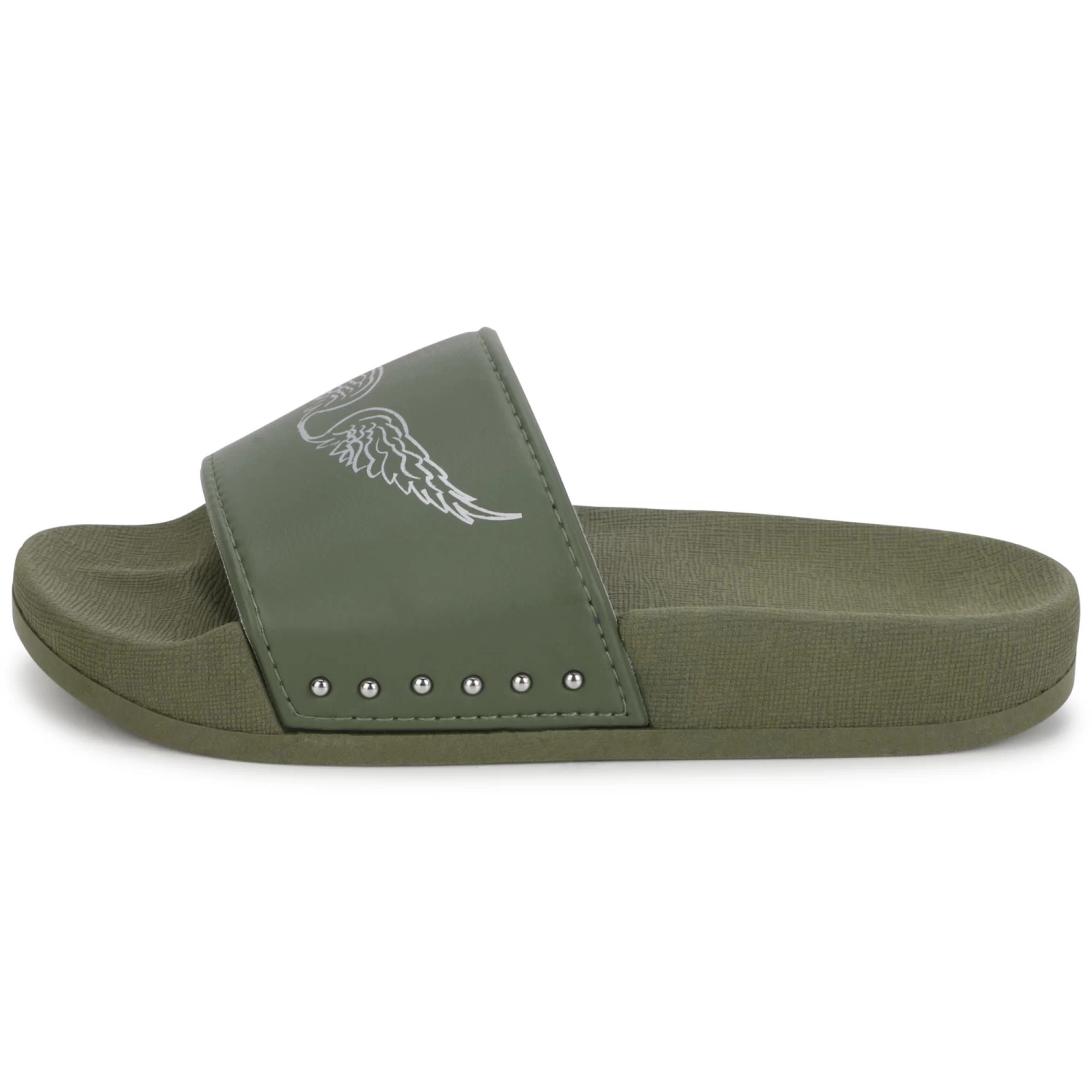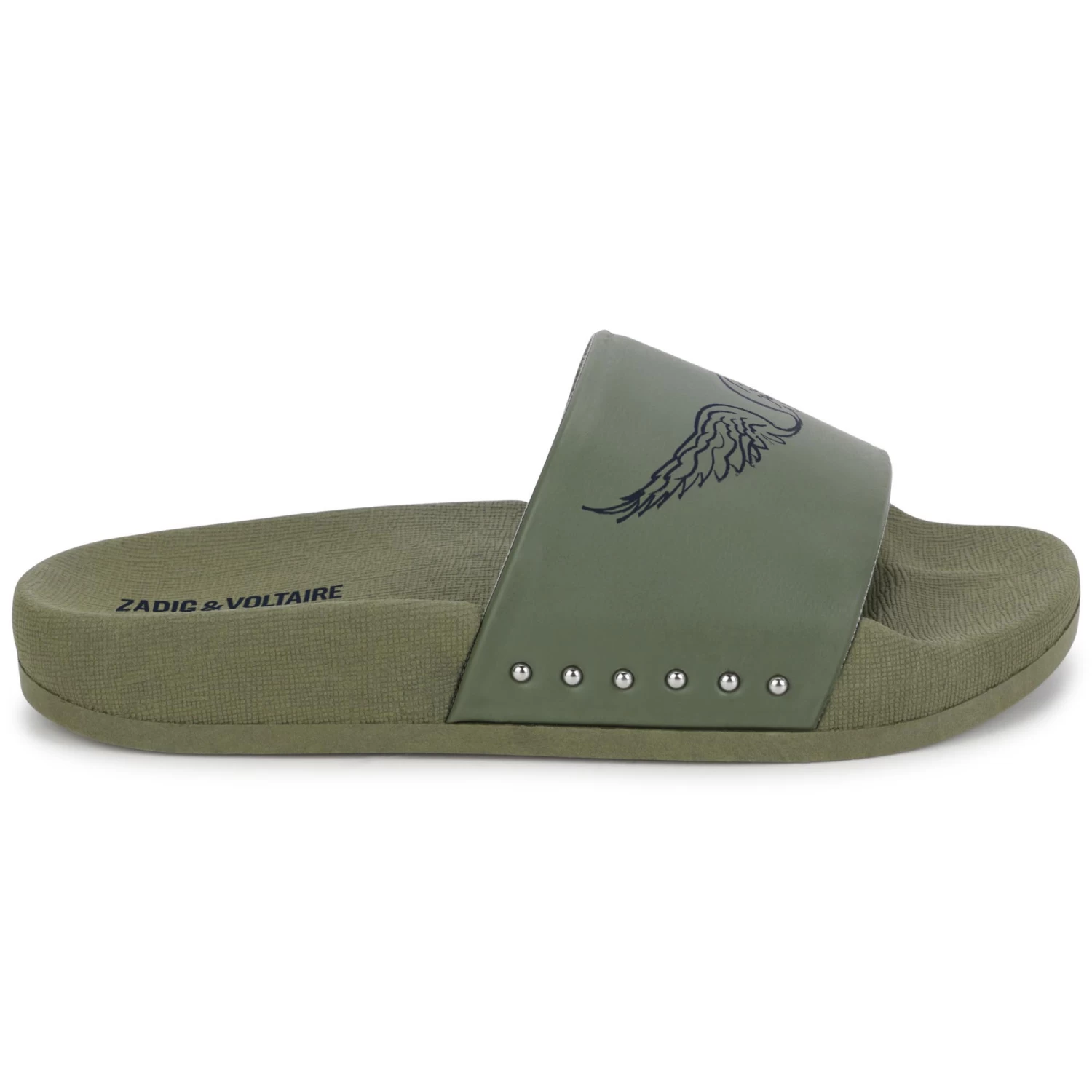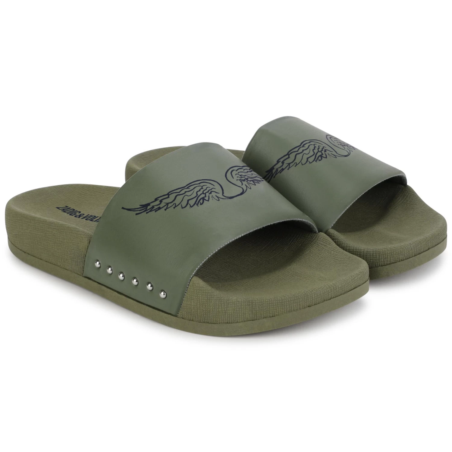Ornées d’ailes à l’aspect métallique, ces tongs kaki Zadig & Voltaire sont idéales pour allier style et confort à la plage ou au bord de la piscine. Les côtés de la bride sont rehaussés de clous décoratifs.