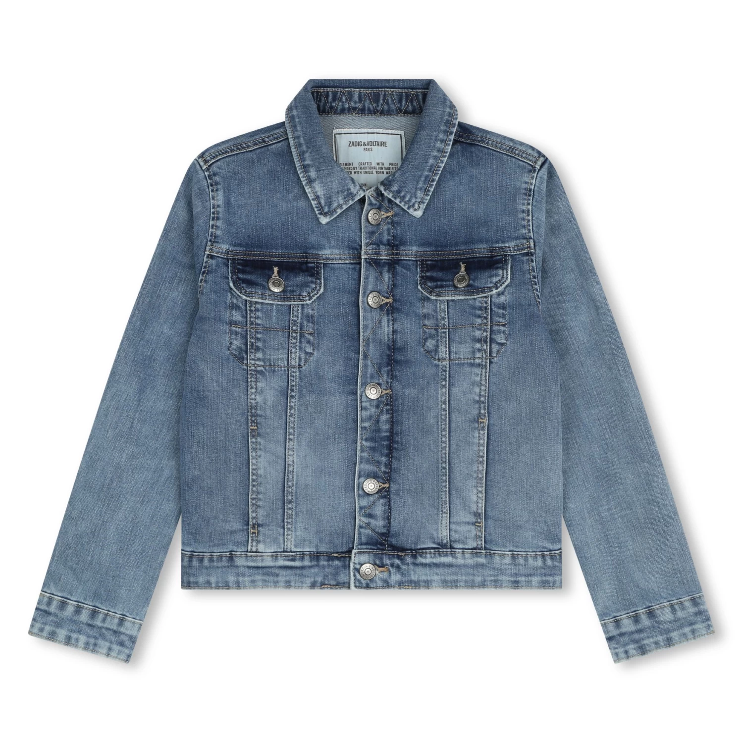 Cette veste en jean extensible Zadig & Voltaire est confectionnée en coton. Le dos arbore un imprimé multicolore. En cuir de vache, le jacron embossé Zadig & Voltaire orne la base au dos. Contient des parties non textiles d’origine animale.